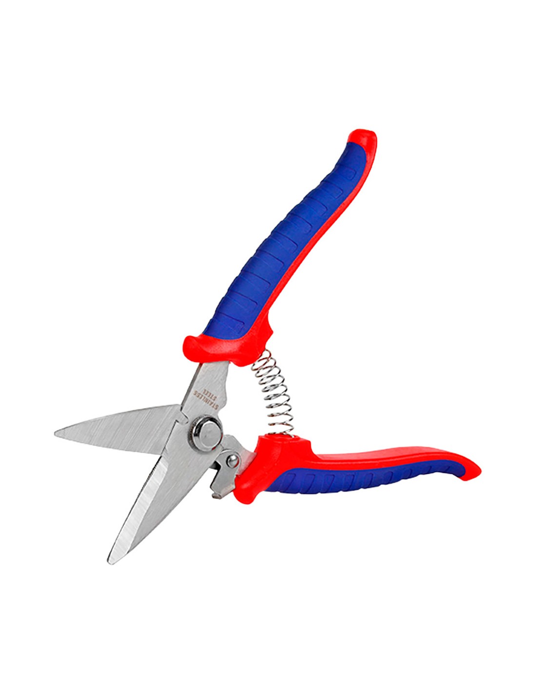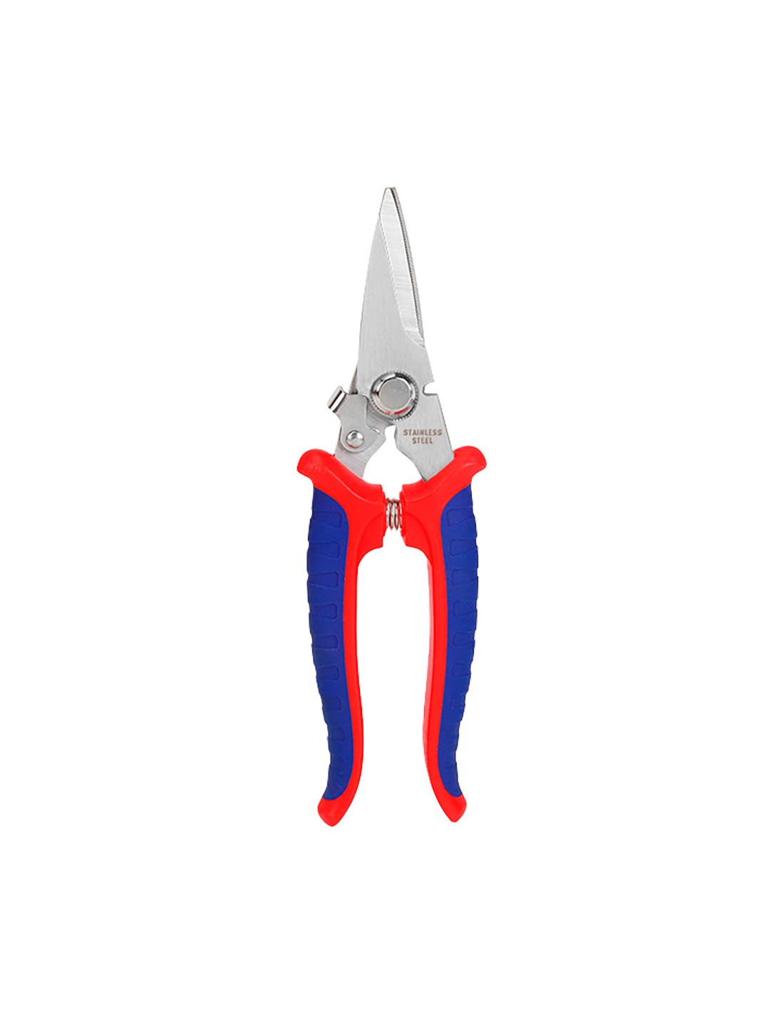 Tijera multifunción 180 mm hojas de acero inoxidable con filo serrado antideslizante ranura pelacables mango bimaterial de goma