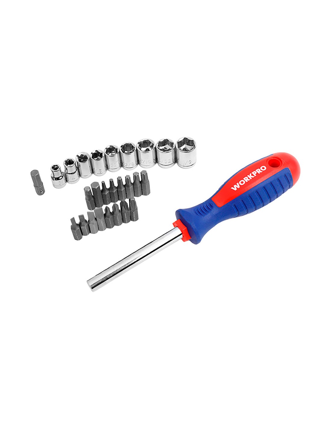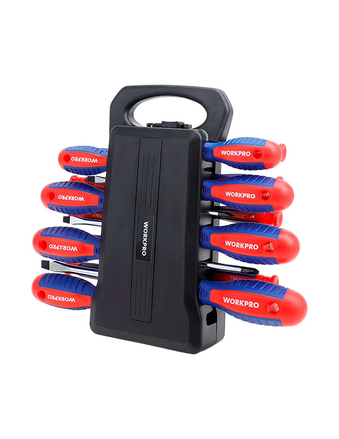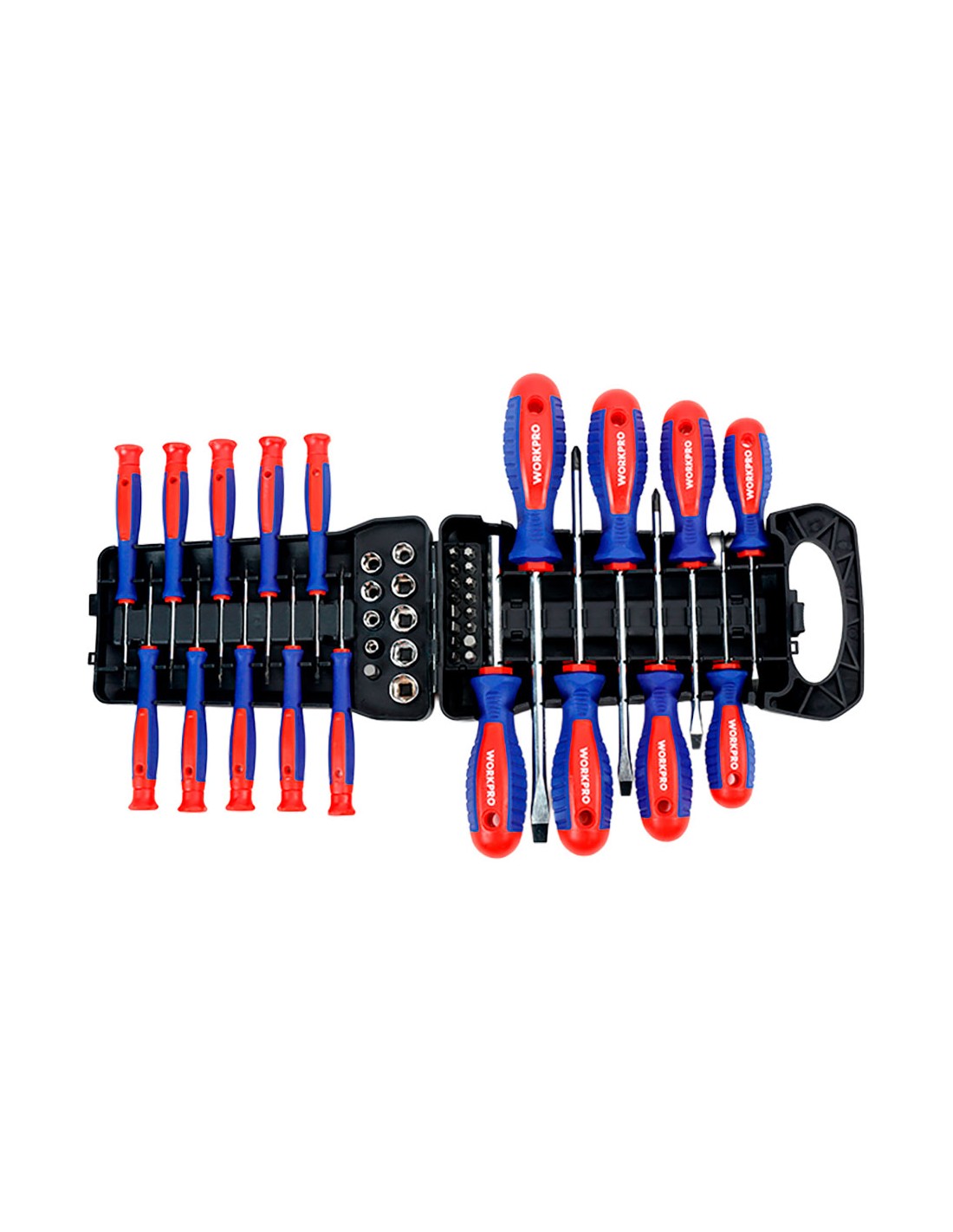 Juego 45 destornilladores magnéticos, acero al cromo vanadio, con soporte. 7 destornilladores: 3.5 x 75, 5.5 x 100, 6.5 x 125, 8 x 150, ph0 x 75, ph1 x 100, ph2 x 125 1 soporte puntas y vasos 1 adaptador para vasos y 9 vasos: 5, 6, 7, 8, 9, 10, 11, 12, 13 mm. 10 destornilladores de precisión: t5, t6, t7, t8, t9, t10, ph00, ph0, 2.5, 3 16 puntas: 3, 4, 5, 6, ph0, ph1, ph2, ph3, h5, h6, t10, t15, t20, t25, t27, t30 azul y rojo