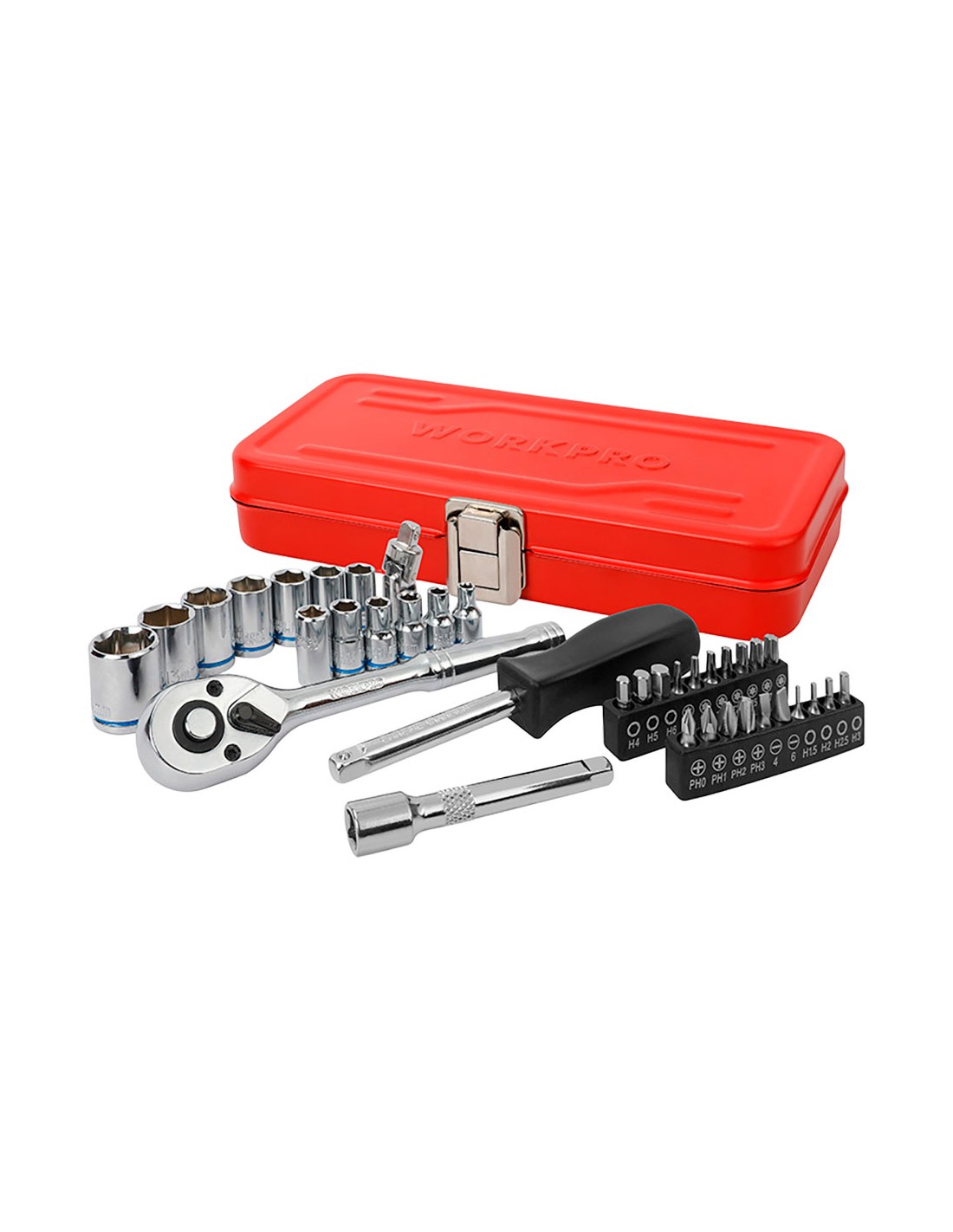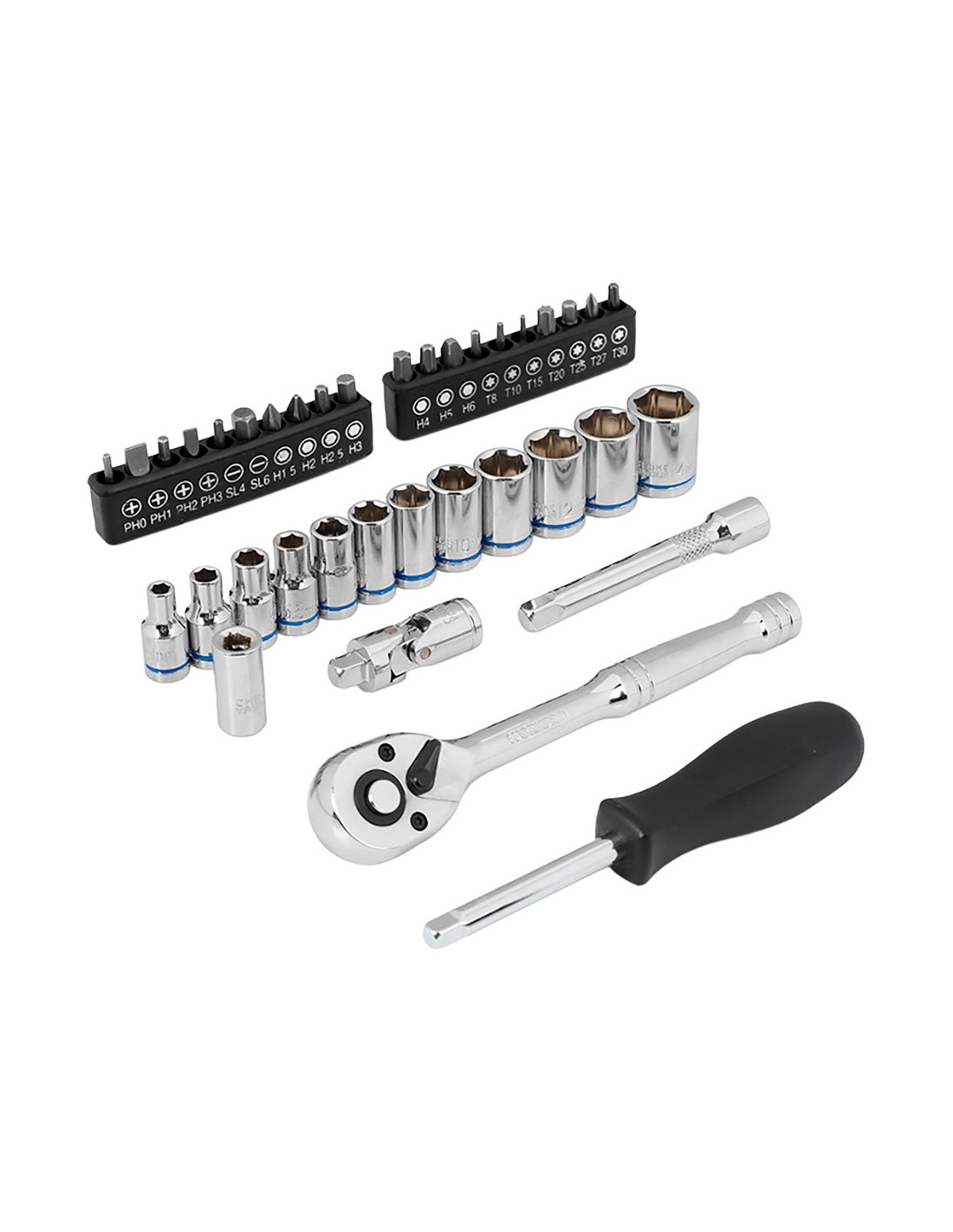 Juego carraca ¼ pulg, 37 piezas 1 carraca cambio rápido 72 dientes 1 alargador, 1 barra extensión 75 mm, 1 cardán, 1 mango giratorio, 12 vasos 4, 5, 5.5, 6, 7, 8, 9, 10, 11, 12, 13, 14 mm 20 puntas destornillador