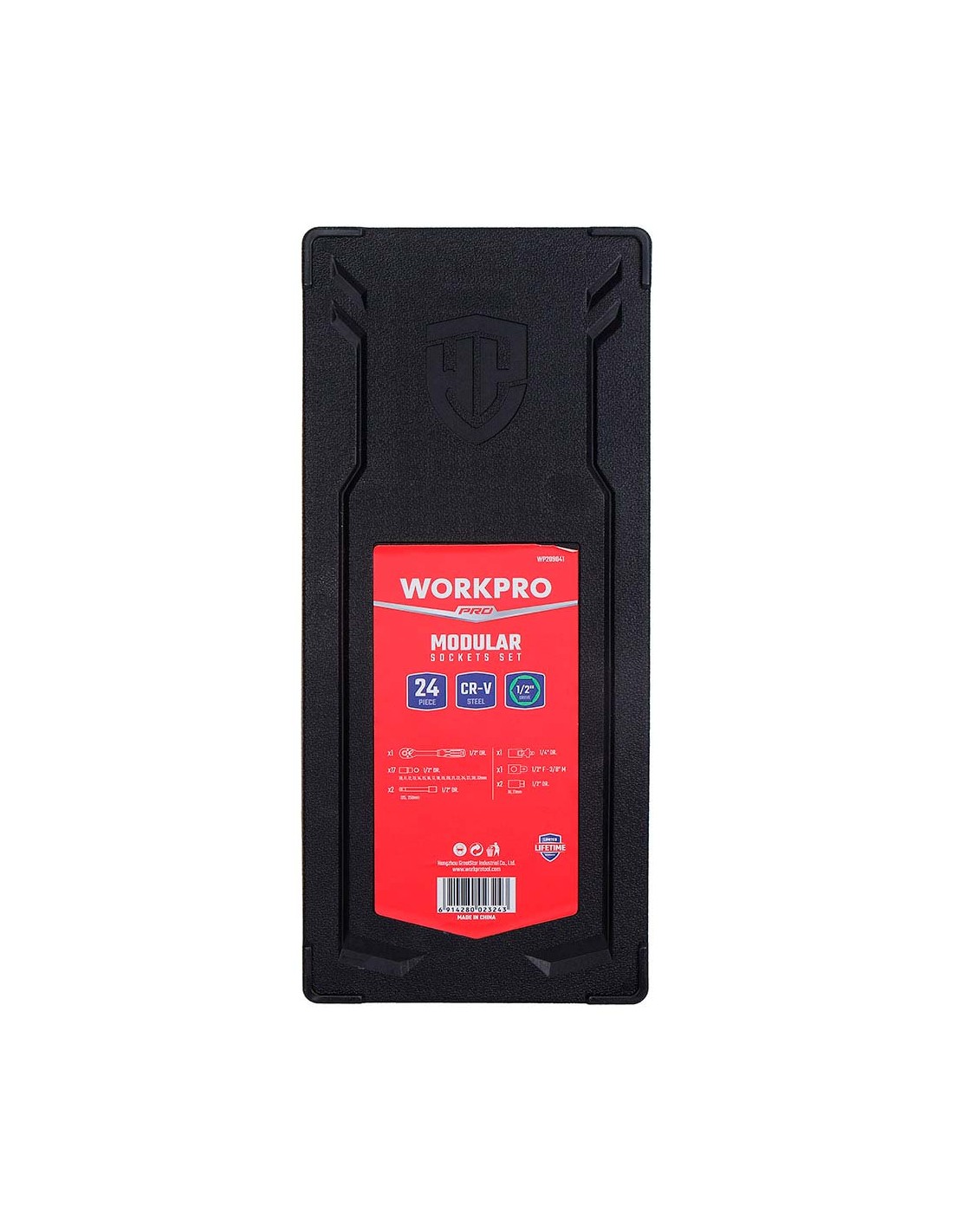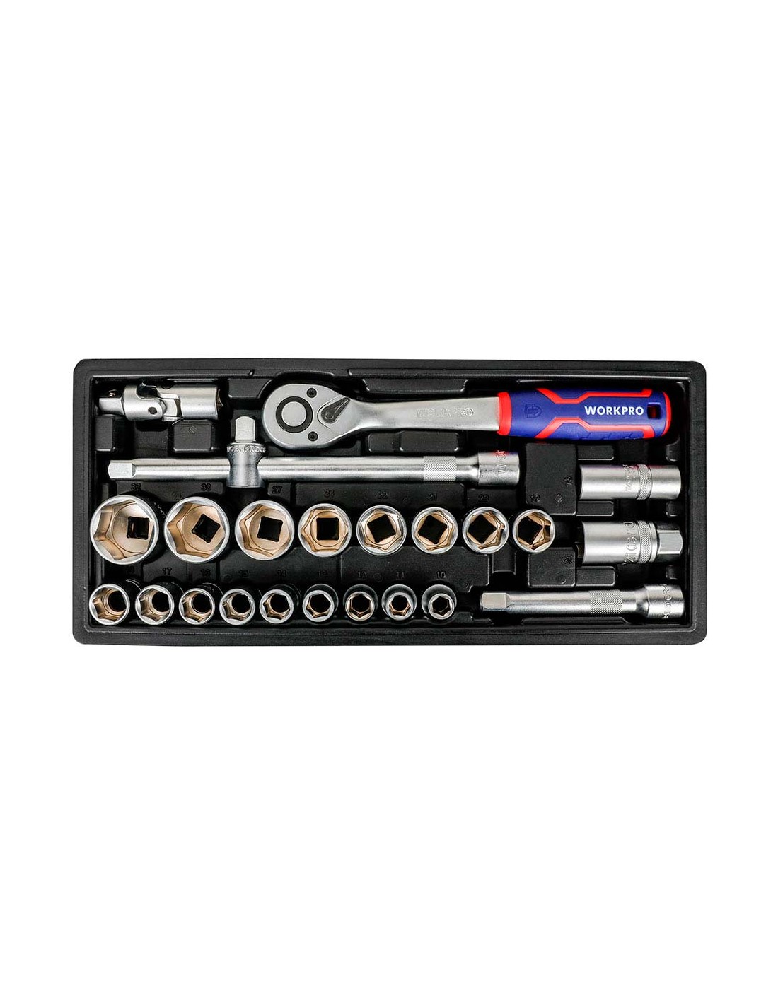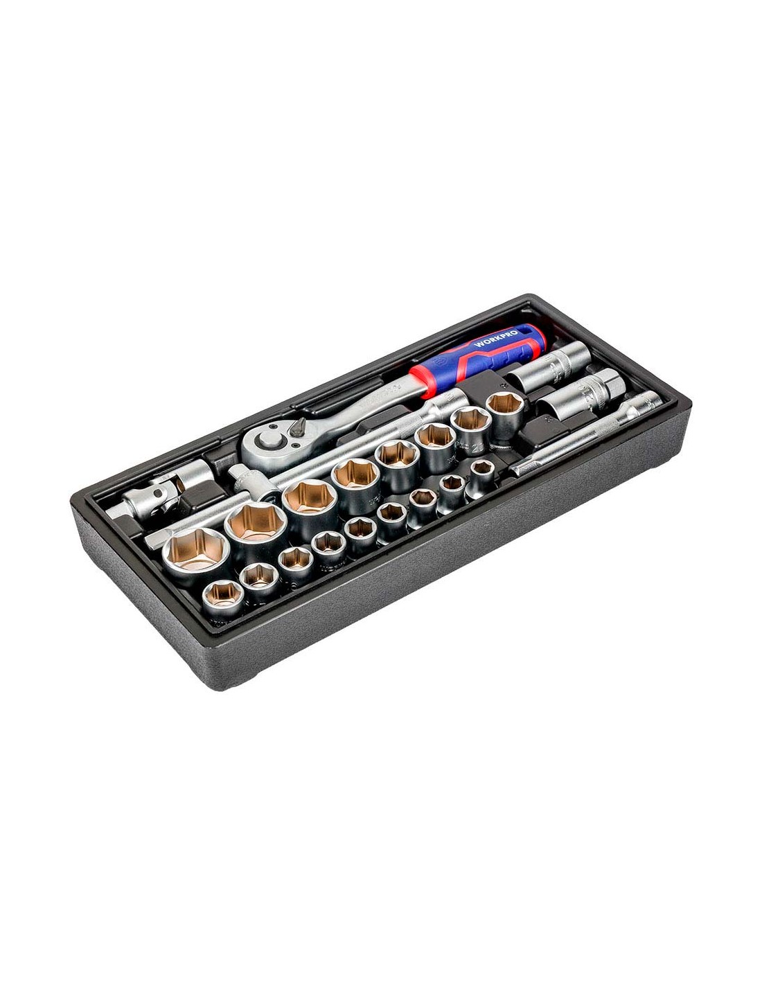 Juego carraca y vasos ½ pulg, 24 piezas al cromo vanadio, (métrico) incluye: 1 llave de carraca de ½ pulg y 72 dientes 17 vasos hexagonales: 10, 11, 12, 13, 14, 15, 16, 17, 18, 19, 20, 21, 22, 24, 27, 30 y 32 mm 2 barras de extensión 125 y 250 mm 2 vasos para bujías 16 y 21 mm 1 articulación universal 1 adaptador de 3 vías