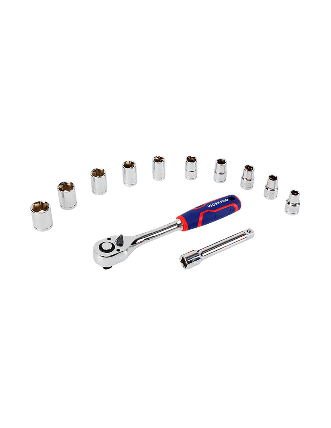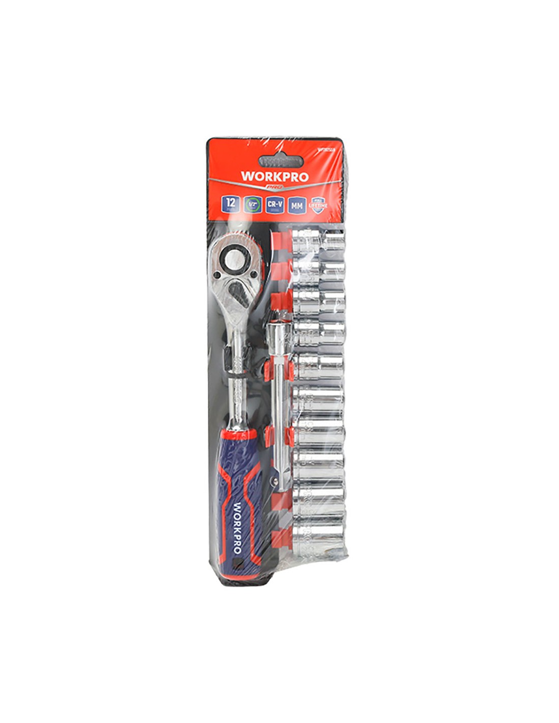 Juego de carraca y vasos cromo-vanadio ½ pulg cromado pulido a espejo, 12 piezas, (métrico) incluye: 1 llave de carraca de ½ pulg 10 vasos hexagonales 10, 11, 12, 13, 14, 15, 17, 19, 21 y 22 mm 1 barra de extensión 127 mm