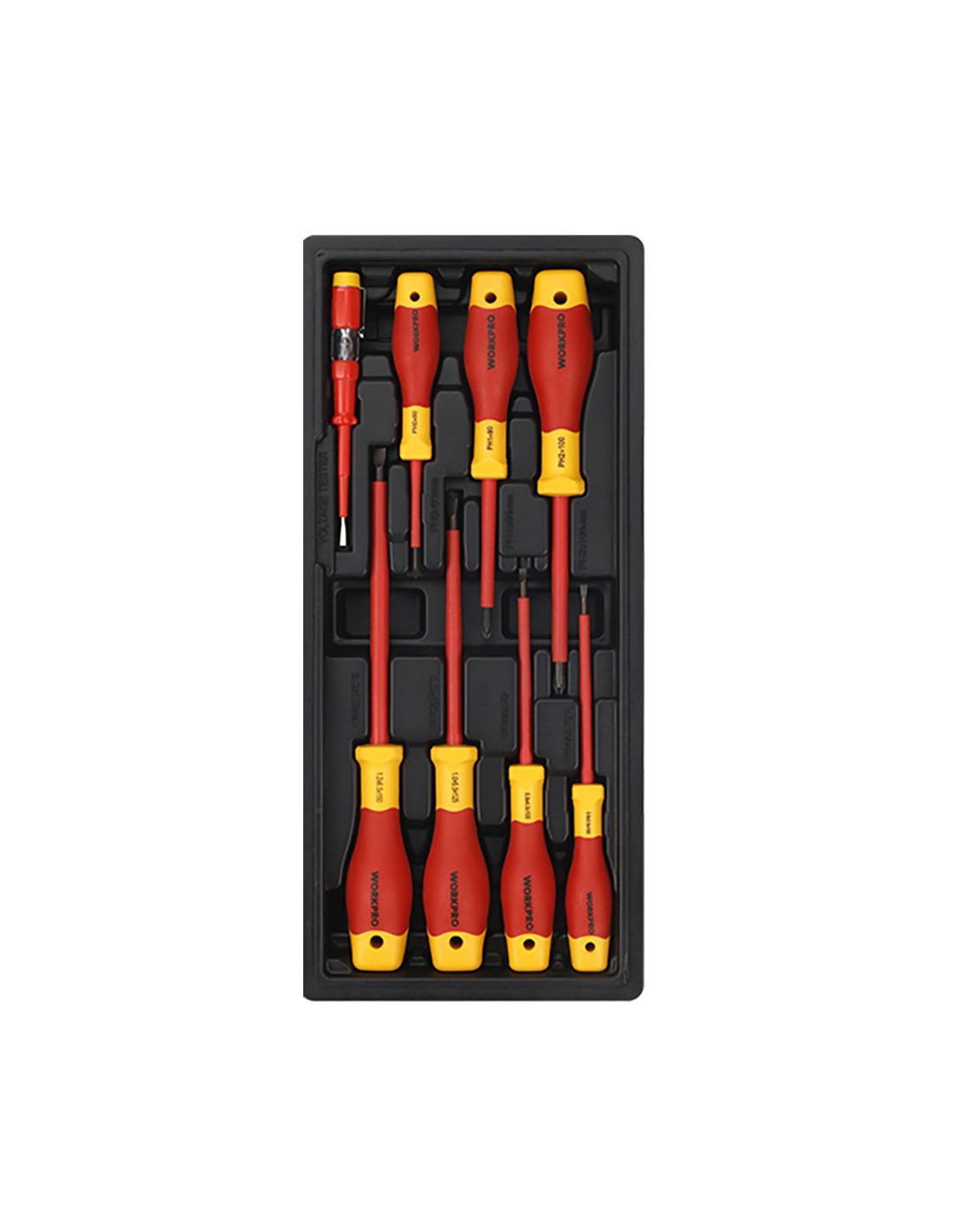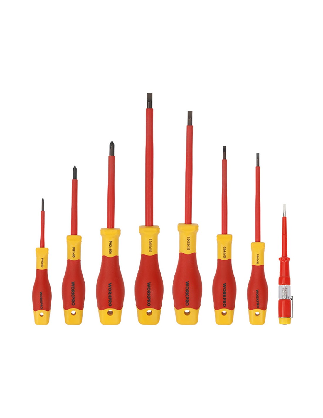 Destornilladores aislados vde, juego 8 piezas en/iec 60900 hasta 1000 voltios ca mango ergonómico antideslizante eje de acero s2 contiene: 3 destornilladores phillips vde: ph0 x 60 mm, ph1 x 80 mm, ph2 x 100 mm 4 destornilladores planos vde: 3.5 x 100 mm, 4 x 100 mm, 5.5 x 125 mm, 6.5 x 150 mm 1 comprobador de tensión vde 3 x 140 mm
