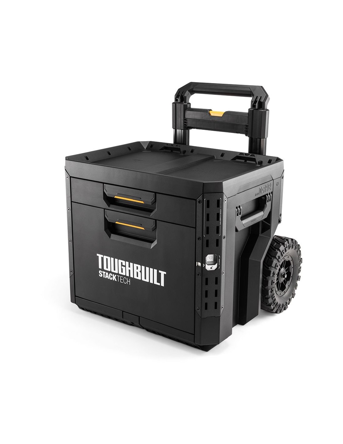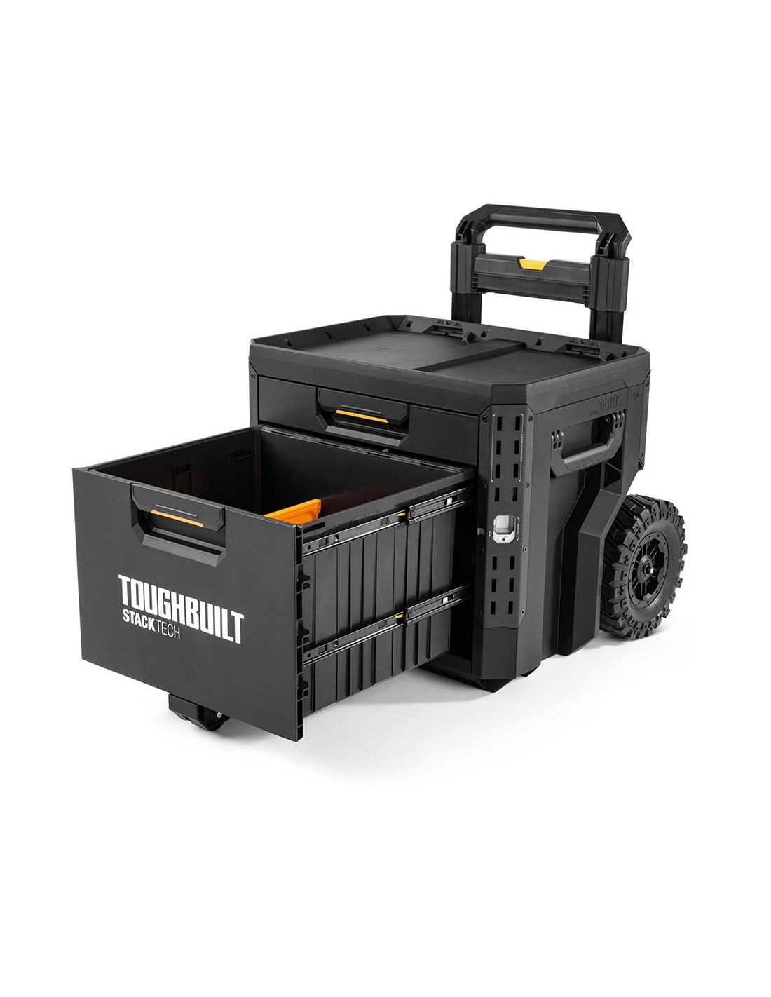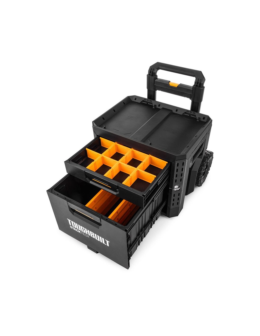 Caja de herramientas con ruedas de 2 cajones con cierre, stacktech, estructura autoalineable y encajable, acceso rápido al almacenamiento sin desapilar, la posición del cierre indica cuándo es seguro transportarla, cierre deslizante apto para candado (no incluido), asas laterales robustas y abatibles, rieles para complementos de liberación rápida, polímero de alto rendimiento negro y esquinas de acero, mango telescópico extraíble de 67 - 111,8 cm y 2 ruedas todoterreno de 22 cm, incluye 13 separadores, capacidad 113 kg, medida encajable 47 x 35,5 cm, dimensiones 53 x 40,5 x 47,7 cm