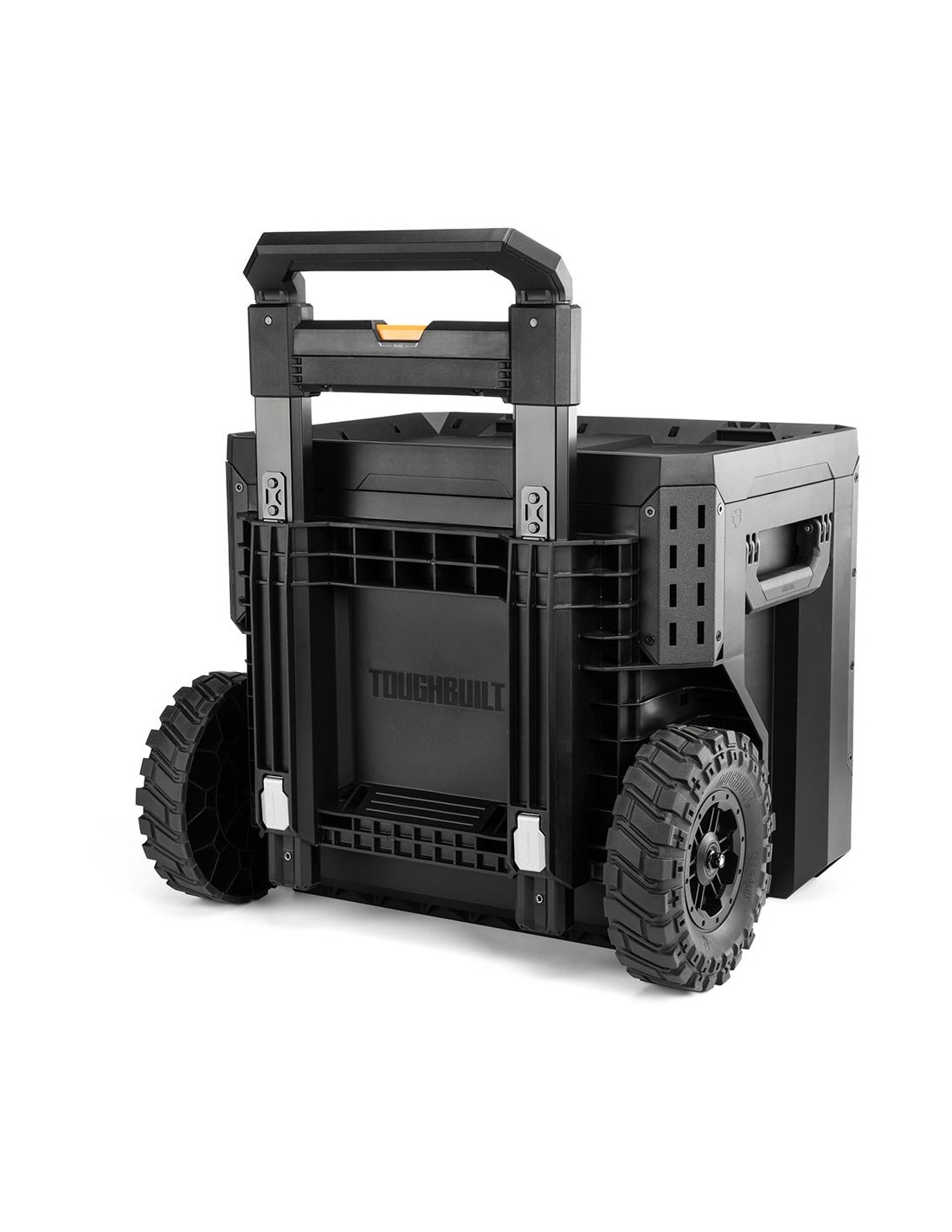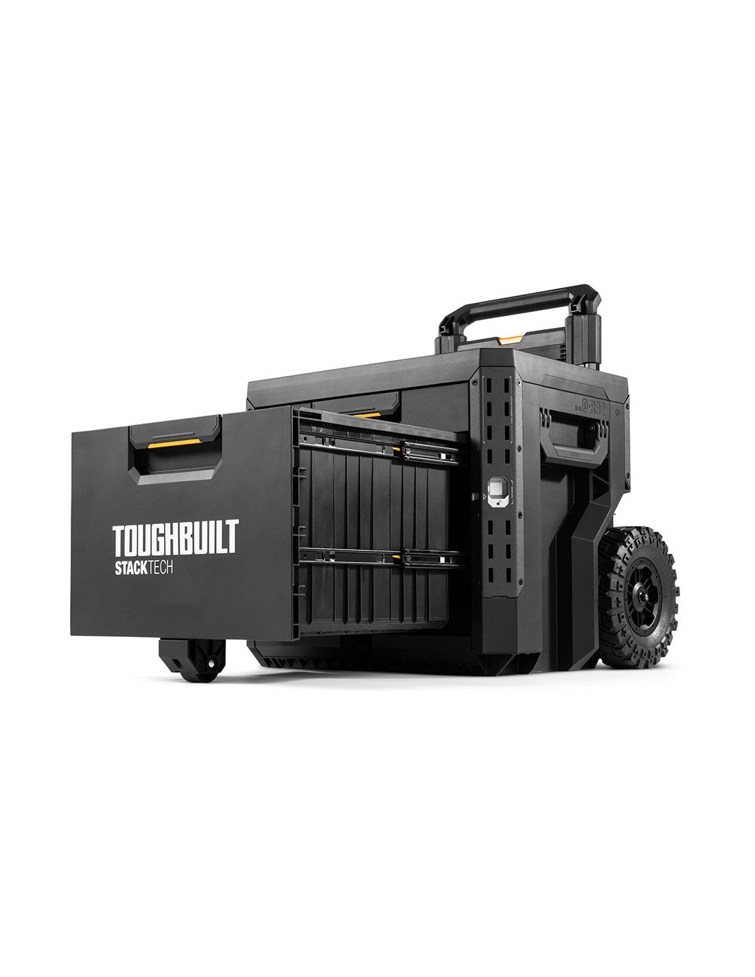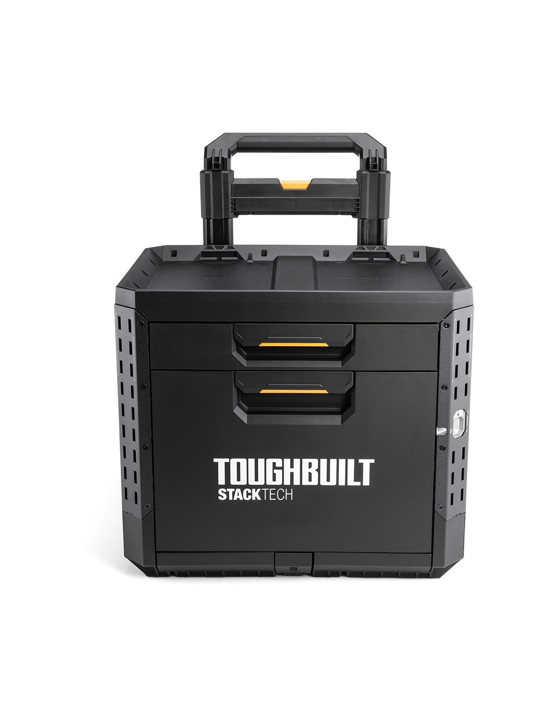 Caja de herramientas con ruedas de 2 cajones con cierre, stacktech, estructura autoalineable y encajable, acceso rápido al almacenamiento sin desapilar, la posición del cierre indica cuándo es seguro transportarla, cierre deslizante apto para candado (no incluido), asas laterales robustas y abatibles, rieles para complementos de liberación rápida, polímero de alto rendimiento negro y esquinas de acero, mango telescópico extraíble de 67 - 111,8 cm y 2 ruedas todoterreno de 22 cm, incluye 13 separadores, capacidad 113 kg, medida encajable 47 x 35,5 cm, dimensiones 53 x 40,5 x 47,7 cm
