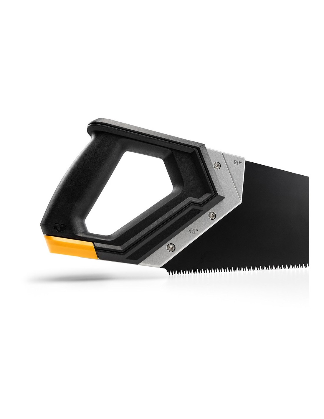 Serrucho 600 mm, hoja de acero alto carbono optimizada para cortar madera, dientes triple filo, para cortes eficientes y limpios. regla y escuadra de caballete integrada, ángulos de 45° y 90° preconfeccionados, mango ergonómico de triple inyección, carcasa metálica en la base de la hoja para más rigidez y control, almacenamiento de lápices