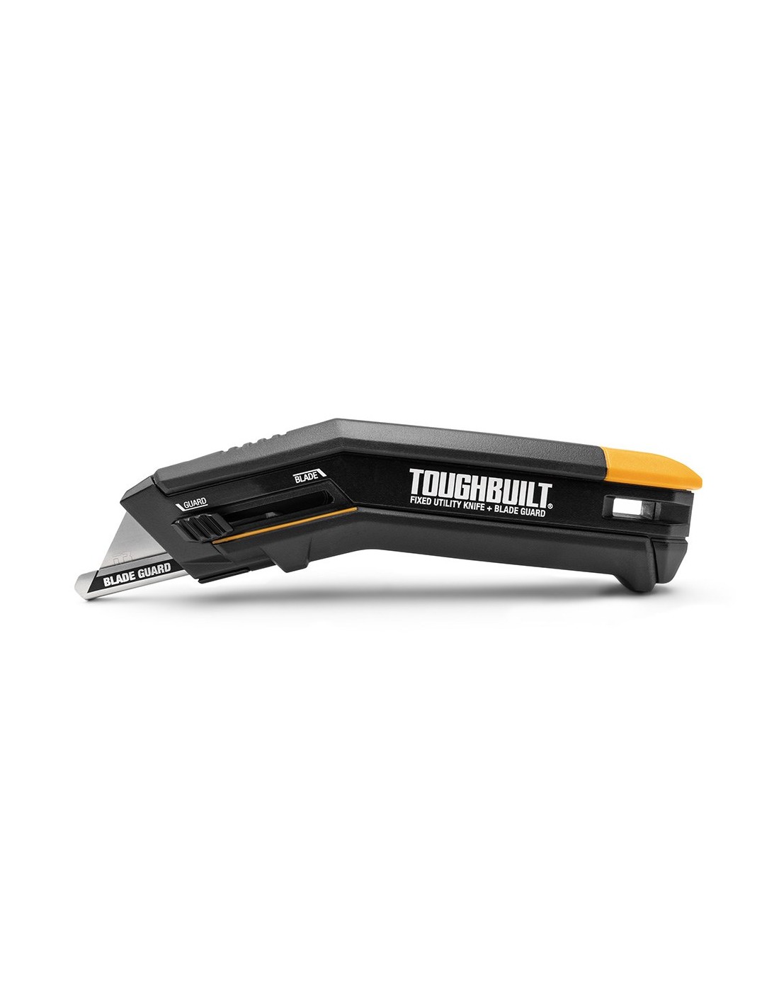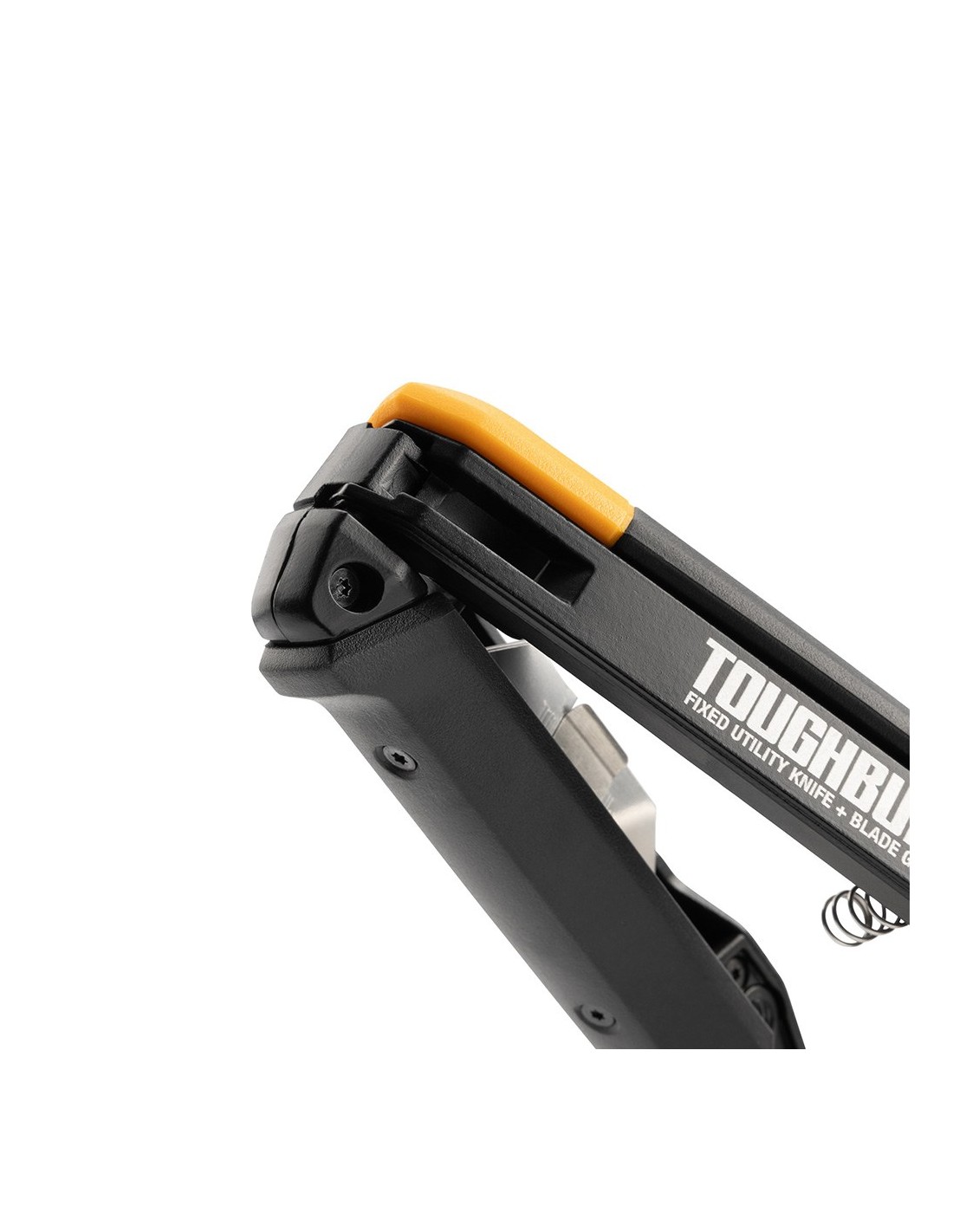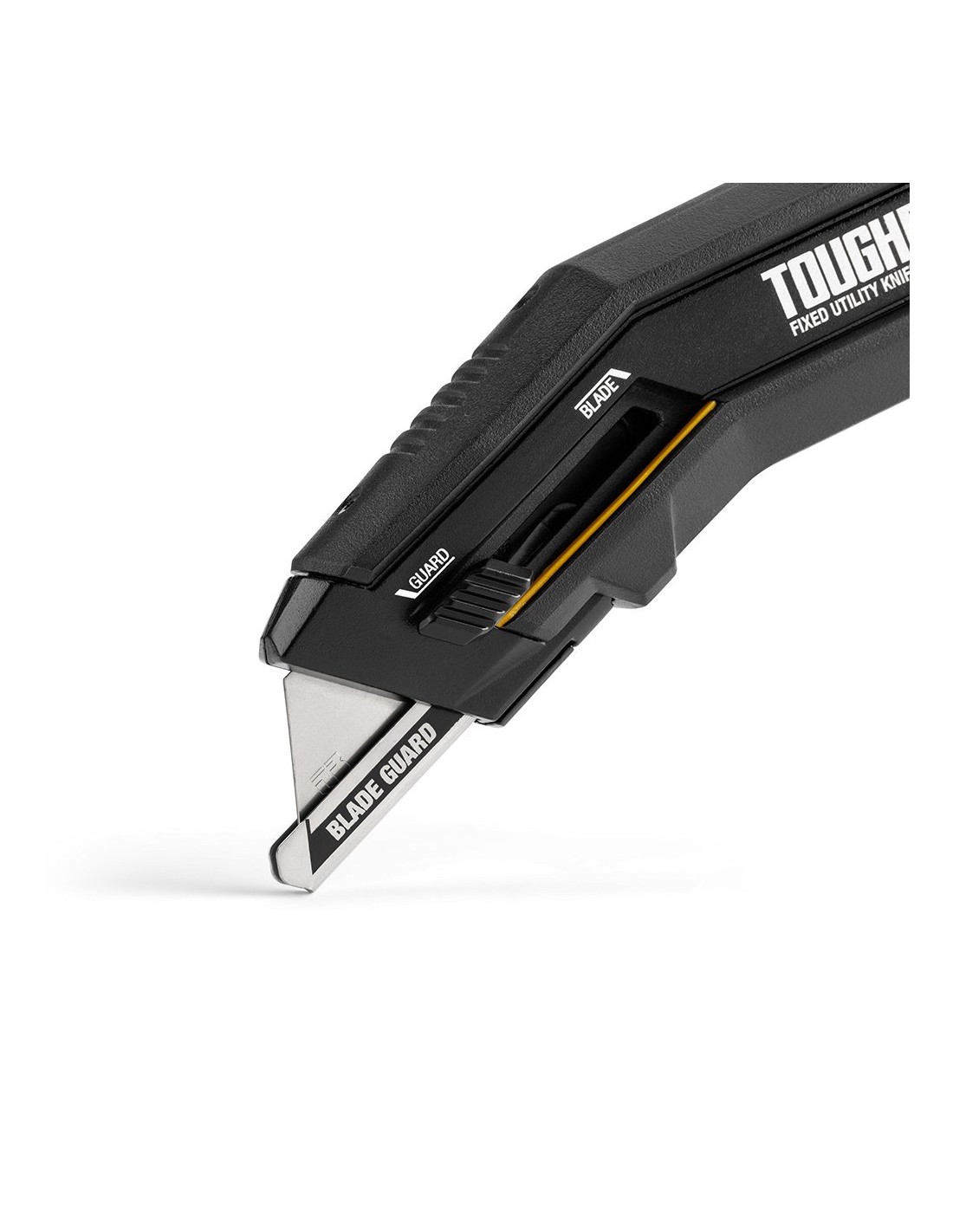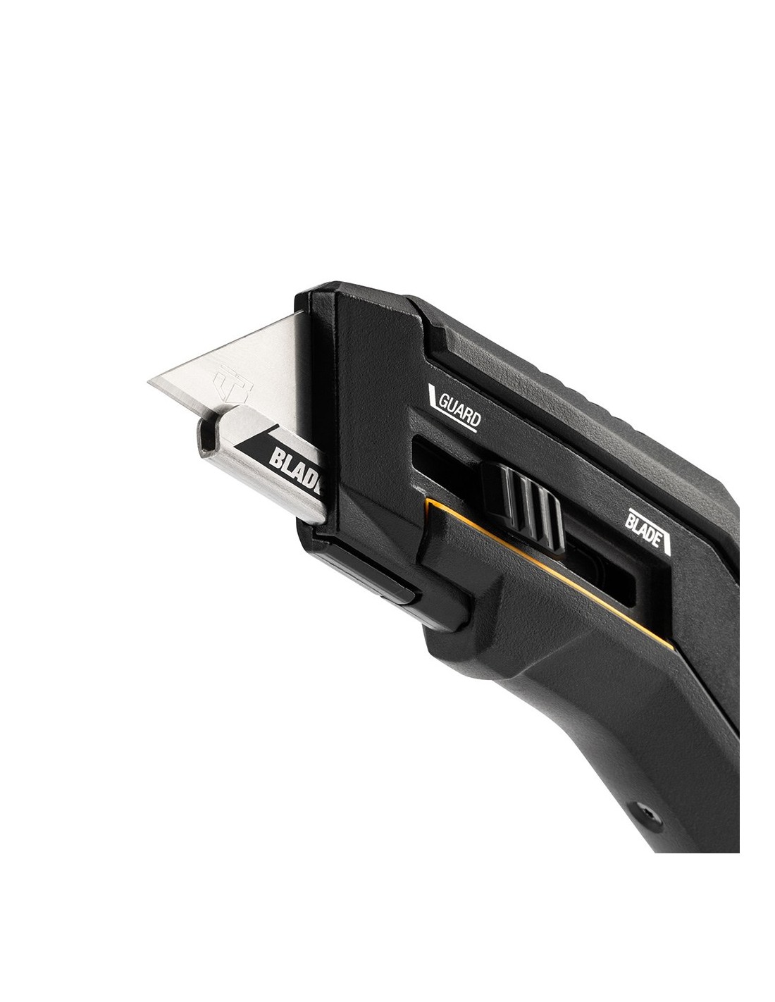 Cúter hoja fija + protector deslizante con dos posiciones, total o parcialmente extendida, cambio de la hoja sin herramientas, mango ergonómico tirple inyectado, bucle de amarre, compatible con cuchillas estandar trapezoidales, incluye 5 hojas