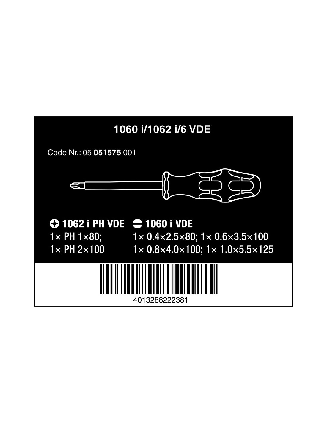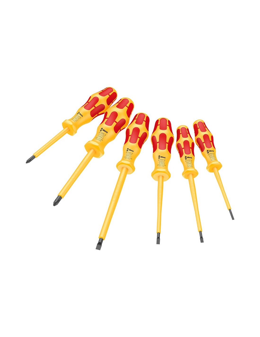 Destornilladores vde, 6 piezas, 1.000 v. mango multicomponente kraftform para un trabajo rápido y confortable, marcación en el mango, sistema hexagonal anti-rodadura, punta wera black point, alojamiento preciso, mayor protección anticorrosiva. 1xph1x80 mm, 1xph2x100 mm, 1x0.4x2.5x80 mm, 1x0.6x3.5x100 mm, 1x0.8x4x100 mm, 1x1x5.5x125 mm