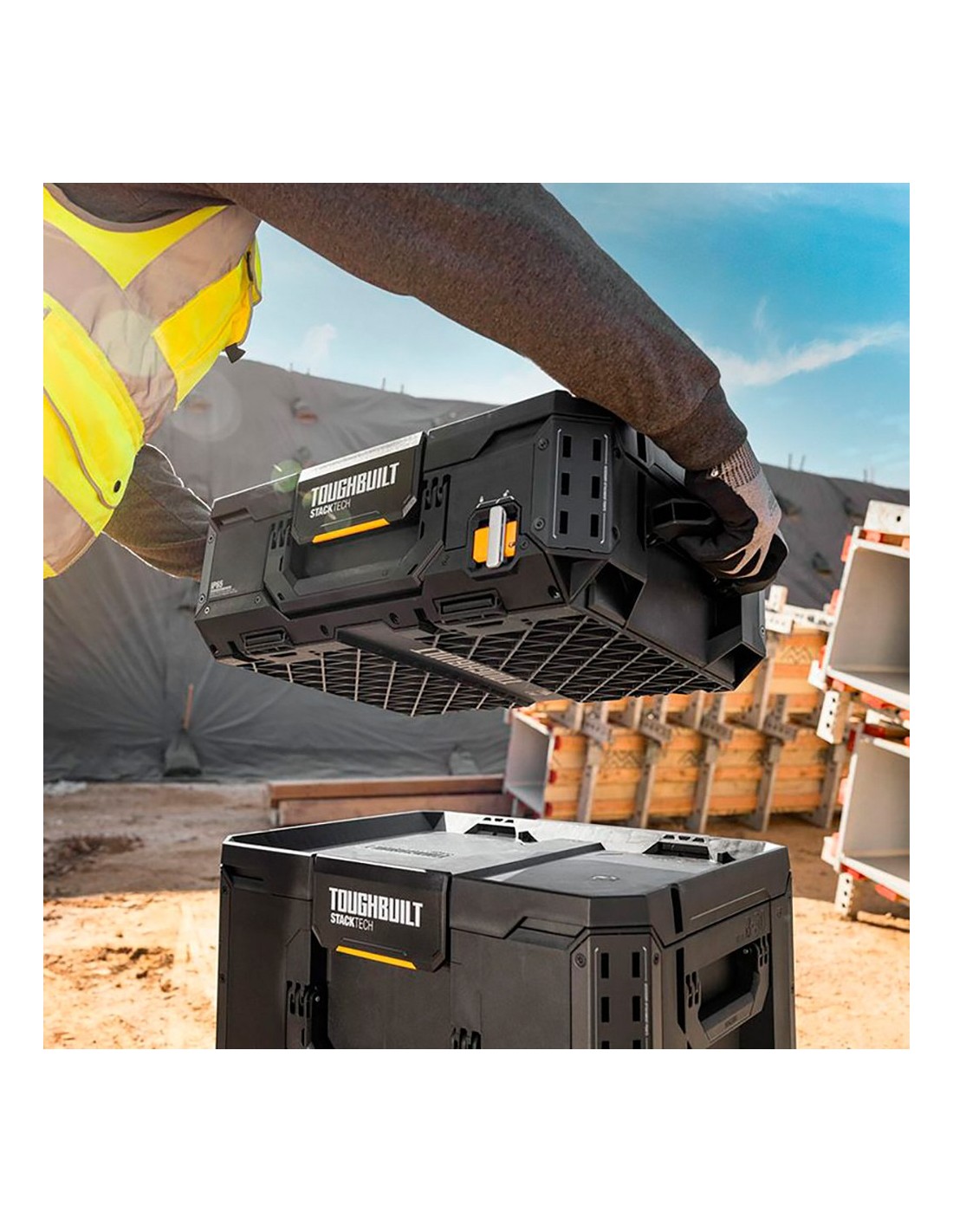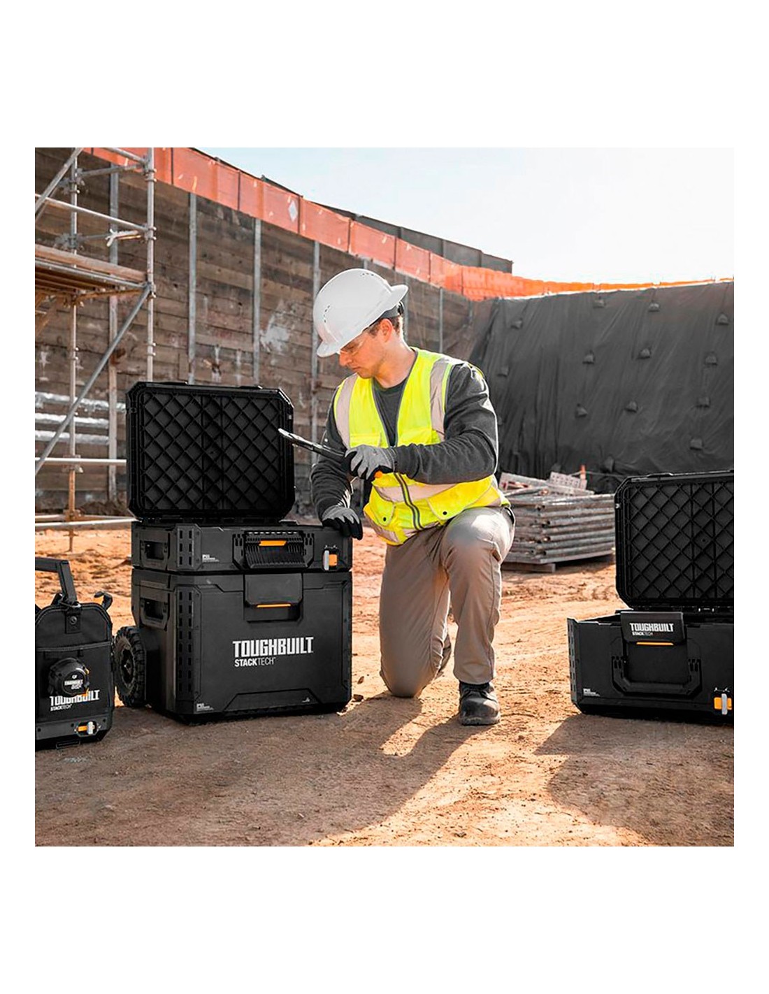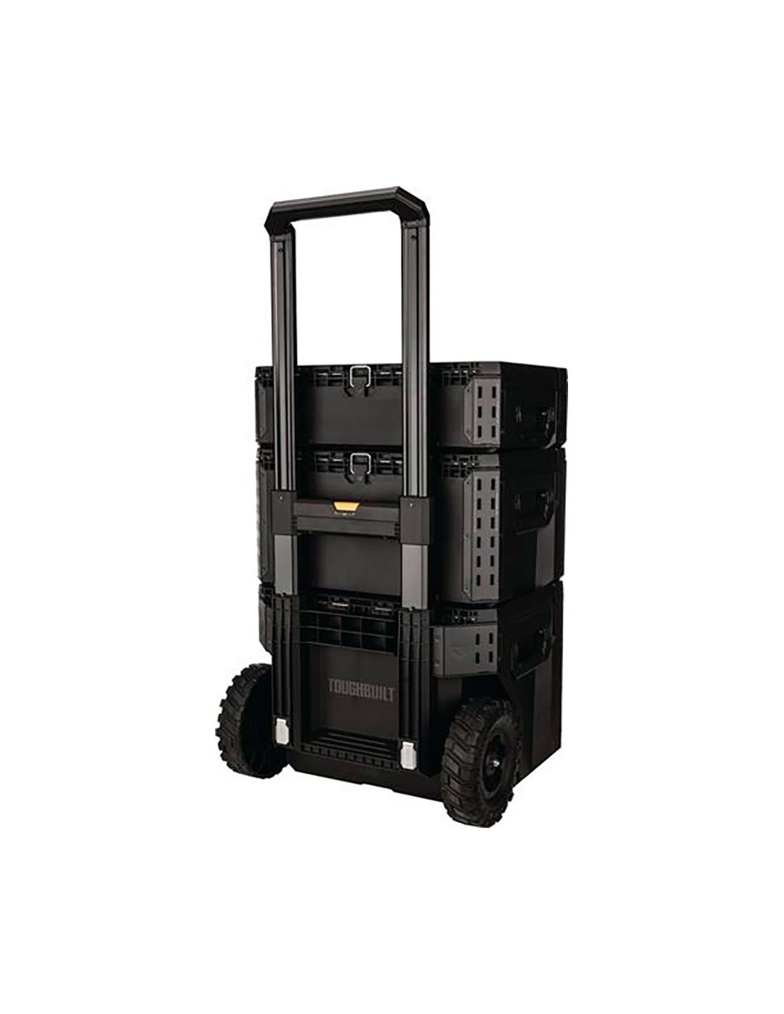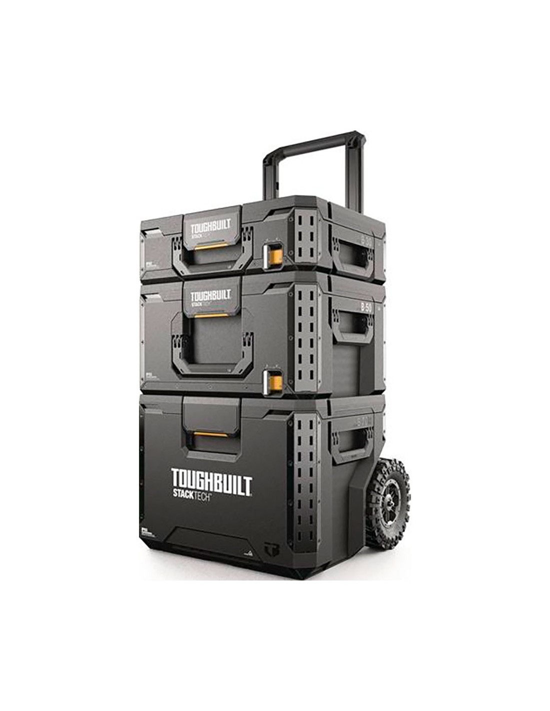 Juego de caja de herramientas con ruedas stacktech 3 piezas, mango telescópico extraible, ruedas todoterreno de 22 cm, esquinas de acero para fijación de accesorios, ip65, modular apilable, cierres centrales para acceso rápido a la herramienta, tapa hermética, hecho de polímero de alta resistencia, pestillos para desmontaje y asegurado del conjunto, capacidad 192 kg