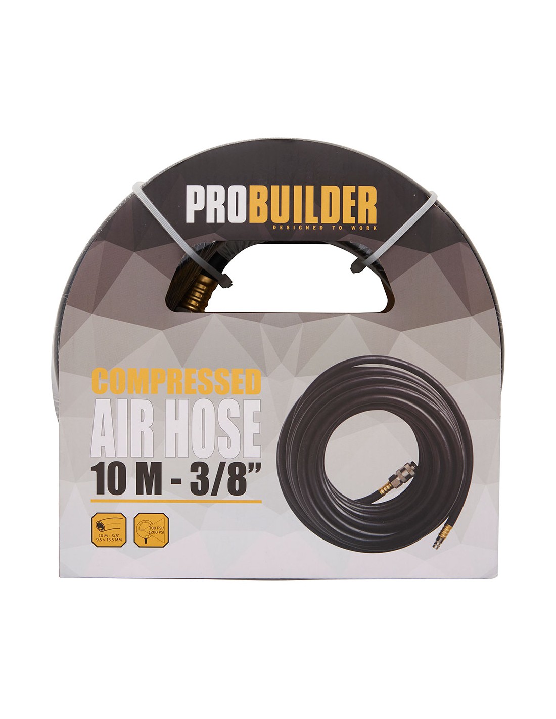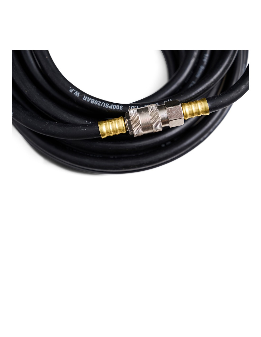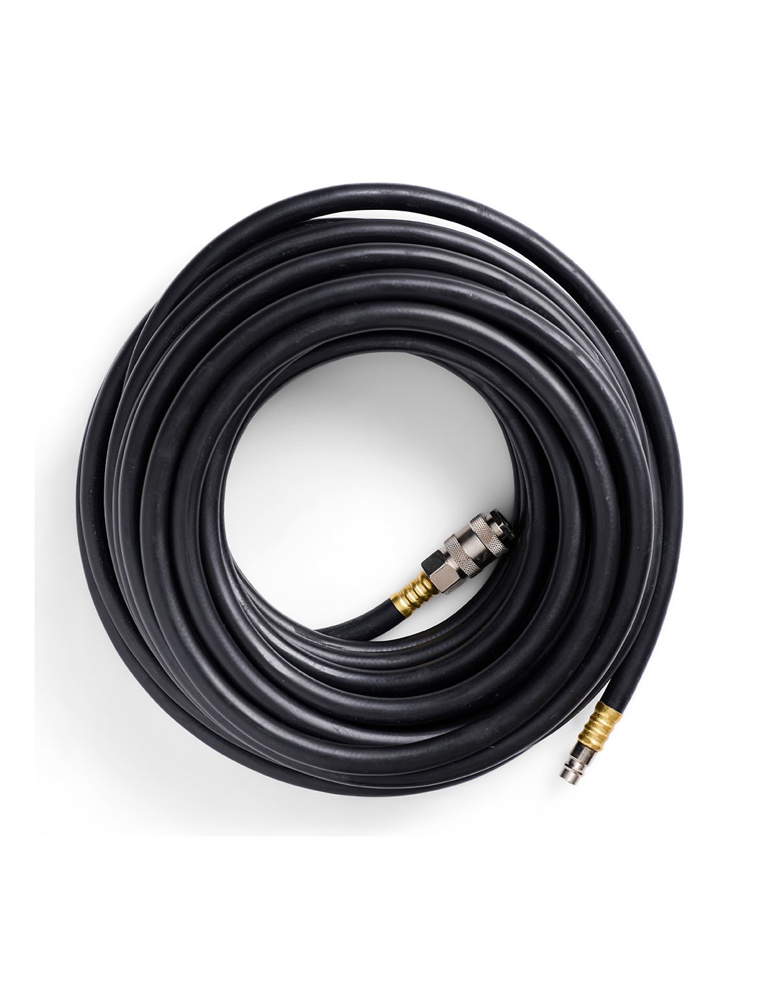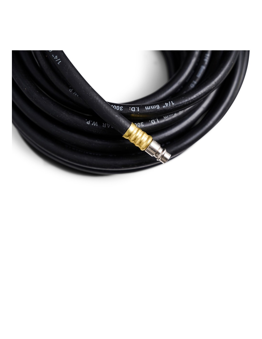 Manguera de aire comprimido de caucho 10 m, incluye acoplamiento de montaje rápido 3/8" y boquilla con manguito de goma incluido 9,5 x 15,5 mm, presión de trabajo 300 - 1200 psi, 80 bar, temperatura de trabajo -40 a 60°c, negra