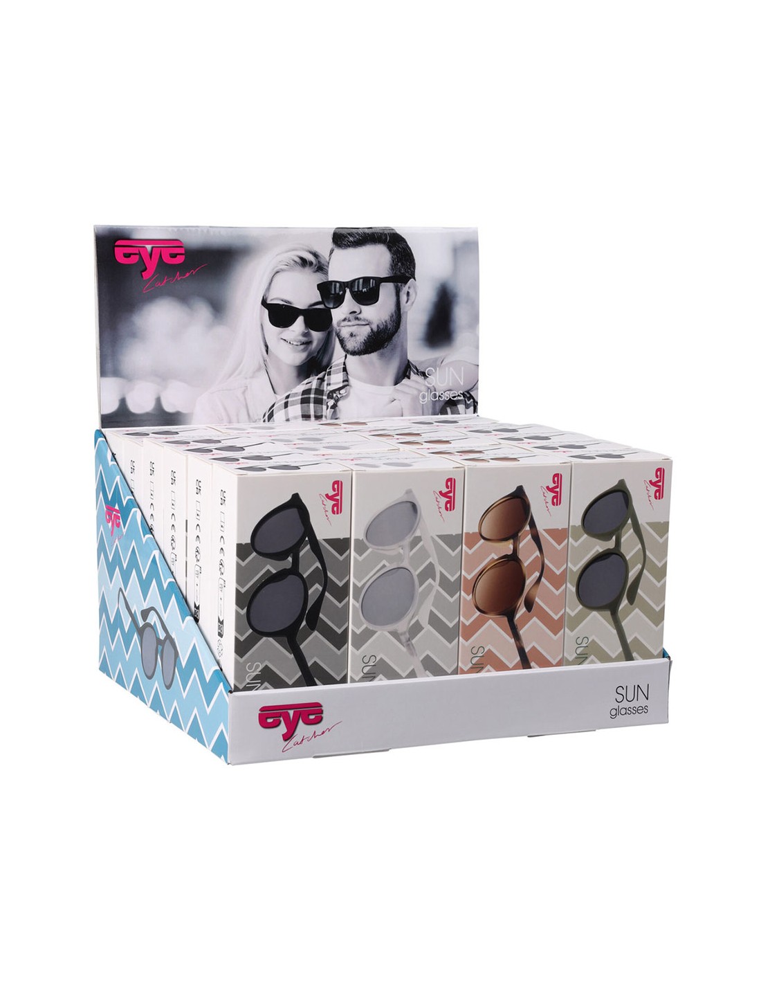 Gafas de sol unisex con funda de tela y cordón, colores surtidos. presentada en expositor de 24 uds