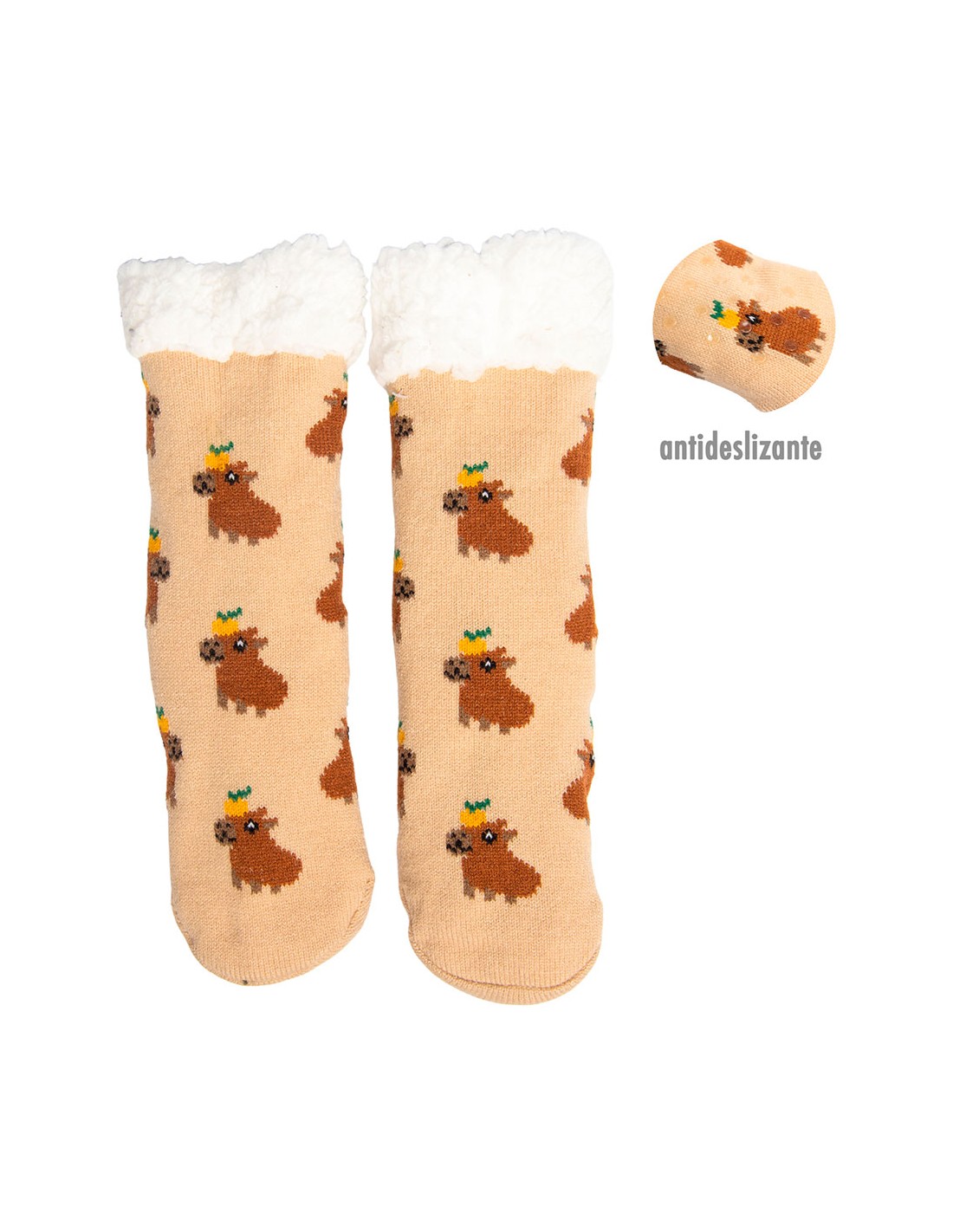 Calcetines estampados de capibara antideslizantes con forro de borreguito suave, 100% poliéster, infantil, talla 30 - 35
