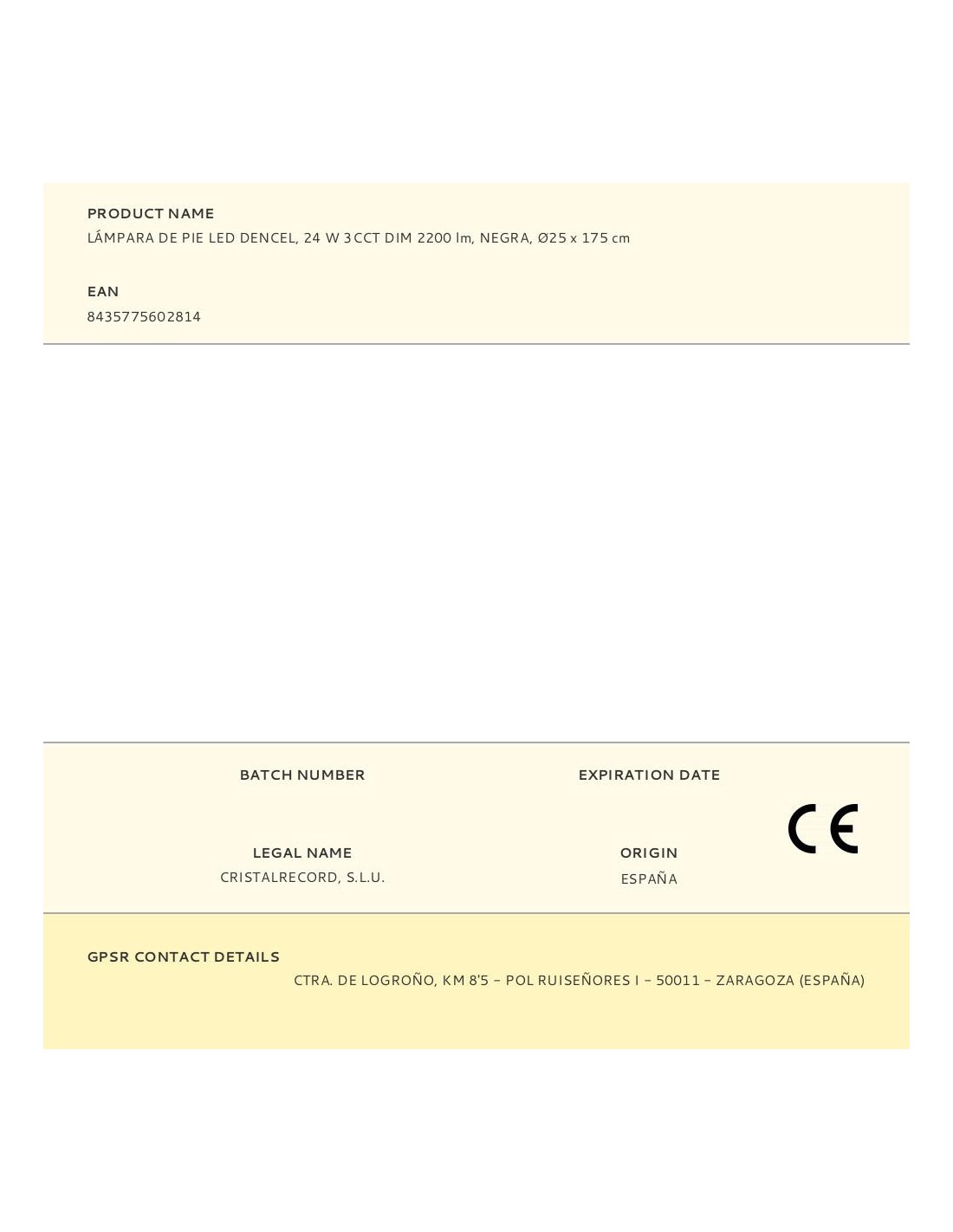 Lámpara de pie led dencel, 24 w, 3cct, dimmable, 2200 lm, negra, ø25 x 175 cm
