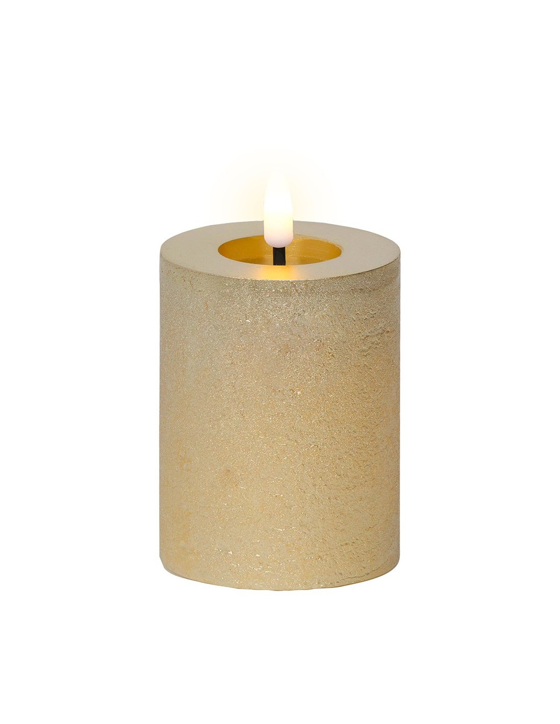 Vela de cera led, color dorado. medidas: ø7 x 11,3 cm. uso: interior. color led: luz cálida. con temporizador 6 h y 10 h, autonomía: 250 h, funciona con pilas 2 x aaa (no incluidas)