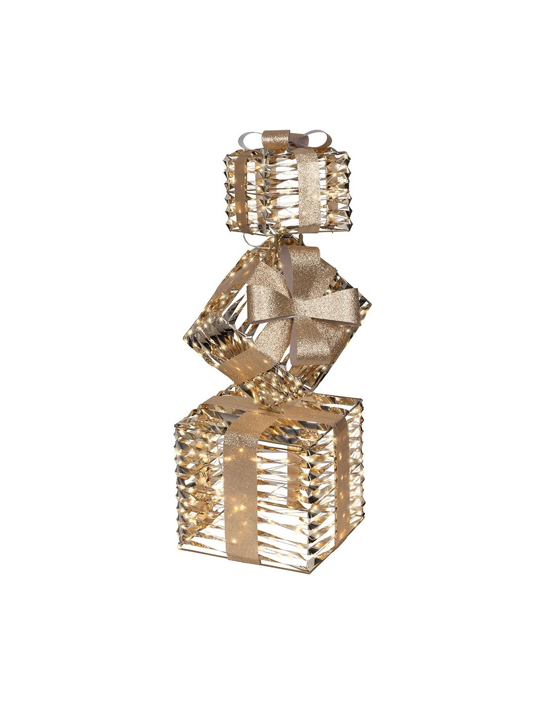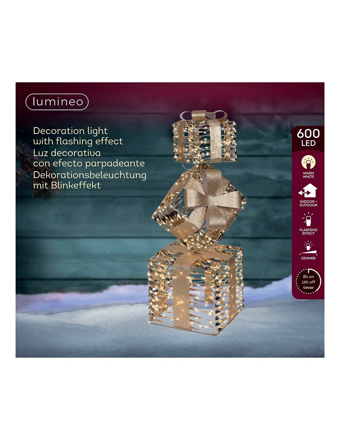 Luz led decorativa exterior con forma de cajas regalo, luz cálida parpadeante, 600 leds. temporizador: 8 h encendido / 16 h apagado. funciona con transformador 4,5v