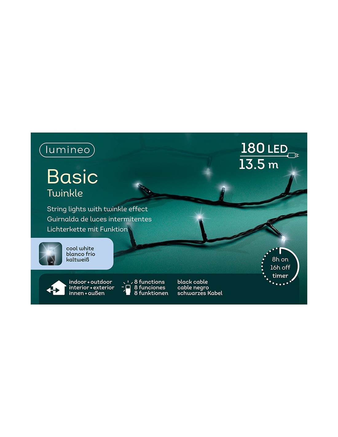 Guirnalda multifunción, uso exterior, basic, blanco frío, cable negro, 180 leds, 13,5 m