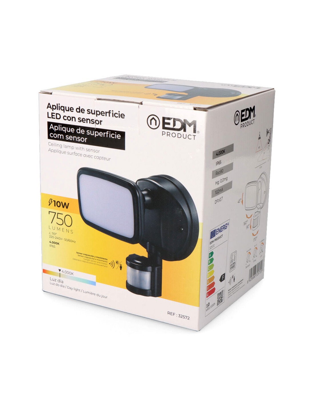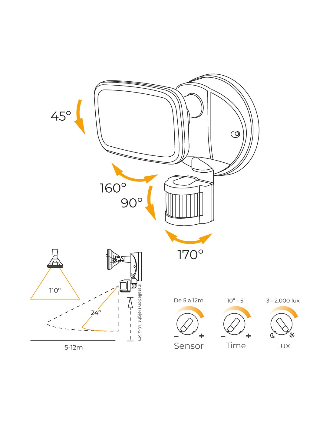 Aplique foco led con sensor crepuscular y de movimiento, negro, 10 w, 750 lm, 4000k, luz día, rango de detección: 180°, distancia de detección: 5-12 m (24°) ajustable, luz ambiental 3 -2000 lux (ajustable) temperatura de funcionamiento entre -20 y 40°c retardo de tiempo: min 10 s +/- 3 s hasta 5 min máx altura instalación 1,8-2,5 m flujo luminoso de 110° 220-240 v ~ 50-60 hz. ip65. vida estimada: 25000 h, clase energética: f. material: pvc + aluminio. kit de montaje incluido. ø12 × 14 × 17 cm