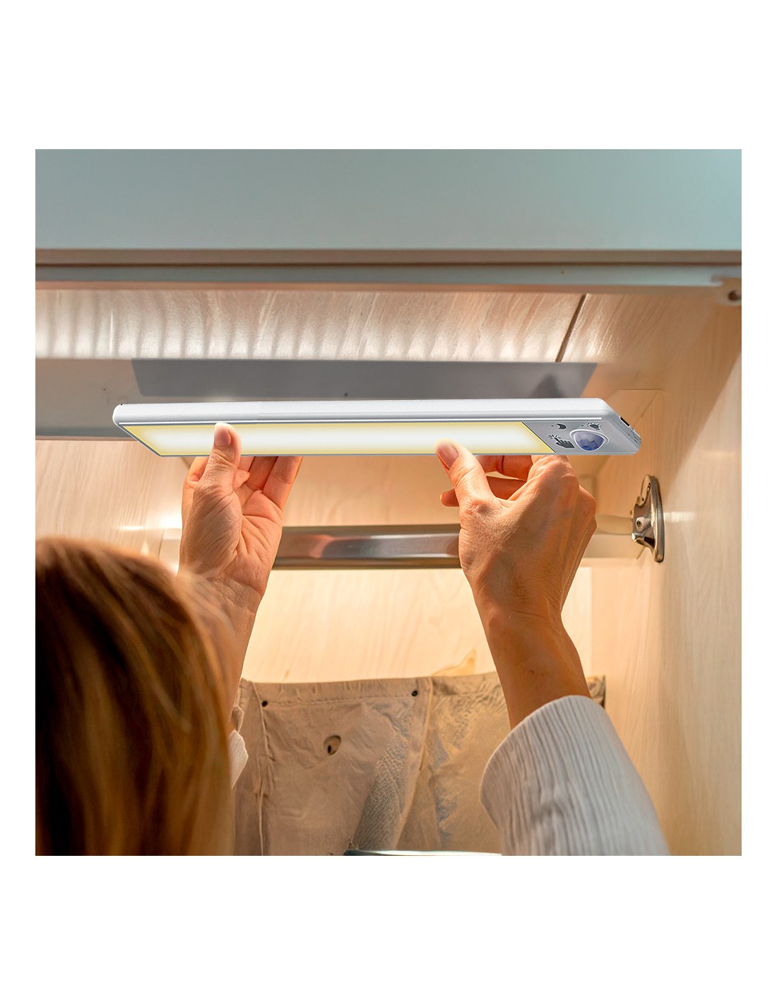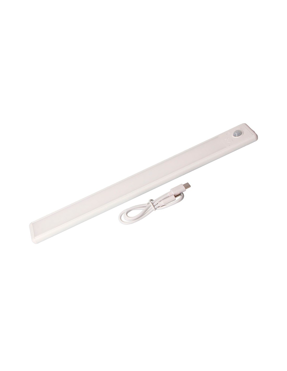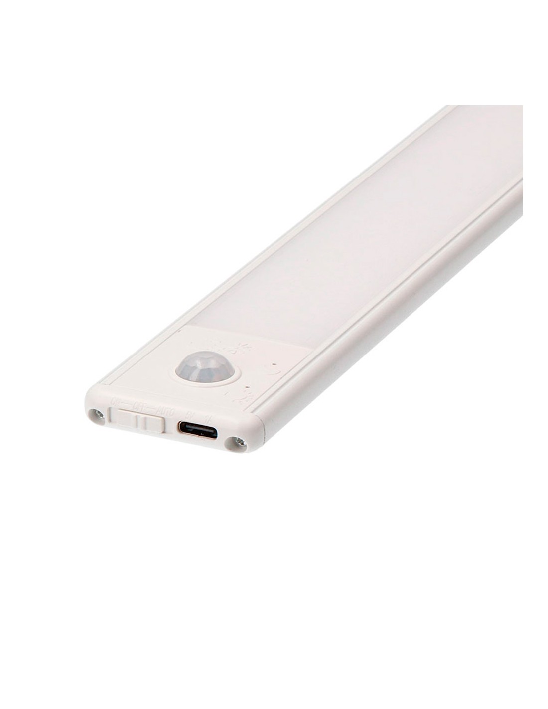 Regleta led recargable con sensor, 1,5 w, 3cct (3000k, 4000k, 6500k), 120 lm, 71 leds, flujo luminoso: 360°, ángulo de apertura: 180°, 1500 mah, carga con cable usb c 5v dc, tiempo de carga completa: 3 h, autonomía: 10 h, ip20, la intensidad de la luz es totalmente ajustable manteniendo pulsado el botón táctil, la temperatura de color es regulable con botón táctil, selector dip, sensor pir, vida estimada: 25000 h, incluye placa metálica adhesiva magnética no necesita instalación medida: 14 x 40 x 306 mm