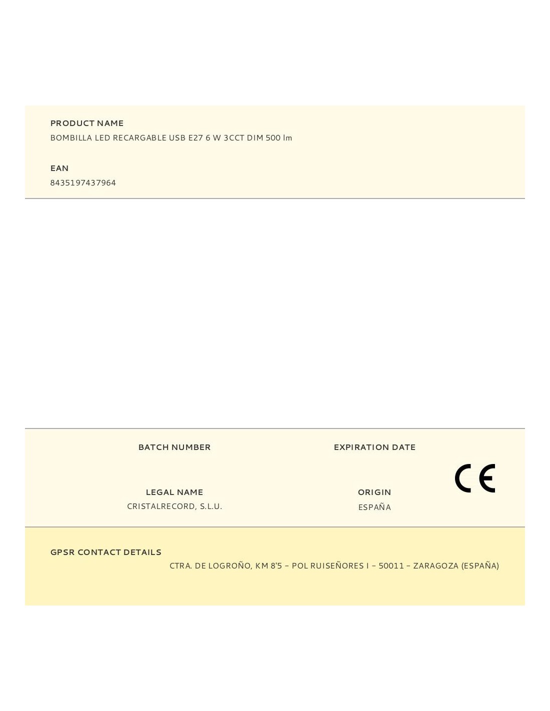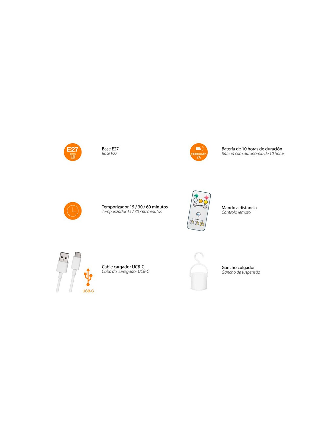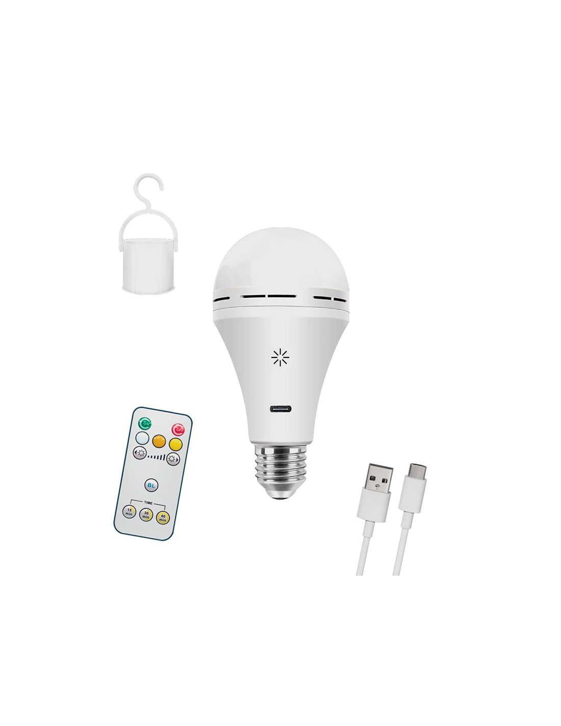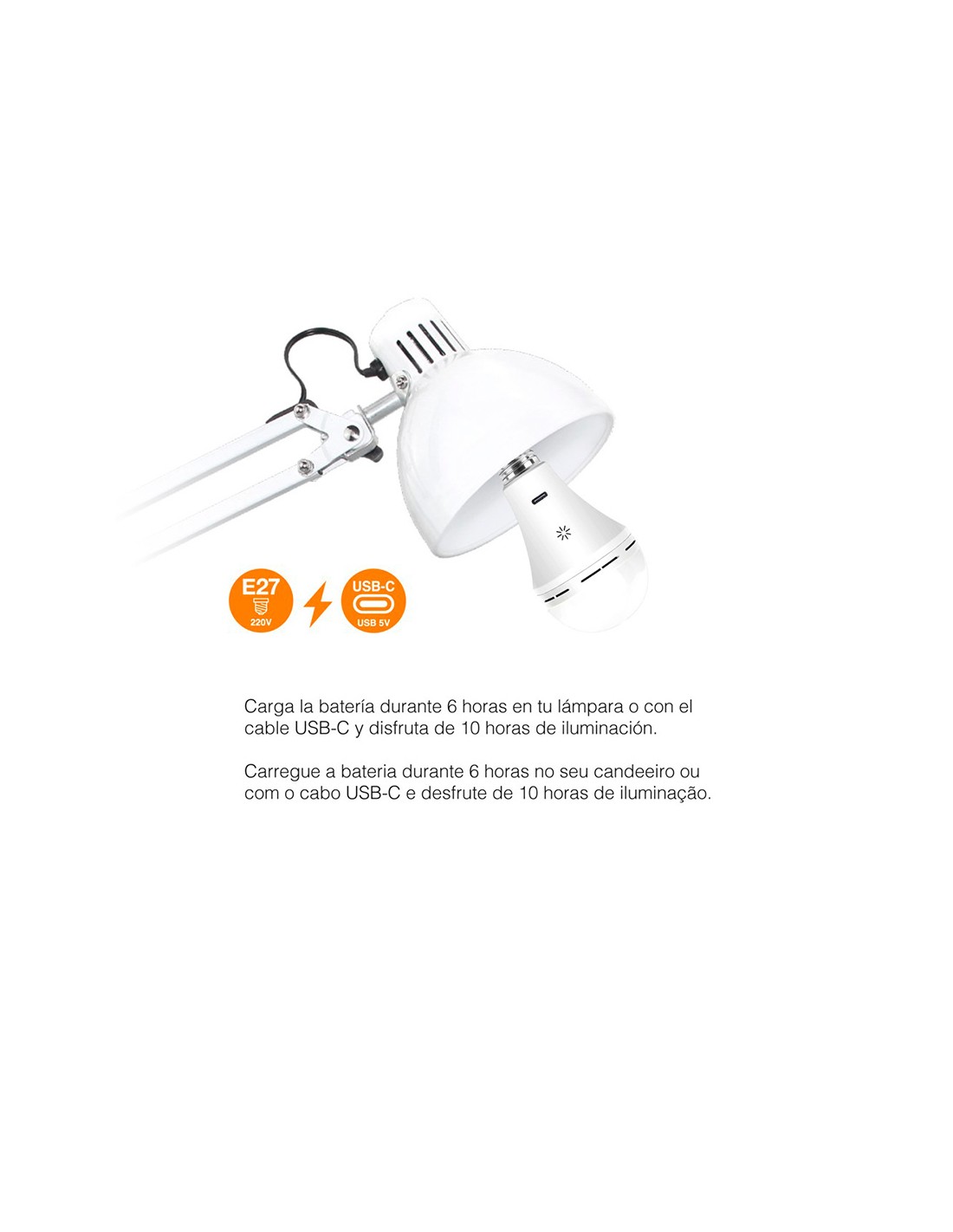 Bombilla led recargable usb, e27, 6 w, 500 lm, cct 3000-4000-6000 k, interruptor táctil, dimmable irc/cri 80 batería de 2600 mah dos formas de carga: con cable o en la lámpara. autonomía 10 h según uso carga de 6 h abs-pc vida útil 30000 h 15000 ciclos 85-265 v~50 hz clase energética g incluye cable usb-c y accesorio para colgar con mando a distancia blanca 130 x 70 mm