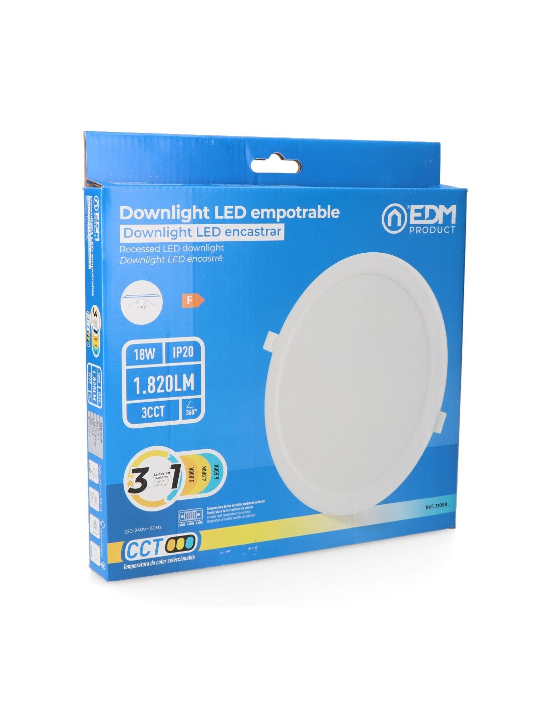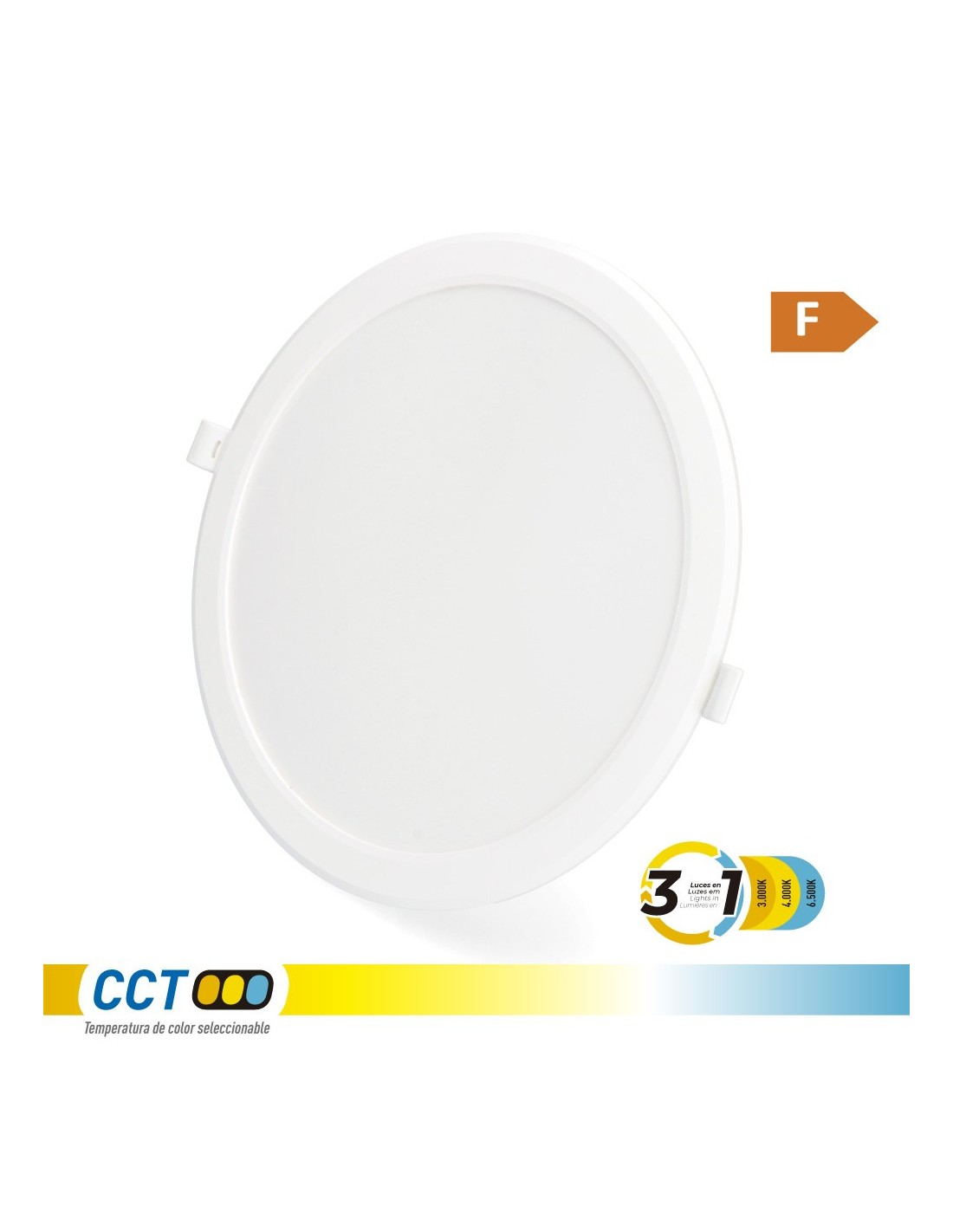 Downlight led empotrable, redondo, 18 w, 3cct, 1820 lm, 180 leds flujo luminoso: 360° medidas: exterior: ø22,3 cm - enclavamiento: ø18,5 cm marco blanco, ángulo de apertura: 120° 220 - 240 v~50 hz, ra80, ip20, vida estimada: 25.000 h clase energética: f. temperatura de luz variable mediante selector: 3000 k / 4000 k / 6500 k. la temperatura del color se debe escoger antes de la instalación. ø223 x 30,5 mm