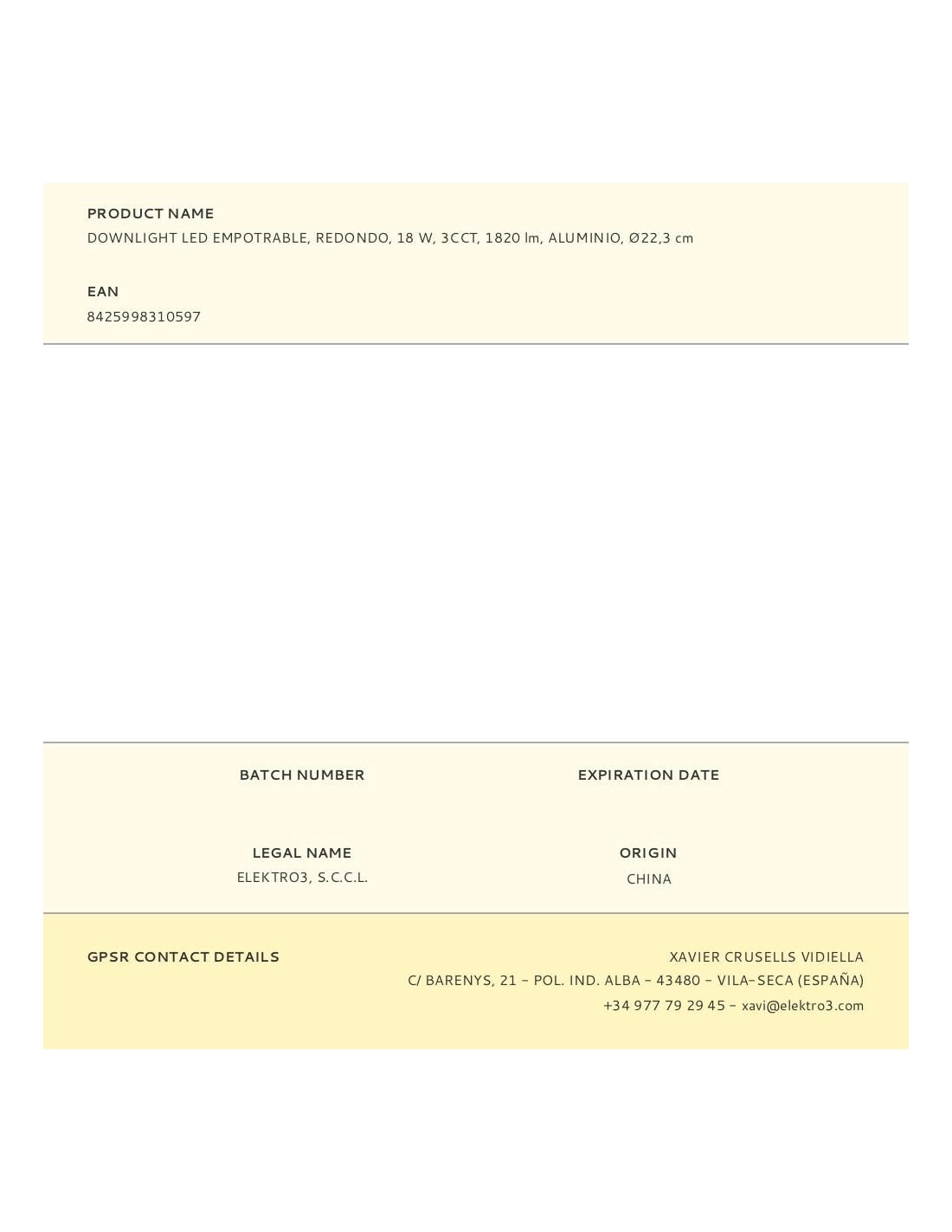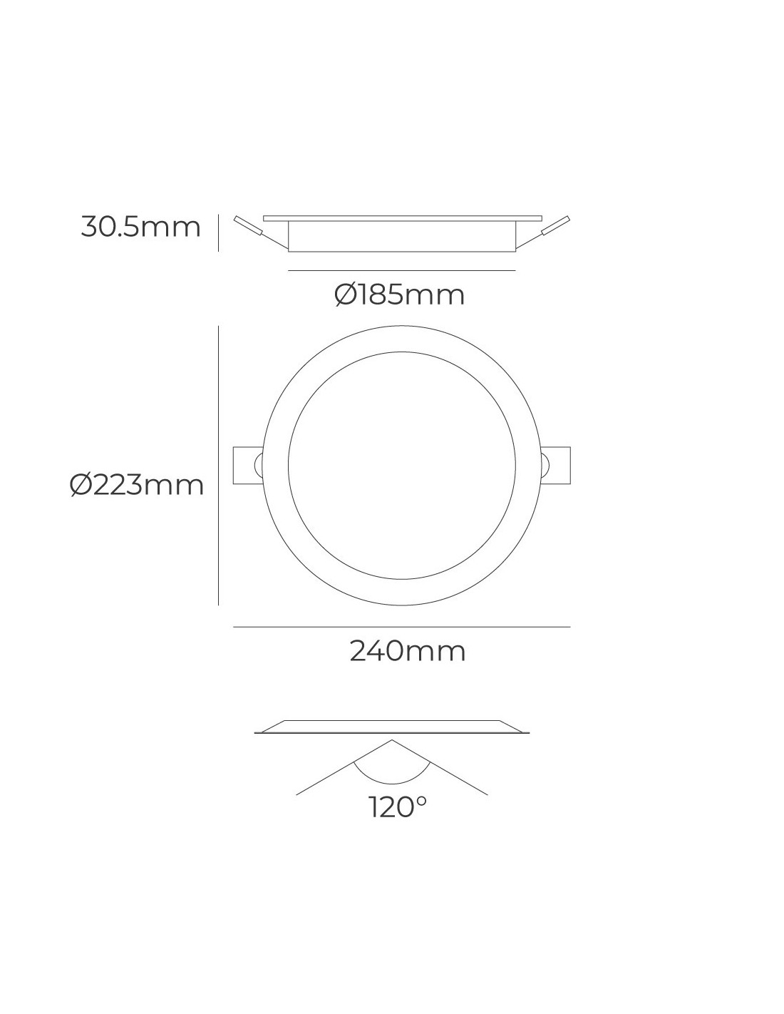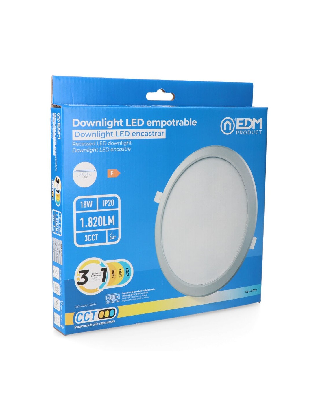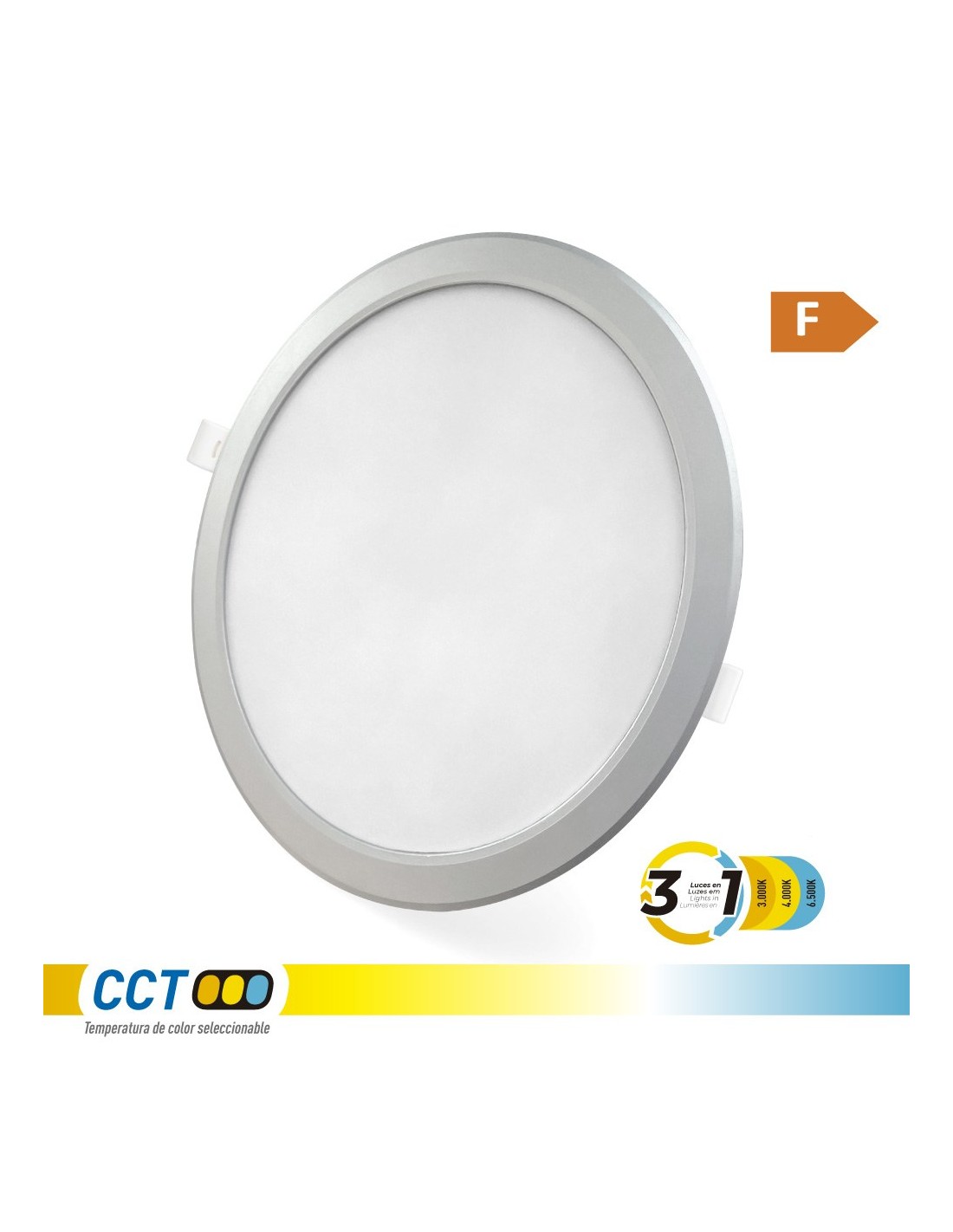 Downlight led empotrable, redondo, 18 w, 3cct, 1820 lm, 180 leds flujo luminoso: 360° medidas: exterior: ø22,3 cm - enclavamiento: ø18,5 cm marco aluminio, ángulo de apertura: 120° 220 - 240 v~50 hz, ra80, ip20, vida estimada: 25.000 h clase energética: f. temperatura de luz variable mediante selector: 3000 k / 4000 k / 6500 k. la temperatura del color se debe escoger antes de la instalación. ø223 x 30,5 mm