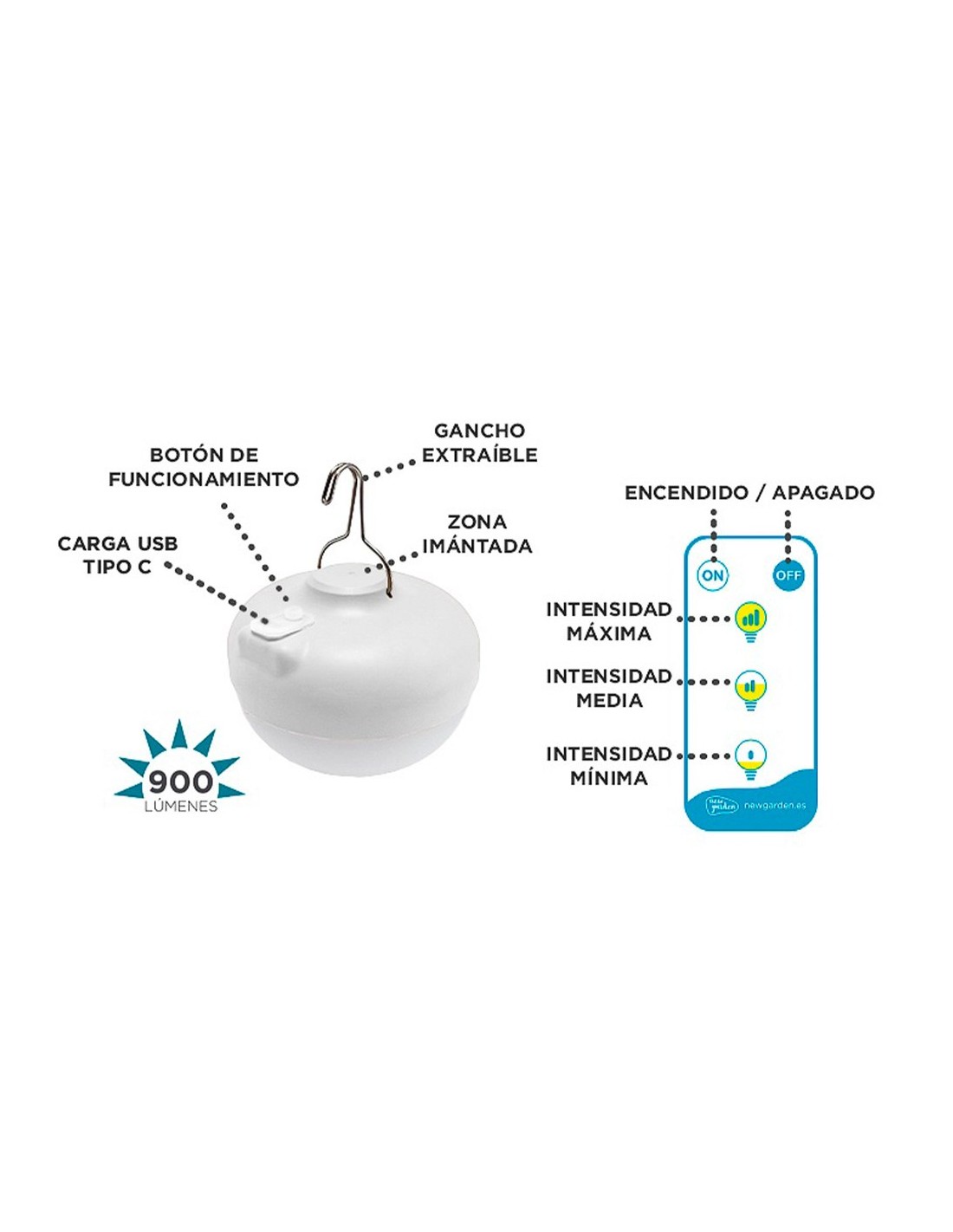 Bombilla de exterior portátil cherry, color blanco, 900 lm, 3000 k, 9 w. no necesita instalación, lleva integrado un potente imán para adherirse a cualquier superficie metálica, así como un gancho para poder colgarla. está realizada en polipropileno reciclado, dispone de luz led con 3 intensidades de luz cálida, incluye mando a distancia con alcance de 3 m, para poder encender, apagar y regular su intensidad. autonomía de entre 6 y 20 h. se carga mediante cable usb-c incluido. ø11 x 9 cm