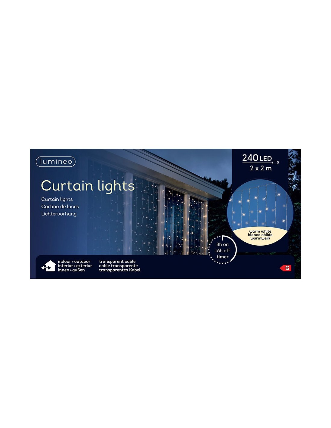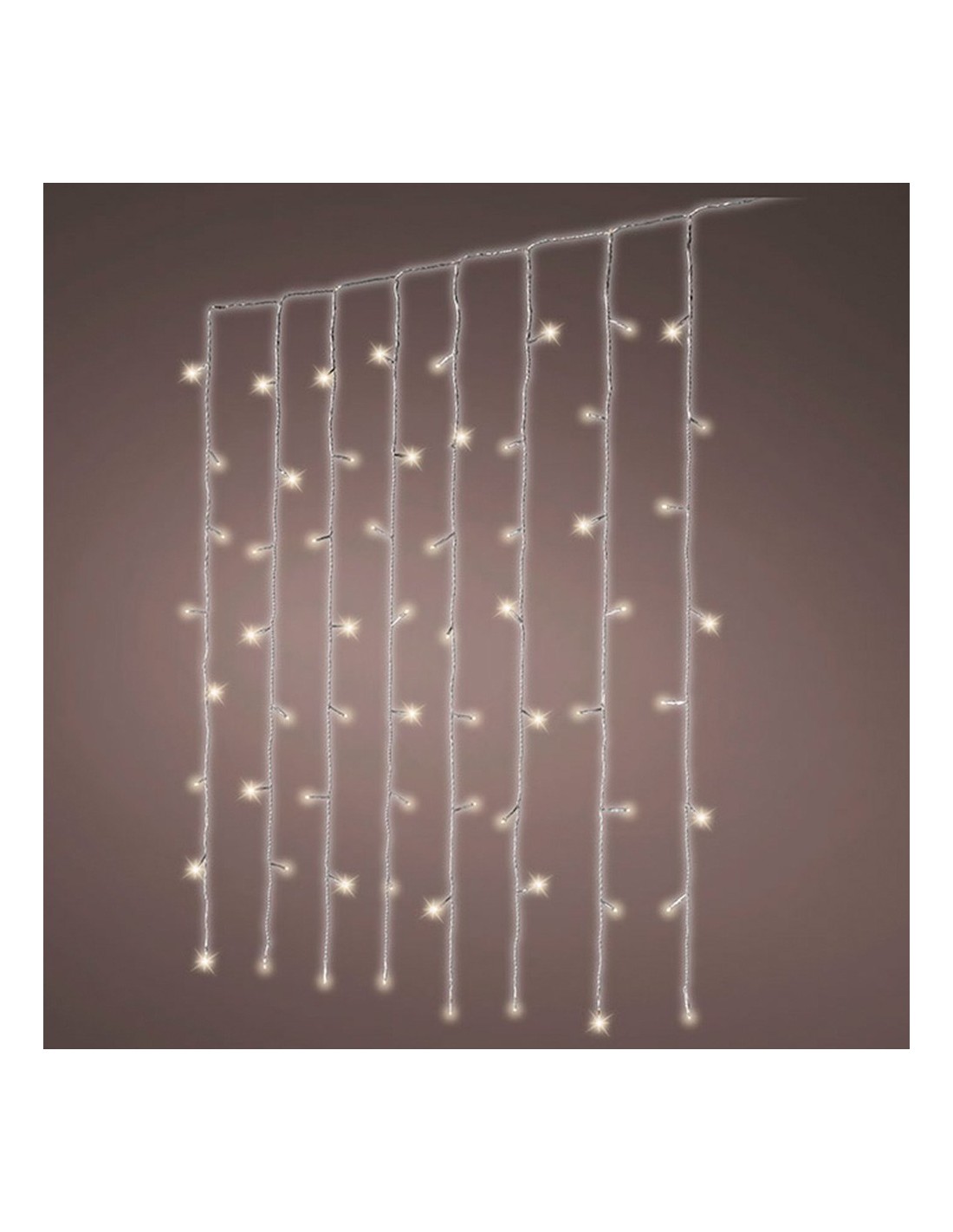 Cortina de luces led exterior blanco cálido, fija, cable transparente, 2 x 2 m. 240 leds. temporizador: 8 h encendido / 16 h apagado