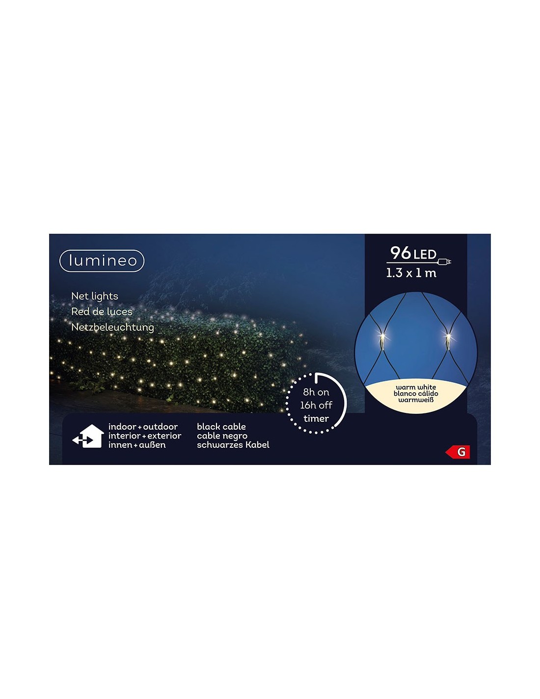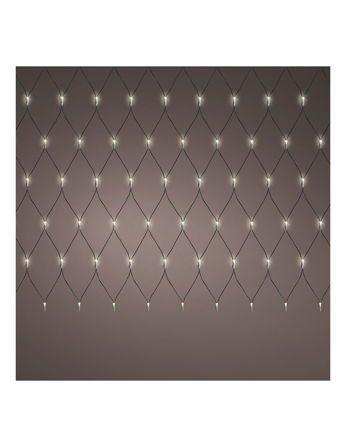 Red de luces led fija exterior, blanco cálido, cable negro, 1,3 x 1 m. 96 leds. temporizador: 8 h encendido / 16 h apagado
