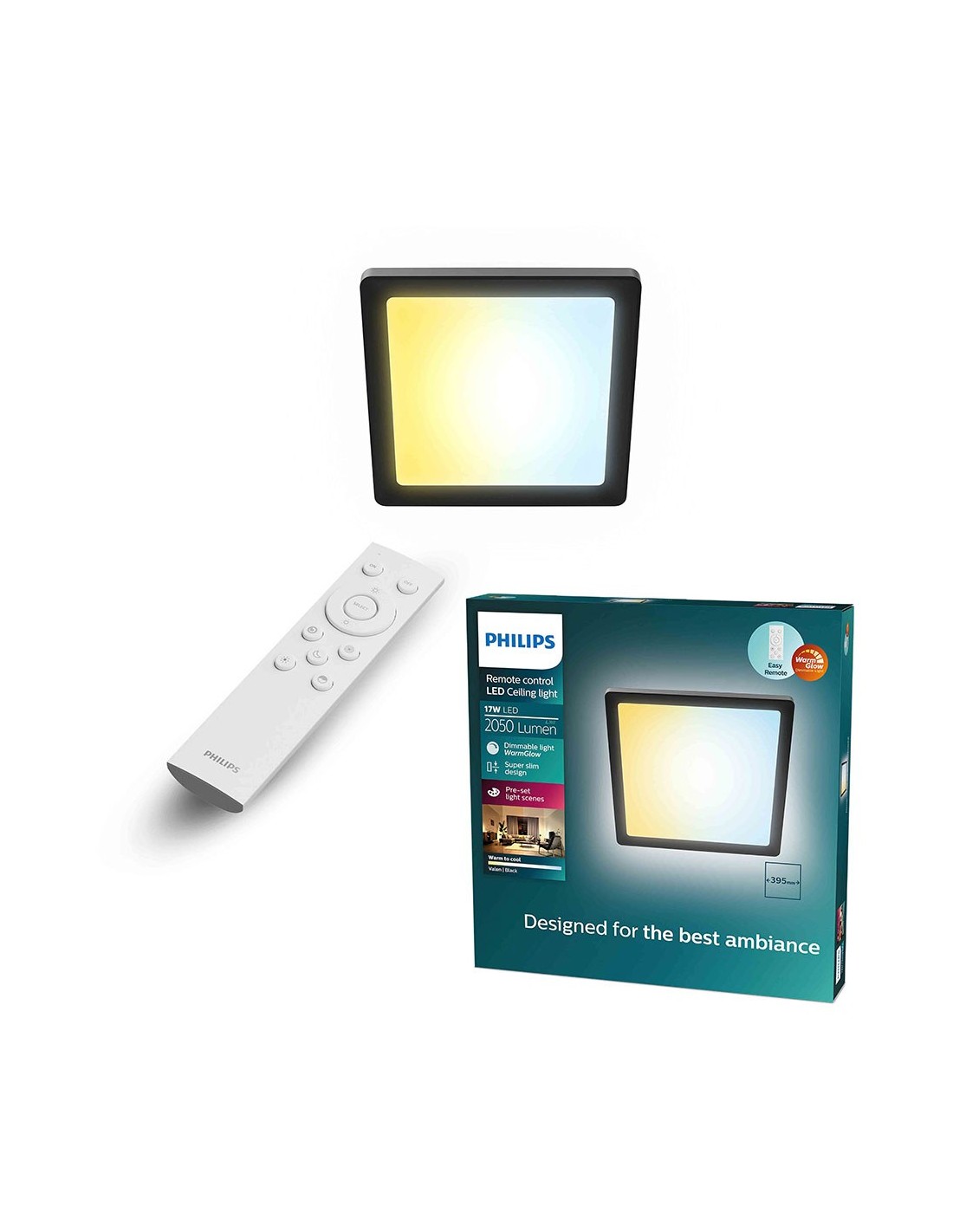 Plafón cuadrado negro, modelo valen, 17 w, 2050 lm, tipo de flujo luminoso 360°, luz regulable 2200 - 6500 k, irc 80, eficacia lumínica 120 lm/w, led integrado. tensión 220 - 240 v ~50/60 hz, grado de protección ip20, diseño superdelgado, con escenas de luz predeterminadas, material plástico. incluye mando a distancia (pilas incluidas), vida estimada 20.000 h, 395 × 37 × 395 mm
