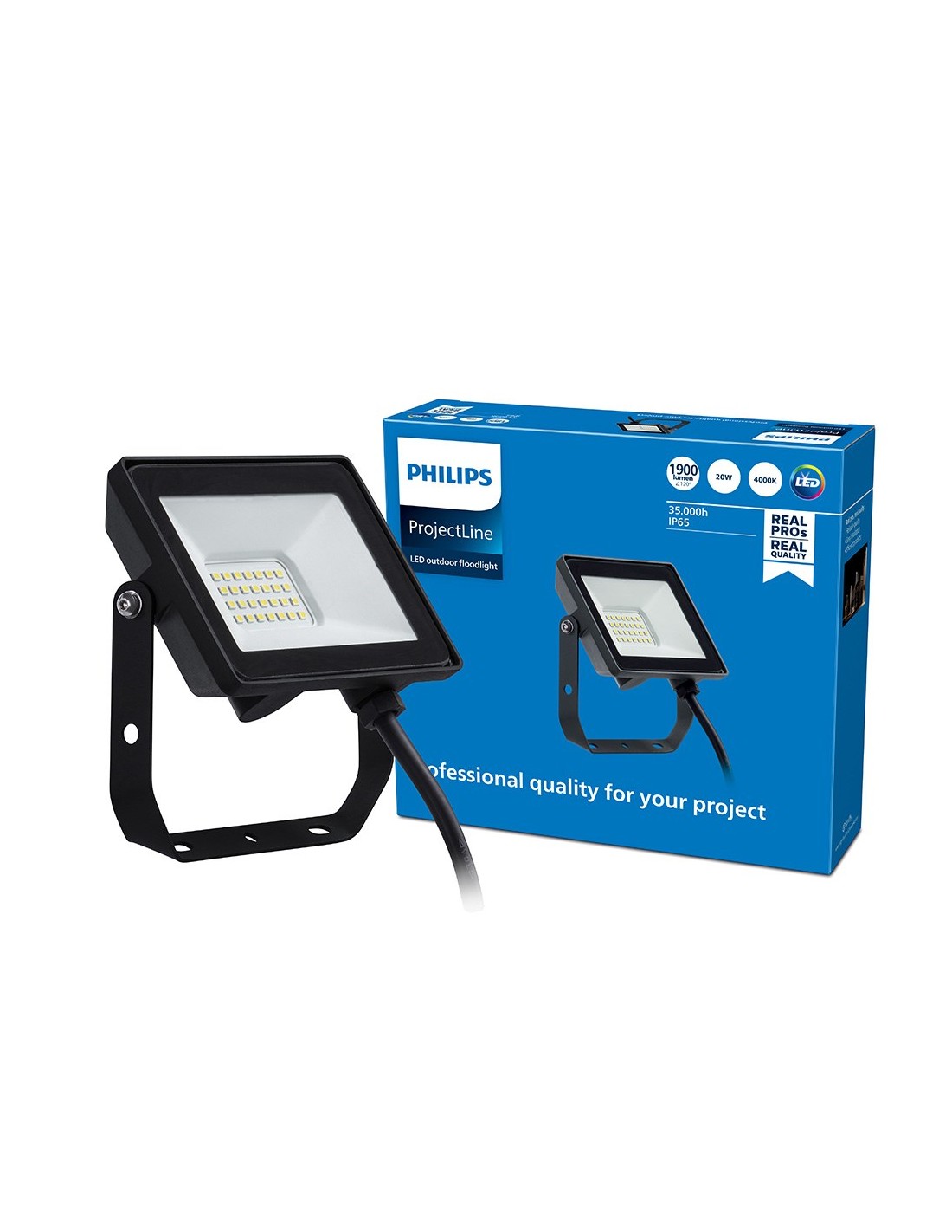 Foco proyector led, color negro, modelo projectline, 20 w, 1880 - 2000 lm, tipo de flujo luminoso 120°, eficacia lumínica 95 lm/w, luz fría 4000 k, grado de protección ip65, tensión 220 - 240 v ~50/60 hz, vida estimada 35.000 h, asa de fijación basculante. dimensiones 138 x 27 x 122 mm