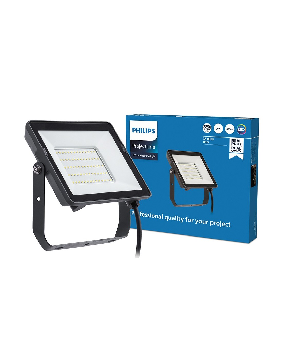 Foco proyector led, color negro, modelo projectline, 30 w, 2820 - 3000 lm, tipo de flujo luminoso 120°, eficacia lumínica 95 lm/w, luz día 4000 k, grado de protección ip65, tensión 220 - 240 v ~50/60 hz, vida estimada 35.000 h, asa de fijación basculante. dimensiones 190 x 27 x 156 mm