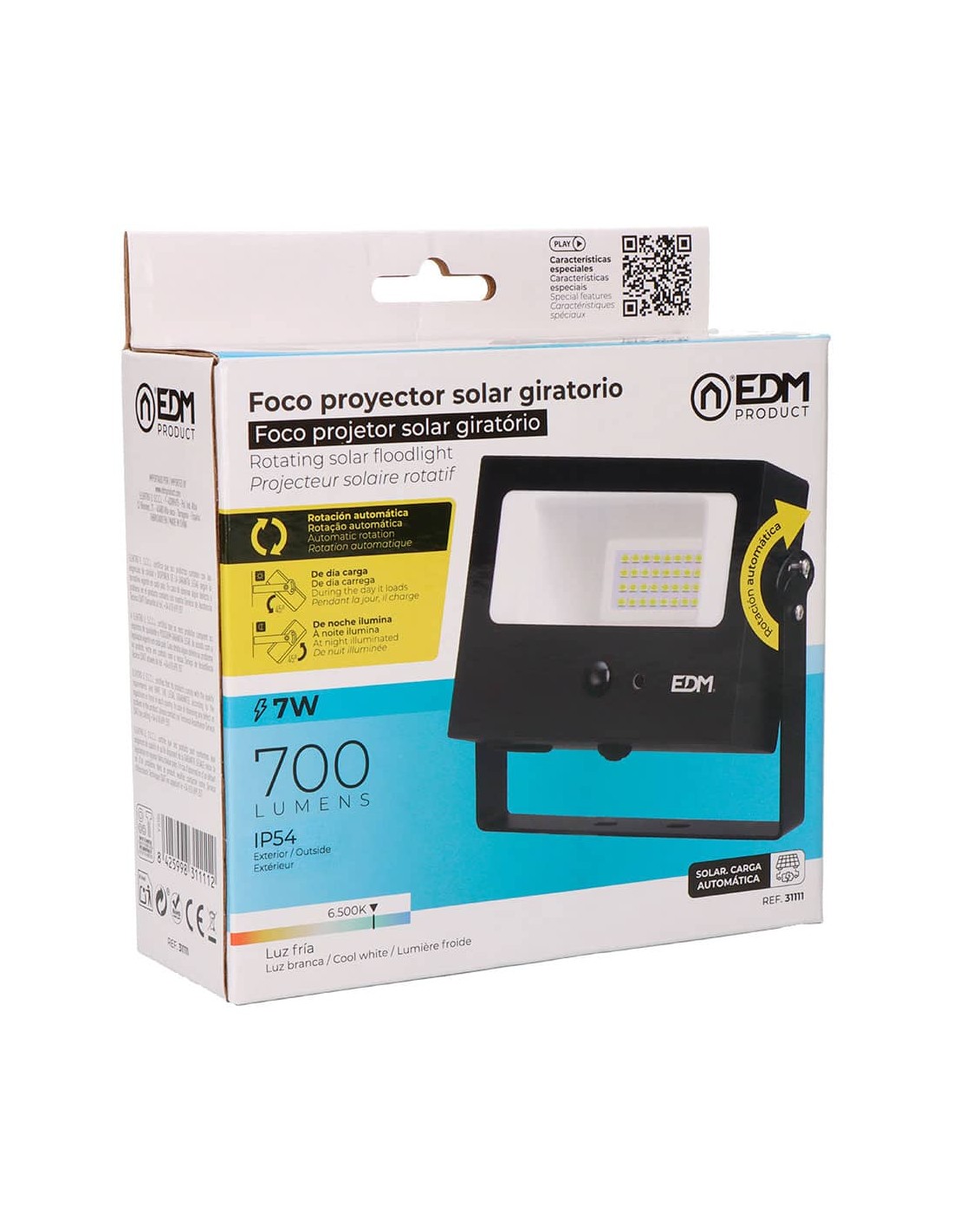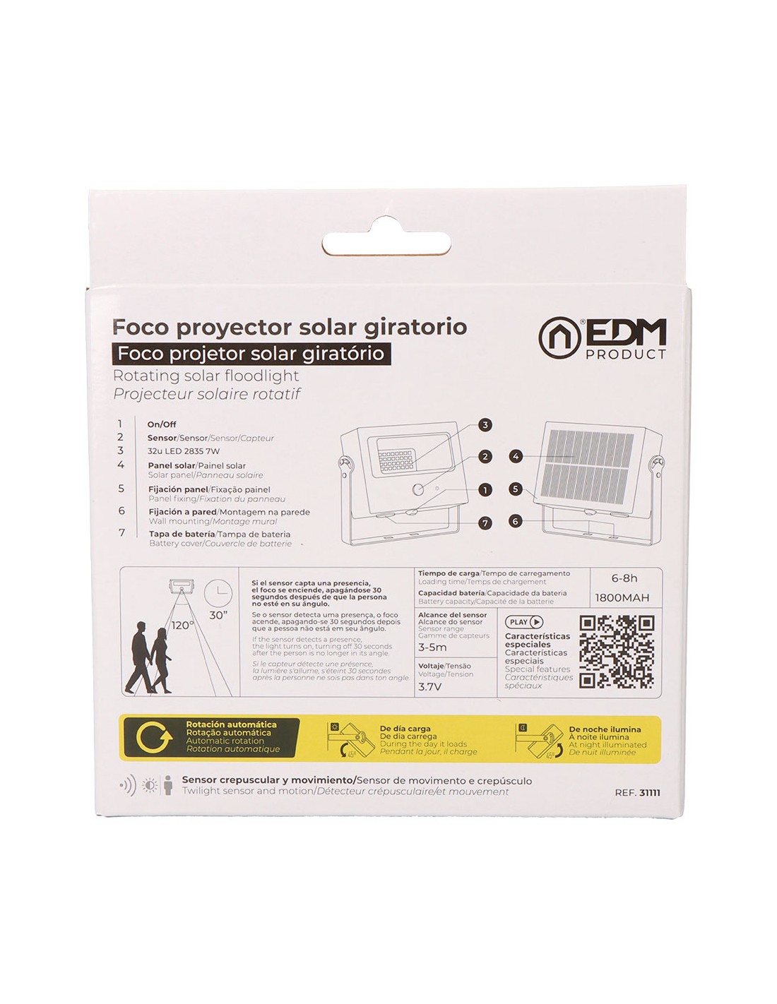 Foco proyector solar auto basculante. con seguidor solar para la gestión de la carga. luz fría, 7 w, 700 lm, 32 leds, ip54, ra 80, autonomía: 6-8 h capacidad de batería: 1800 mah 3,7 v. tiempo de carga: 6-8 h panel solar: 5 v / 1 w con sensor de movimiento: 3-5 m y crepuscular color negro dimensiones totales: 13,6 x 4,6 x 12 medida foco: 12,5 x 4 x 9 cm, incluye tornillería