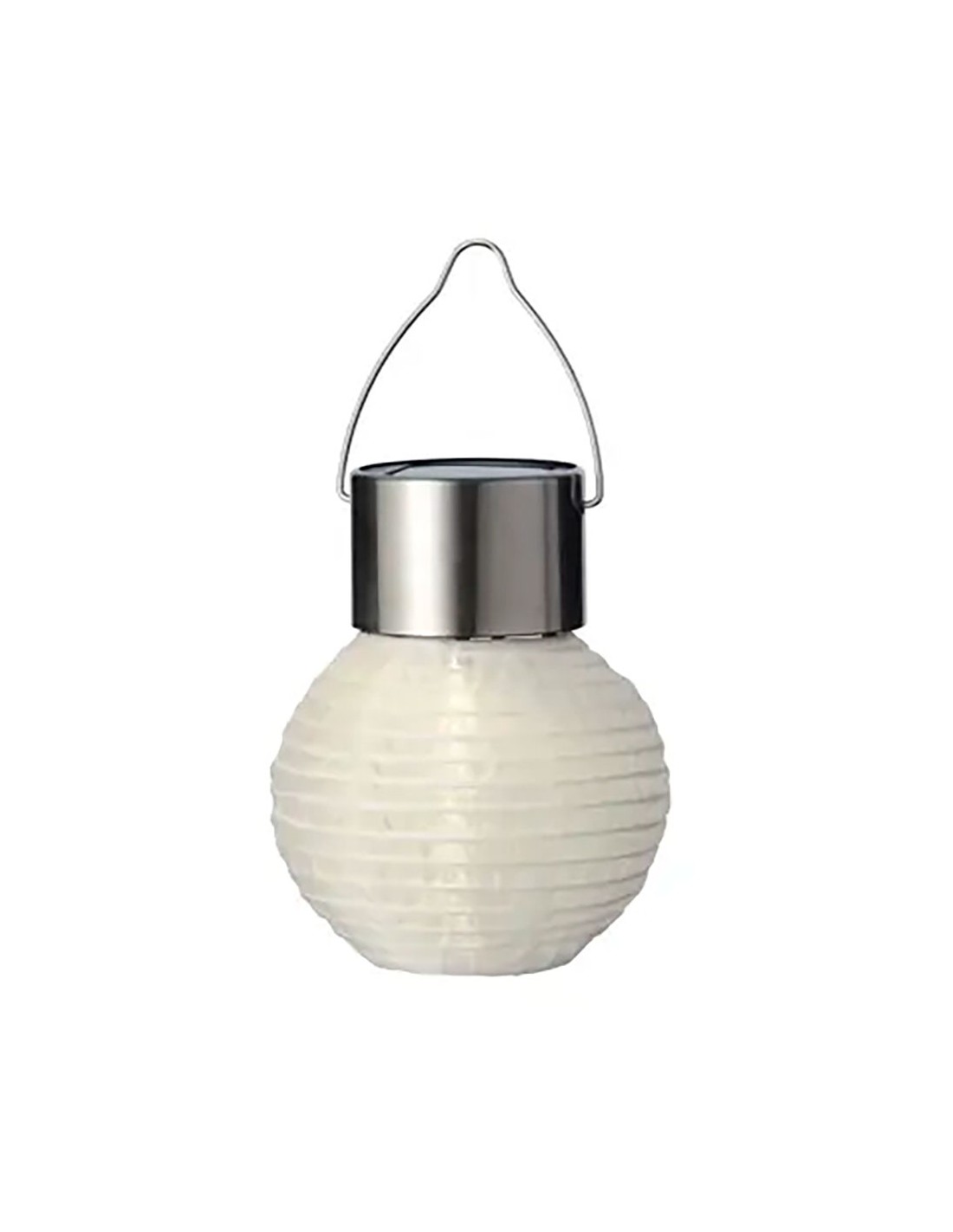 Farolillo blanco redondo solar con asa, 1 led. luz blanca cálida, función fija, con interruptor. incluye 1 x batería ni-mh 2/3aaa remplazable de 100 mah 1,2 v y panel solar 2 v, 6 h de autonomía aproximadamente. material acero inoxidable, hierro, nailon. dimensiones ø7 x 9,5 cm