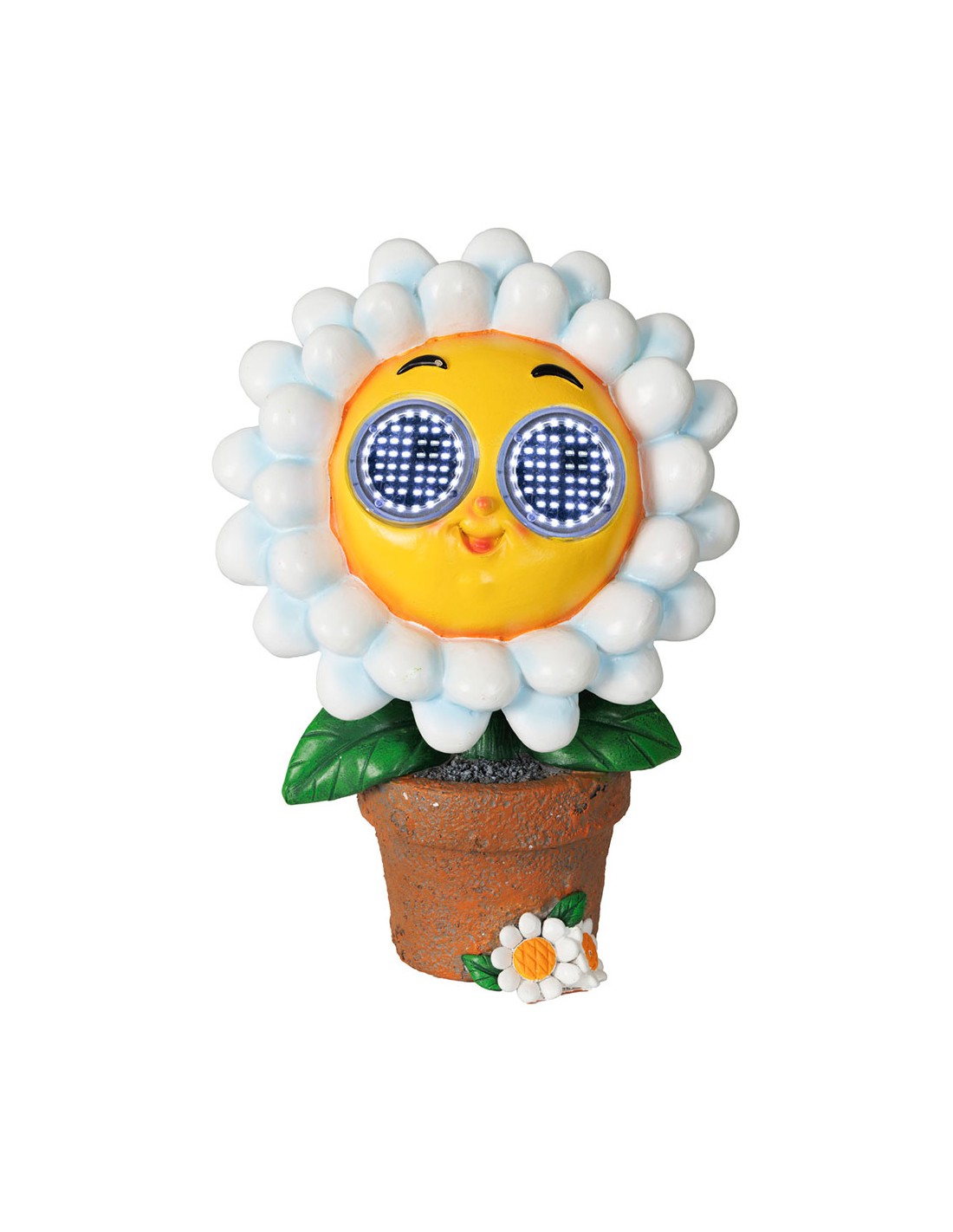 Figura girasol solar en forma de maceta, ojos con efecto giratorios. tipo de luz blanco frío, 104 led. panel solar 2v. 1 batería aa de 300 mah remplazable 1,5 v. 6 h de autonomía aproximadamente. con interruptor. material resina. uso exterior. dimensiones 15,5 x 10,5 x 22 cm