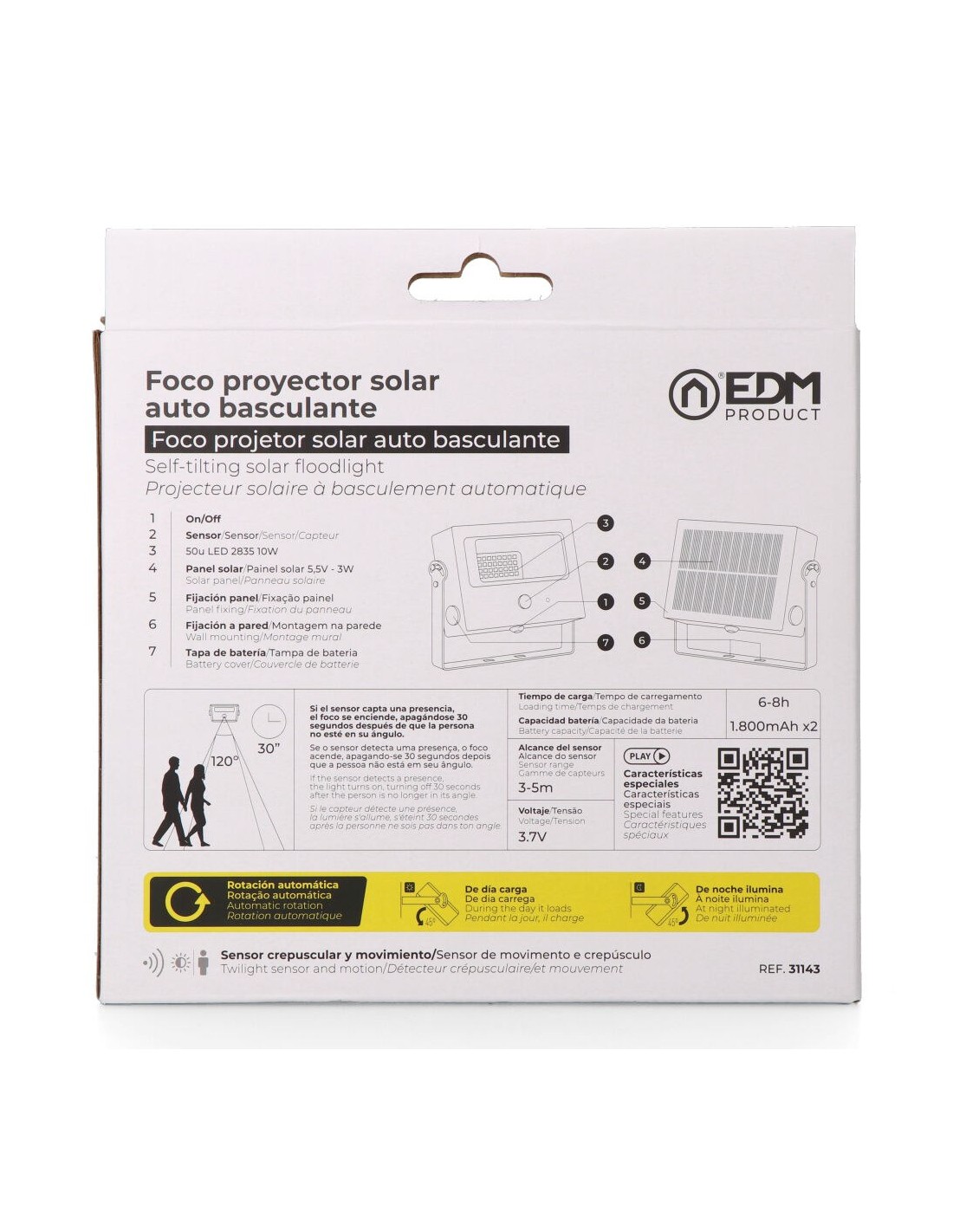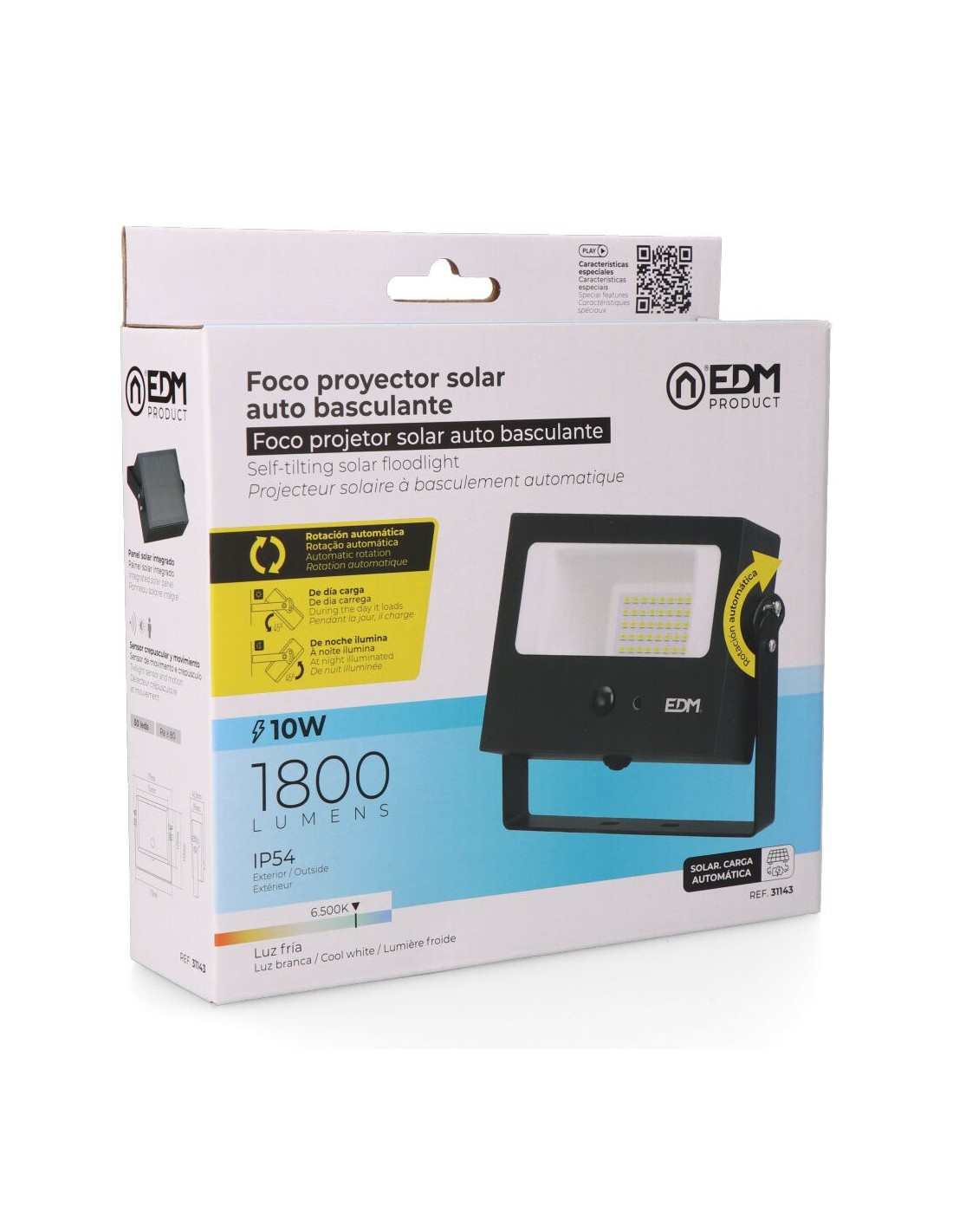 Foco proyector solar auto basculante, con seguidor solar para la gestión de la carga luz fría, 10 w, 1800 lm, 6500 k, 50 leds, ip54, ra 80, autonomía: 6-8 h capacidad de batería: 1800 mah 3,7 v tiempo de carga: 6-8 h panel solar: 5,5 v / 3 w con sensor de movimiento: 3-5 m y crepuscular color negro medida foco: 15,6 x 4 x 12 cm incluye tornillería