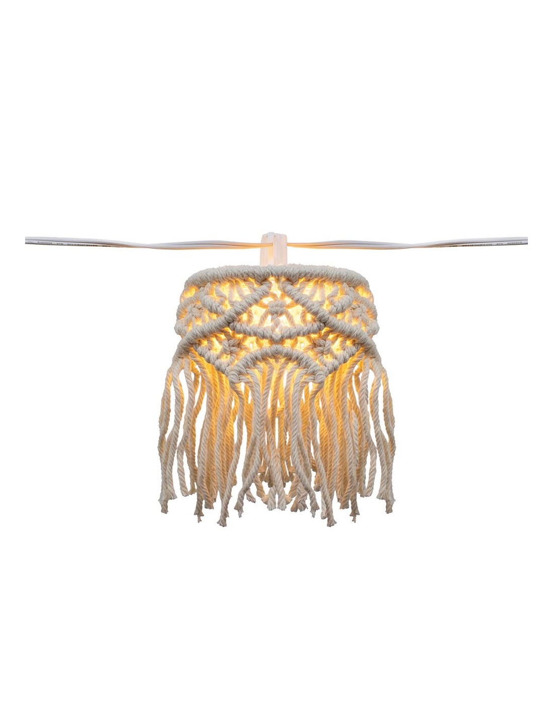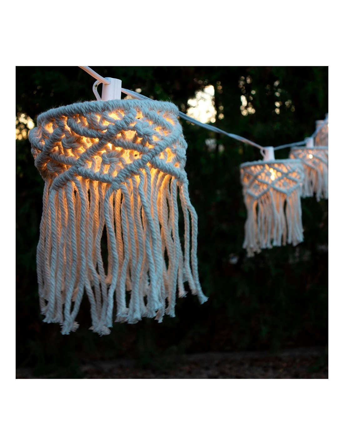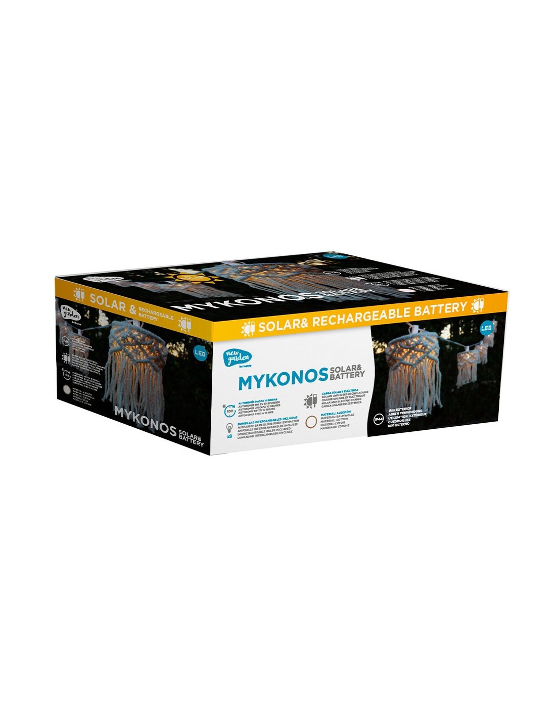 Guirnalda solar mykonos 2700 k. luz cálida con intensidad de 280 lm repartidos en 35 lm por cada una de las 8 bombillas. 8 tulipas de algodón con diseño tipo macramé en color crudo que aportan un estilo natural. bombillas intercambiables con casquillo e12. incluye 2 bombillas de recambio. longitud total de 8 m que incluye 5 m con iluminación y 3 m de cable. potencia de entrada total 3 w. potencia por cada led: 0,2 w. batería de 2600 mah 3,7 v. doble sistema de carga solar y eléctrica. incluye cable de carga usb-c. grado de protección ip44 para uso en exterior bajo techo. autonomía de hasta 10 h. permite conectar hasta 4 guirnaldas