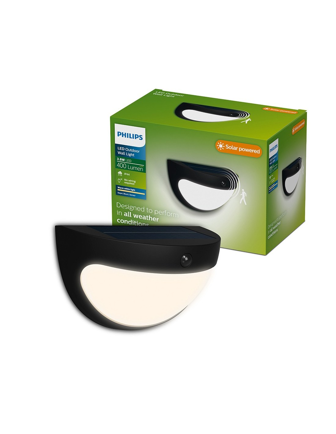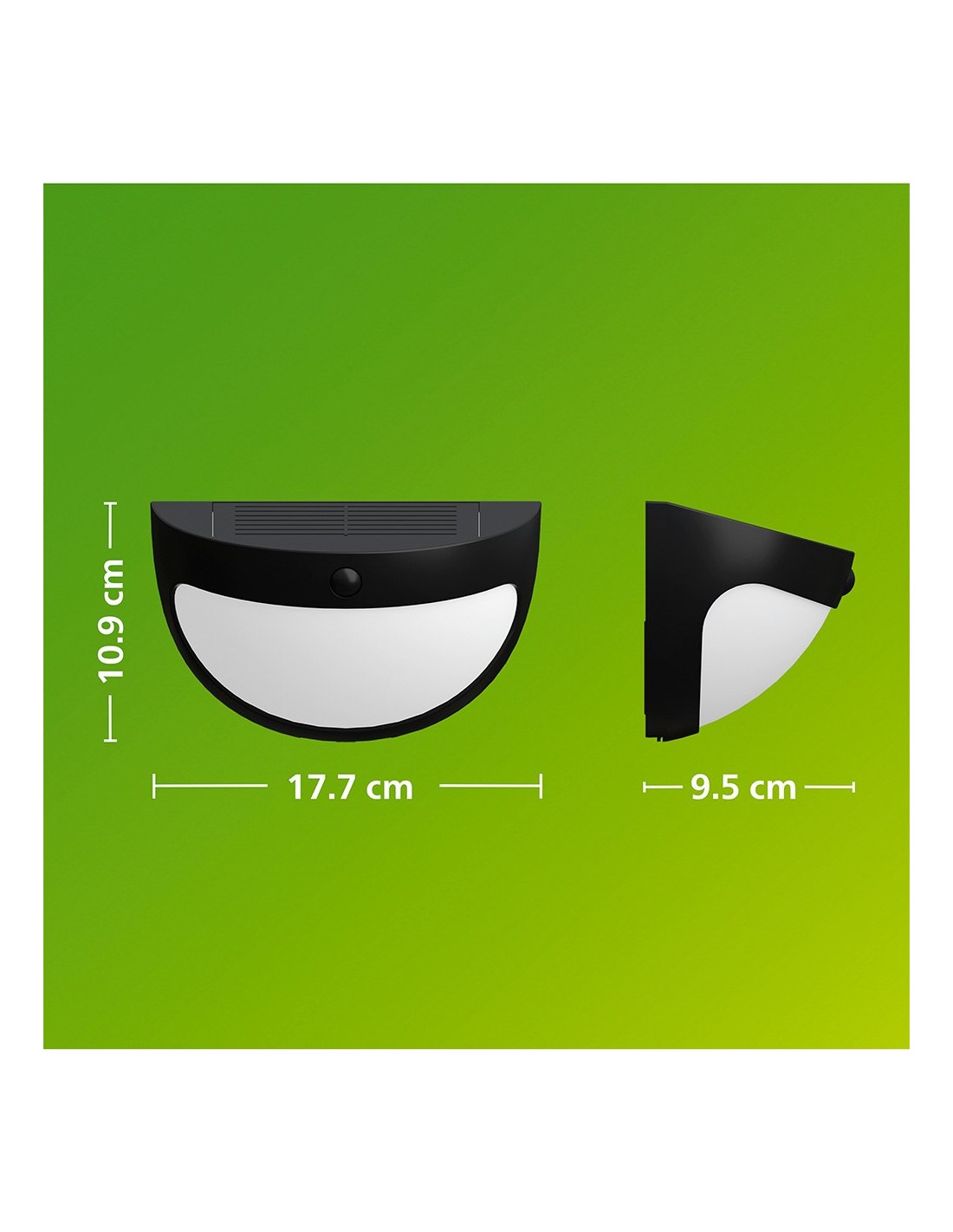 Aplique led solar, modelo swyn, color negro, 3,8 w, 4 v, 400 lm y 10 lm en reposo, tipo de flujo luminoso 360 °, para exterior ip44, luz cálida 2700 k, con sensor de movimiento y crepuscular, material de plástico, vida útil 25.000 h, incluye elementos de fijación, dimensiones 177 x 95 x 95 mm