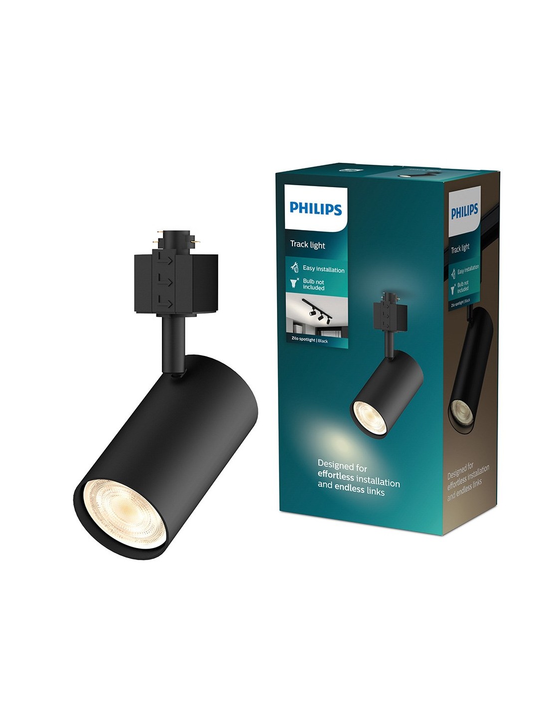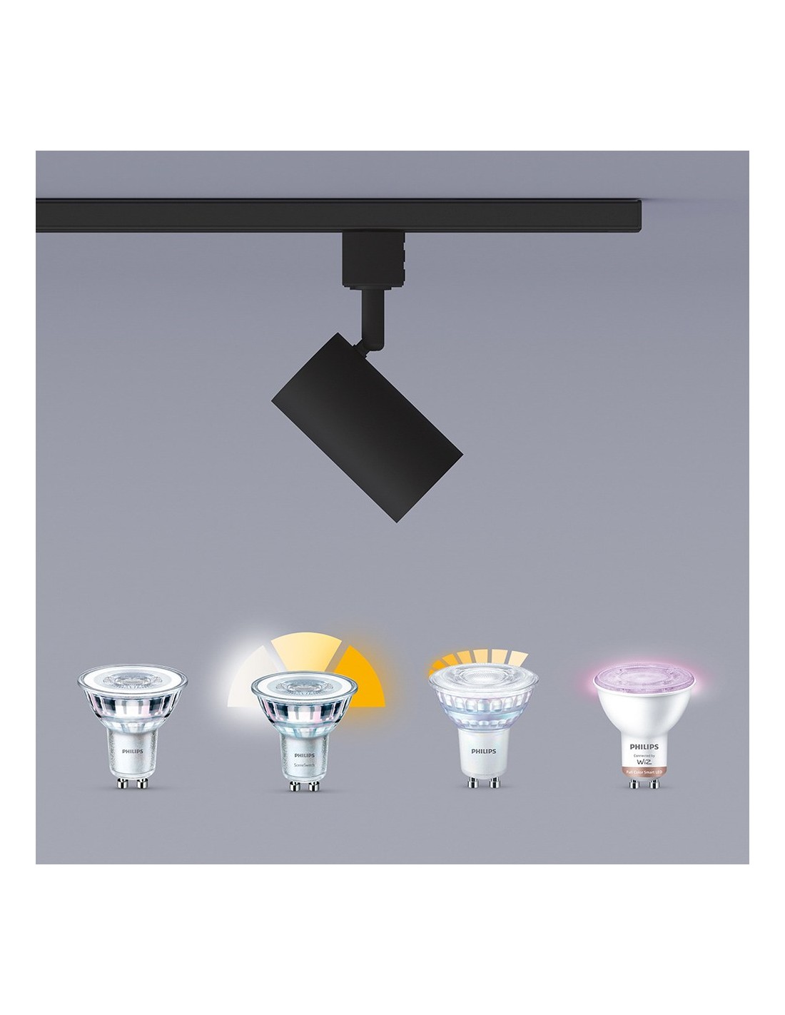 Foco easylink, modelo zilo, color negro, máximo 5 w, casquillo gu10 (bombilla no incluida), cable de tierra integrado, cabezal orientable para dirigir la luz según la necesidad. fabricado en aluminio de alta calidad, compatible con riel philips easylink en h de 3 cables (se vende por separado), y con bombillas led inteligentes y clásicas (opciones de regulación y temperatura de color según bombilla, disponibles por separado). totalmente compatible con el resto de componentes easylink, 220 - 240 v ~50/60 hz, dimensiones ø55 × 138 mm