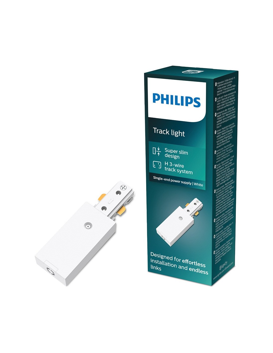 Fuente de alimentación individual, blanca, se utiliza para conectar el sistema de rieles easylink a la corriente eléctrica en el punto del techo deseado. 220 - 240~ 50/60 hz 8a, máx. 1800 w. compatible con el resto de componentes easylink, dimensiones 35 x 17 x 110 mm