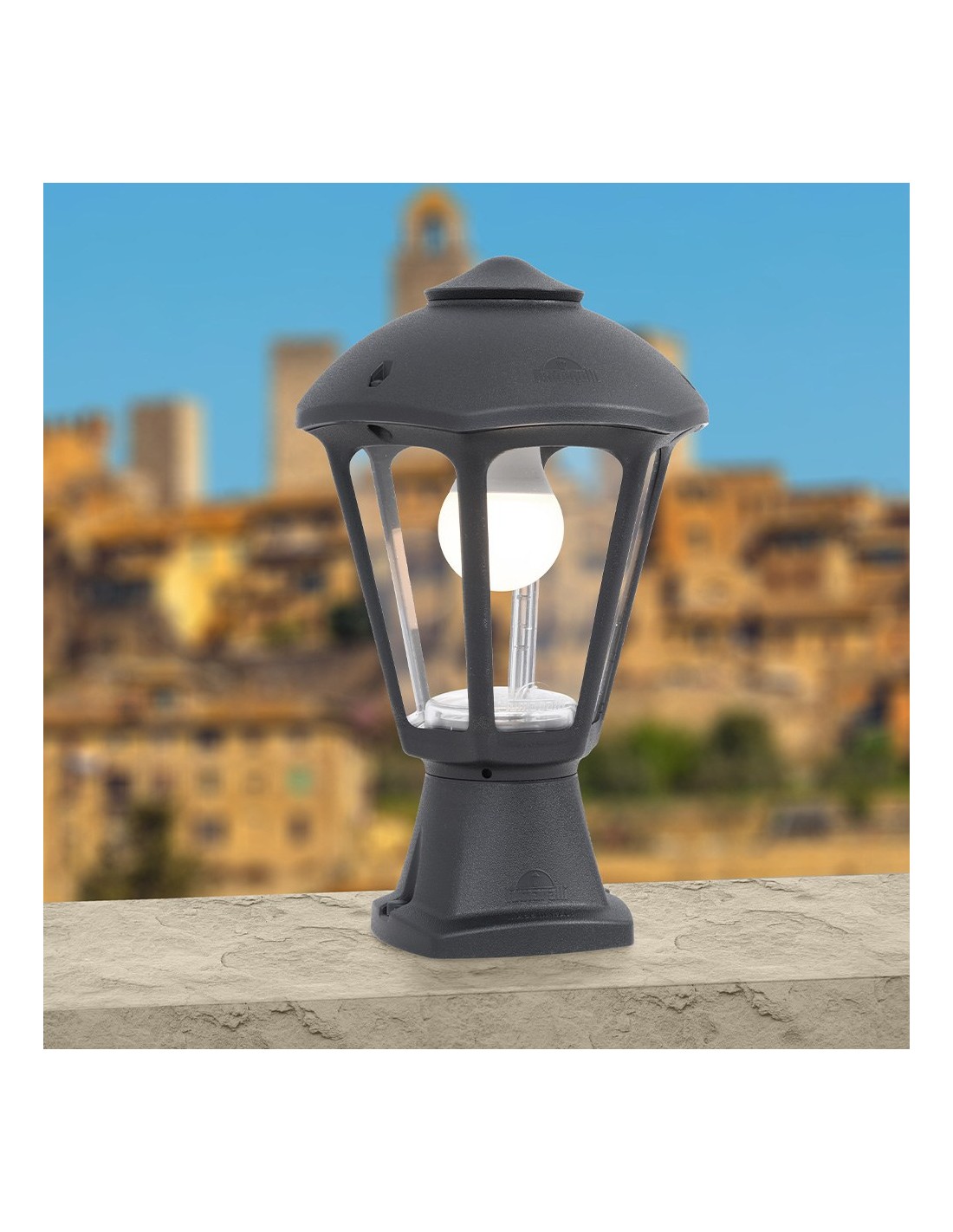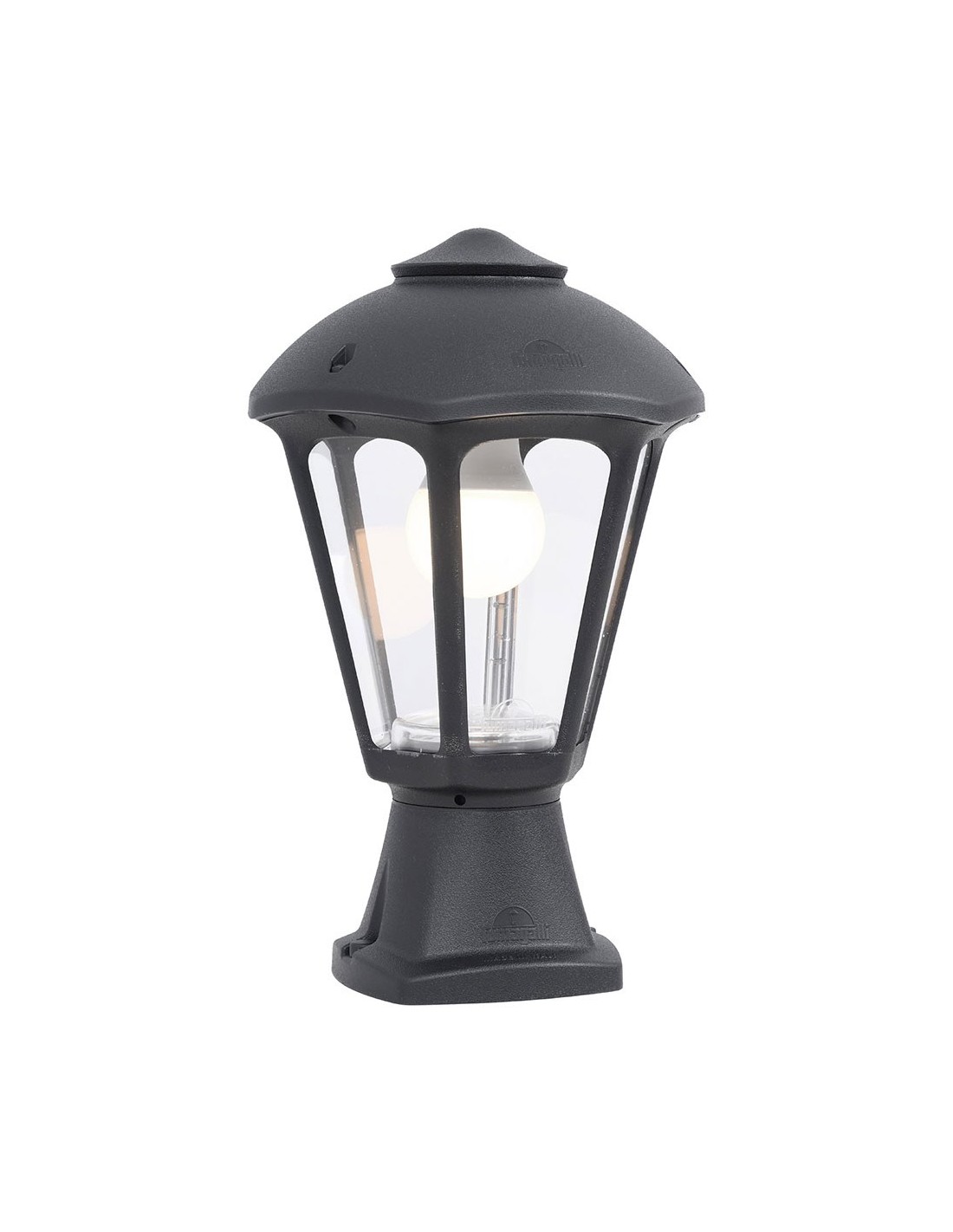 Farol sobremuro, modelo disma/giampy, color negro con cristal transparente, tensión 220 - 240 v ~50/60 hz, casquillo e27, máximo 23 w, longitud máxima bombilla 130 mm, bombilla no incluida, grado de protección ip55, hecho de resina resistente uv, anticorrosión y antióxido. incluye elementos de fijación. ø210 x 330 mm