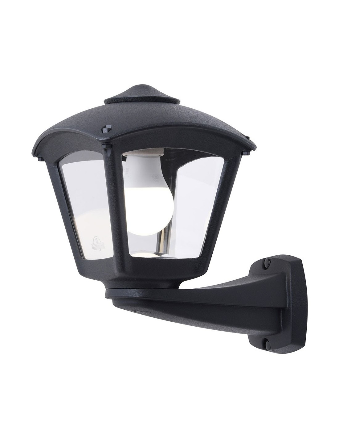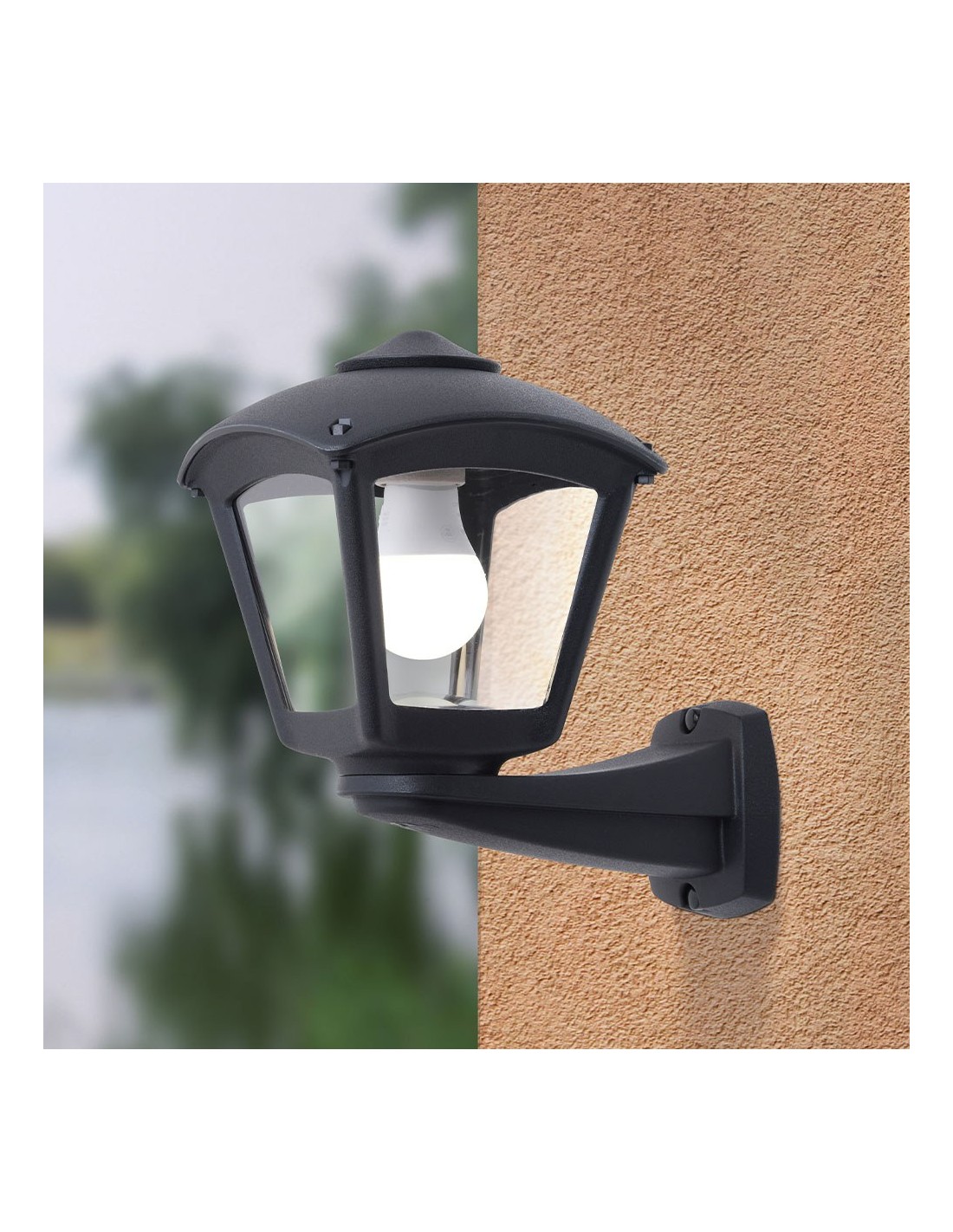 Farol de pared con brazo, modelo nardo/roby, color negro con cristal transparente, tensión 220 - 240 v ~50/60 hz, casquillo e27, máximo 23 w, longitud máxima bombilla 130 mm, bombilla no incluida, grado de protección ip55, hecho de resina resistente uv, anticorrosión y antióxido. incluye elementos de fijación. 195 x 260 x 275 mm