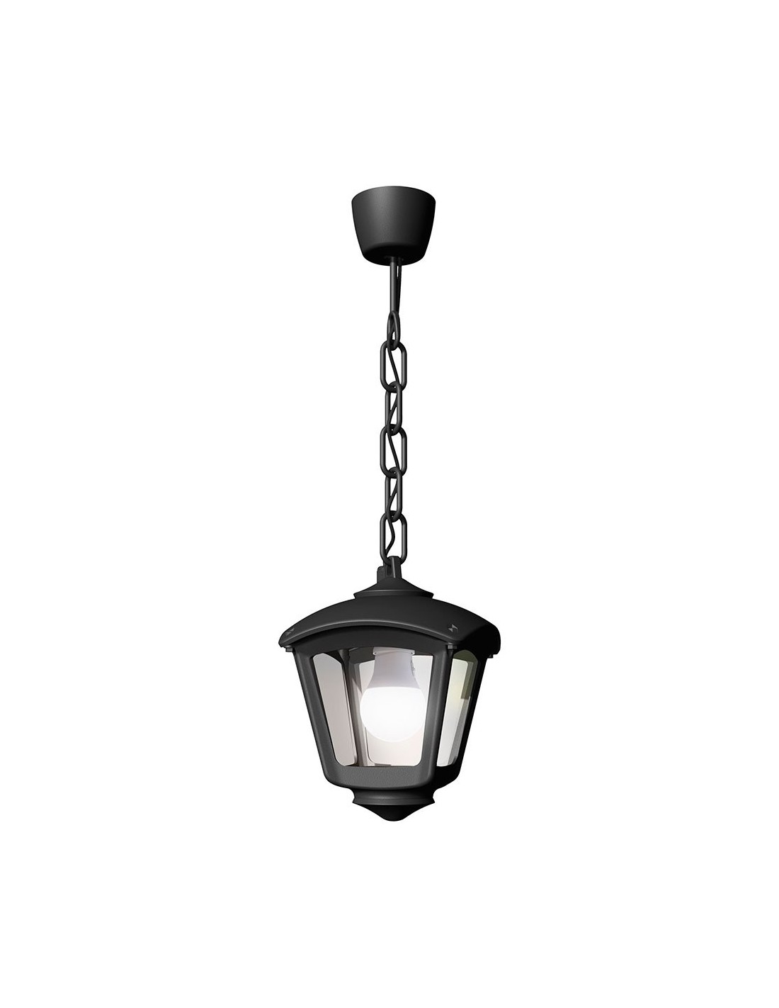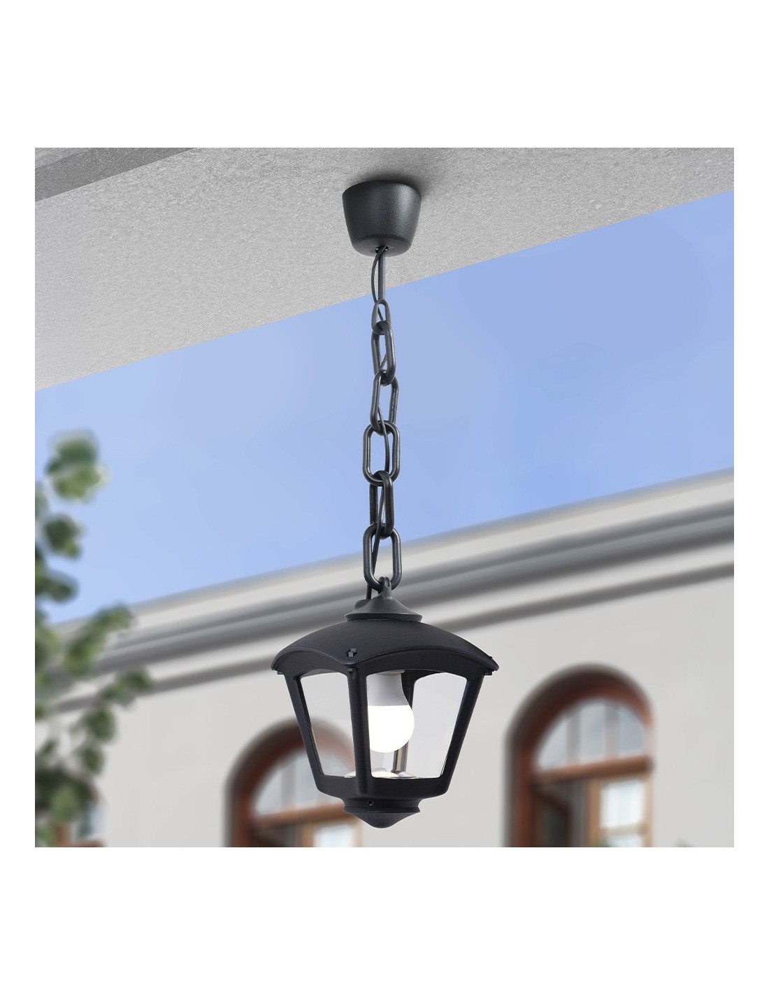 Farol de techo con cadena, modelo sicar/roby, color negro con cristal transparente, tensión 220 - 240 v ~50/60 hz, casquillo e27, máximo 23 w, longitud máxima bombilla 120 mm, bombilla no incluida, grado de protección ip55, hecho de resina resistente uv, anticorrosión y antióxido. 195 x 195 x 700 mm