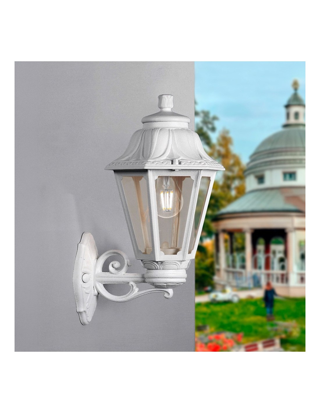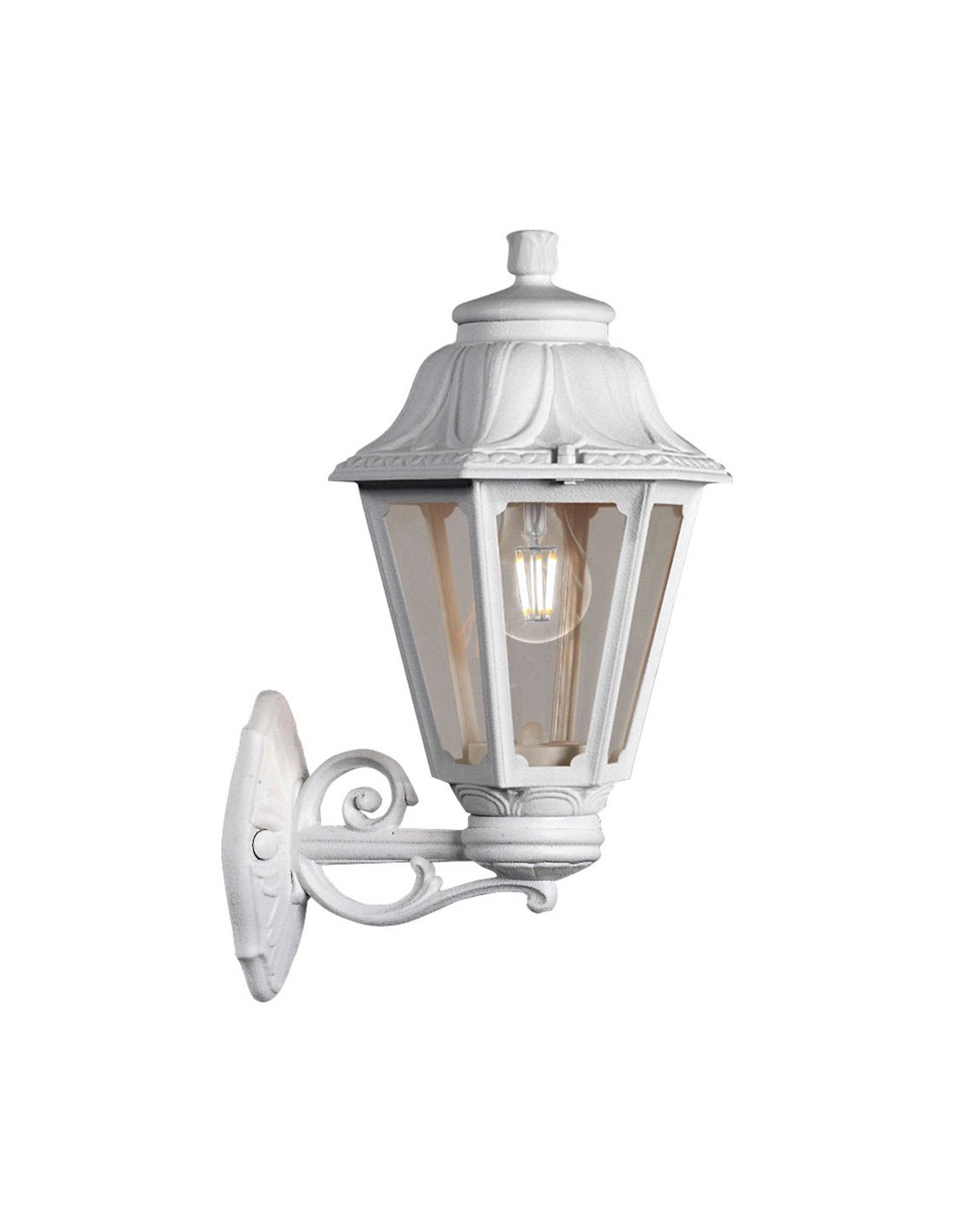 Farol de pared con brazo, modelo bisso/anna, color blanco con cristal transparente, tensión 220 - 240 v ~50/60 hz, casquillo e27, máximo 23 w, longitud máxima bombilla 130 mm, bombilla no incluida, grado de protección ip55, hecho de resina resistente uv, anticorrosión y antióxido. incluye elementos de fijación. 220 x 275 x 450 mm