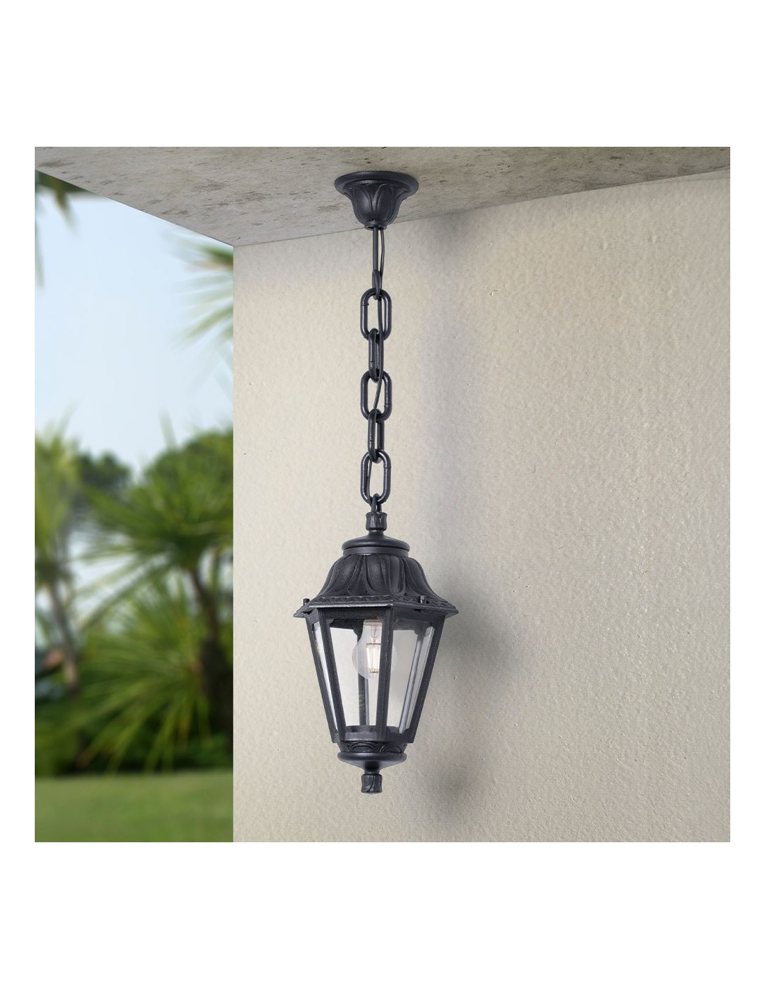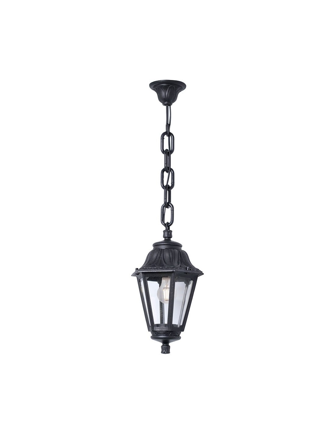 Farol de techo con cadena, modelo sichem/anna, color negro con cristal transparente, tensión 220 - 240 v ~50/60 hz, casquillo e27, máximo 23 w, longitud máxima bombilla 130 mm, bombilla no incluida, grado de protección ip55, hecho de resina resistente uv, anticorrosión y antióxido. ø220 x 800 mm