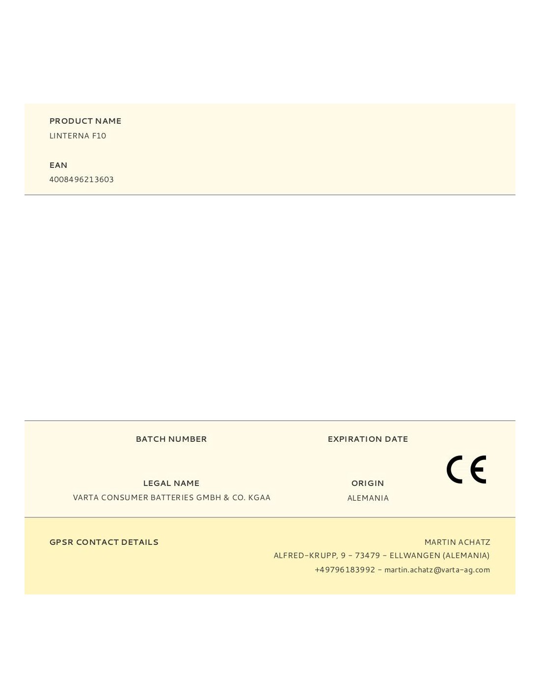 Linterna f10 pro, led de alto rendimiento, 50 im, interruptor mecánico trasero. rango del foco 20 m, autonomía 5 h, material aluminio, pc, goma de silicona. funciona con pila 1 x longlife power aa (noincluida). dimensiones: ø25 mm cabezal, longitud 100 mm