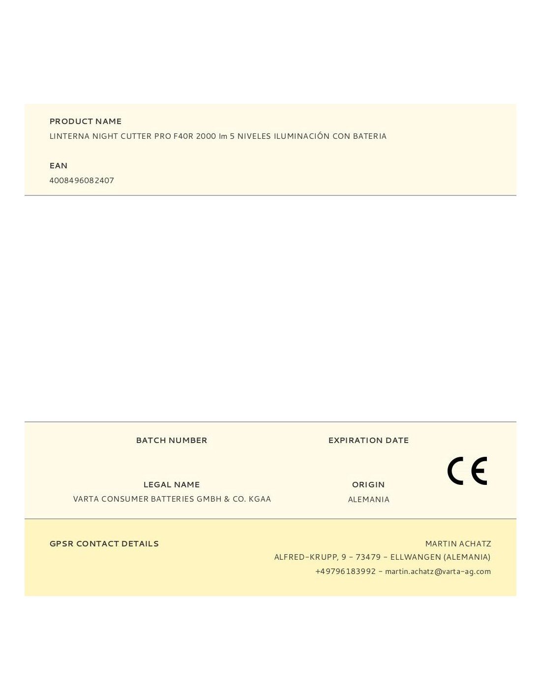 Linterna night cutter f40r pro, 2000 lm, ip67. niveles de iluminación 5: turbo, alta, media, baja y estroboscópica. rango de foco 350 m, sistema de enfoque de precisión. autonomía 5 horas. luz roja indicadora de batería. material aluminio, pc. bateria de litio 5200 mah, función power bank, recargable con cable de carga usb-c (incluido), incluye cuerda para sujetar en la muñeca, dimensiones: ø44 mm del cabezal, longitud 233 mm