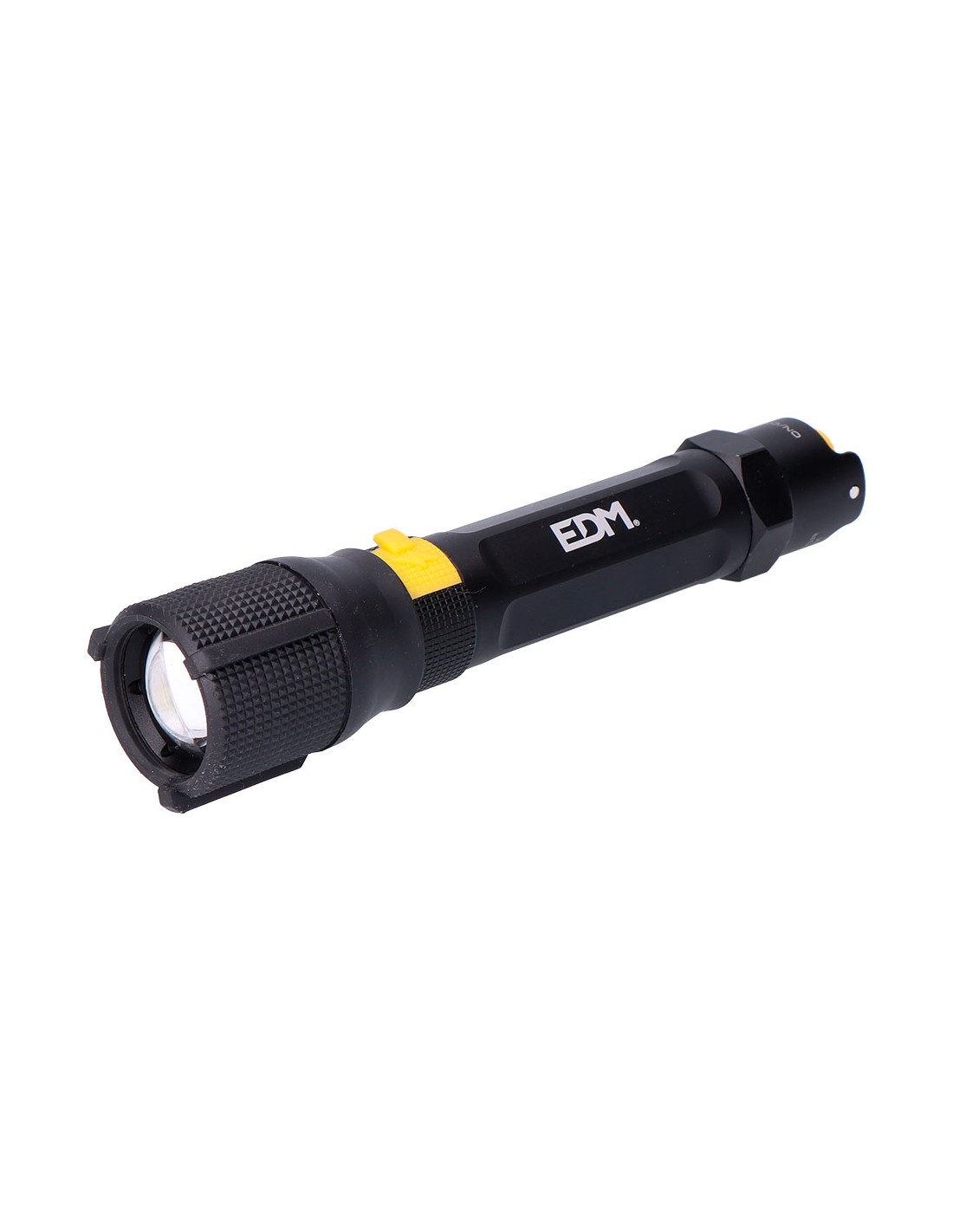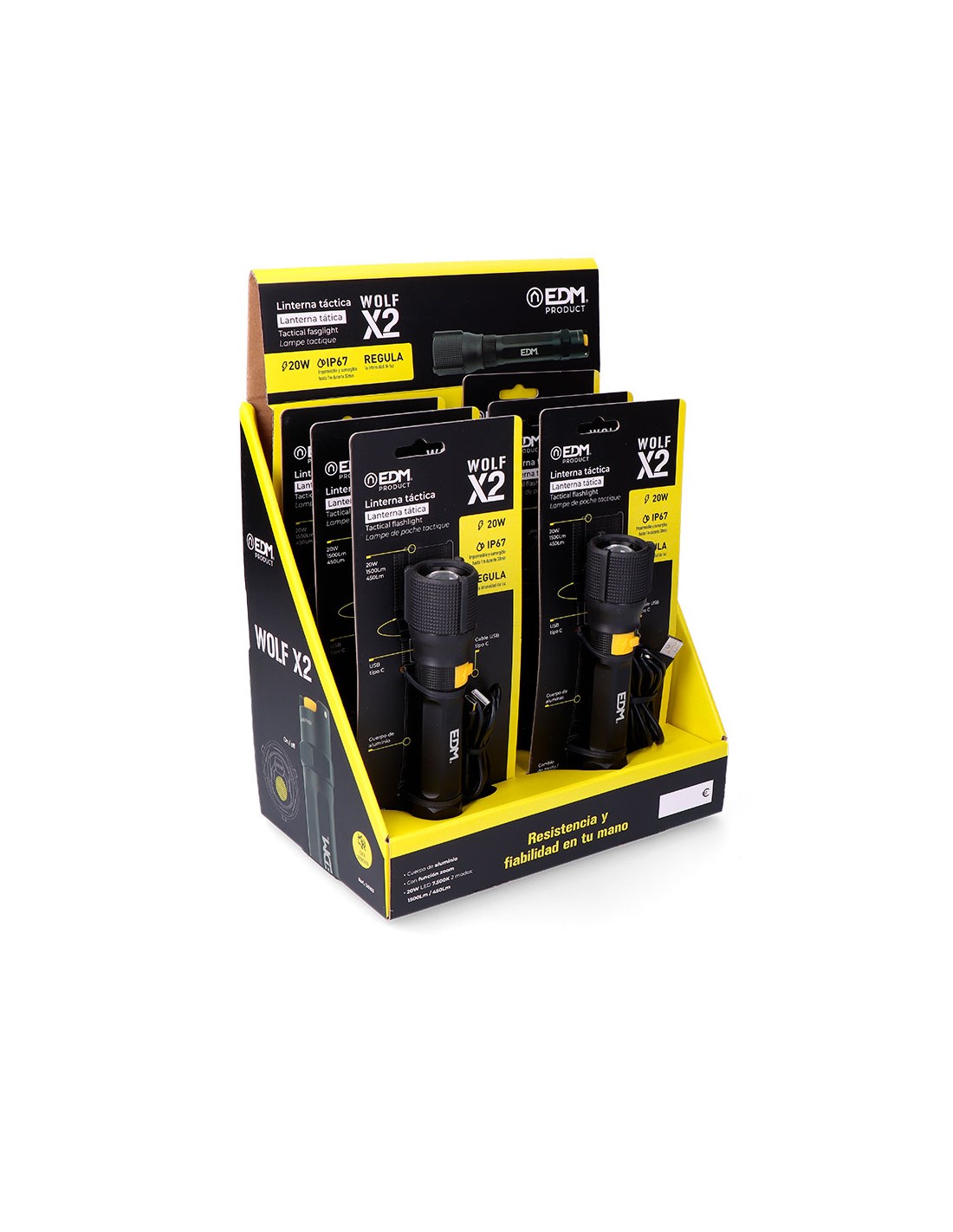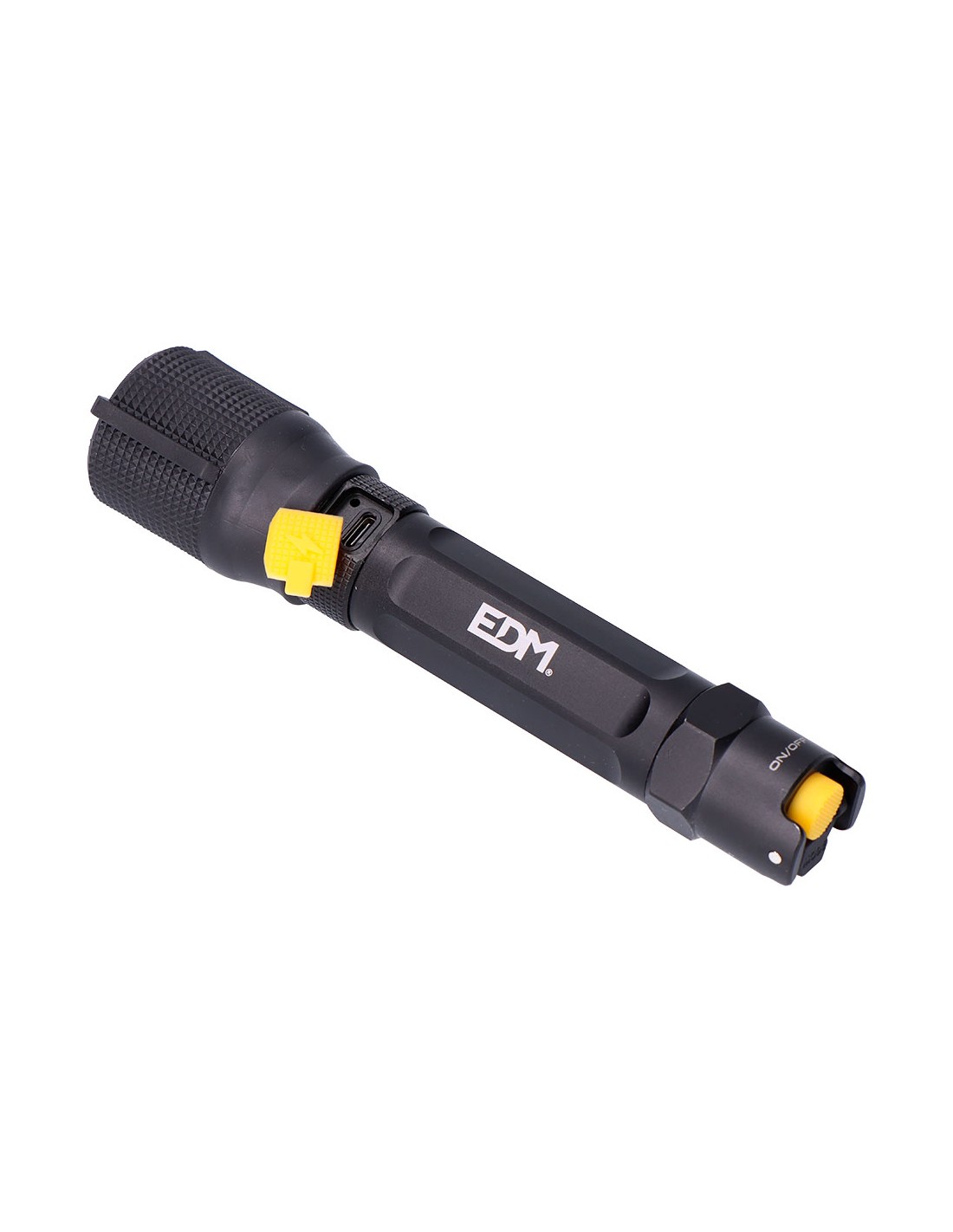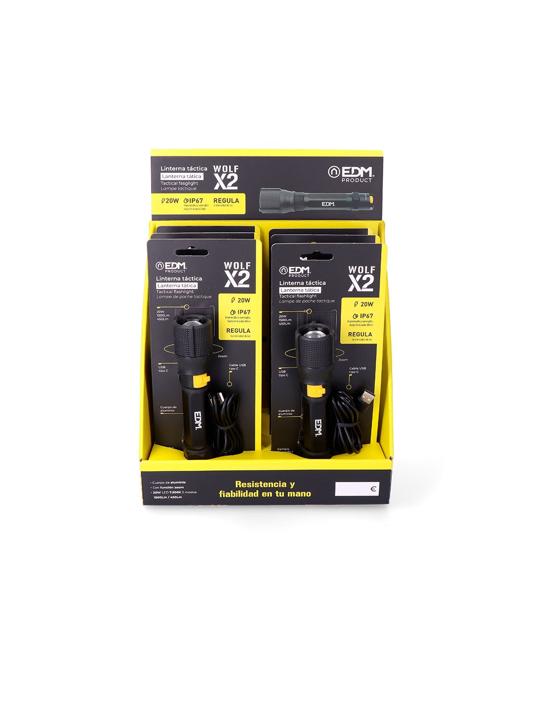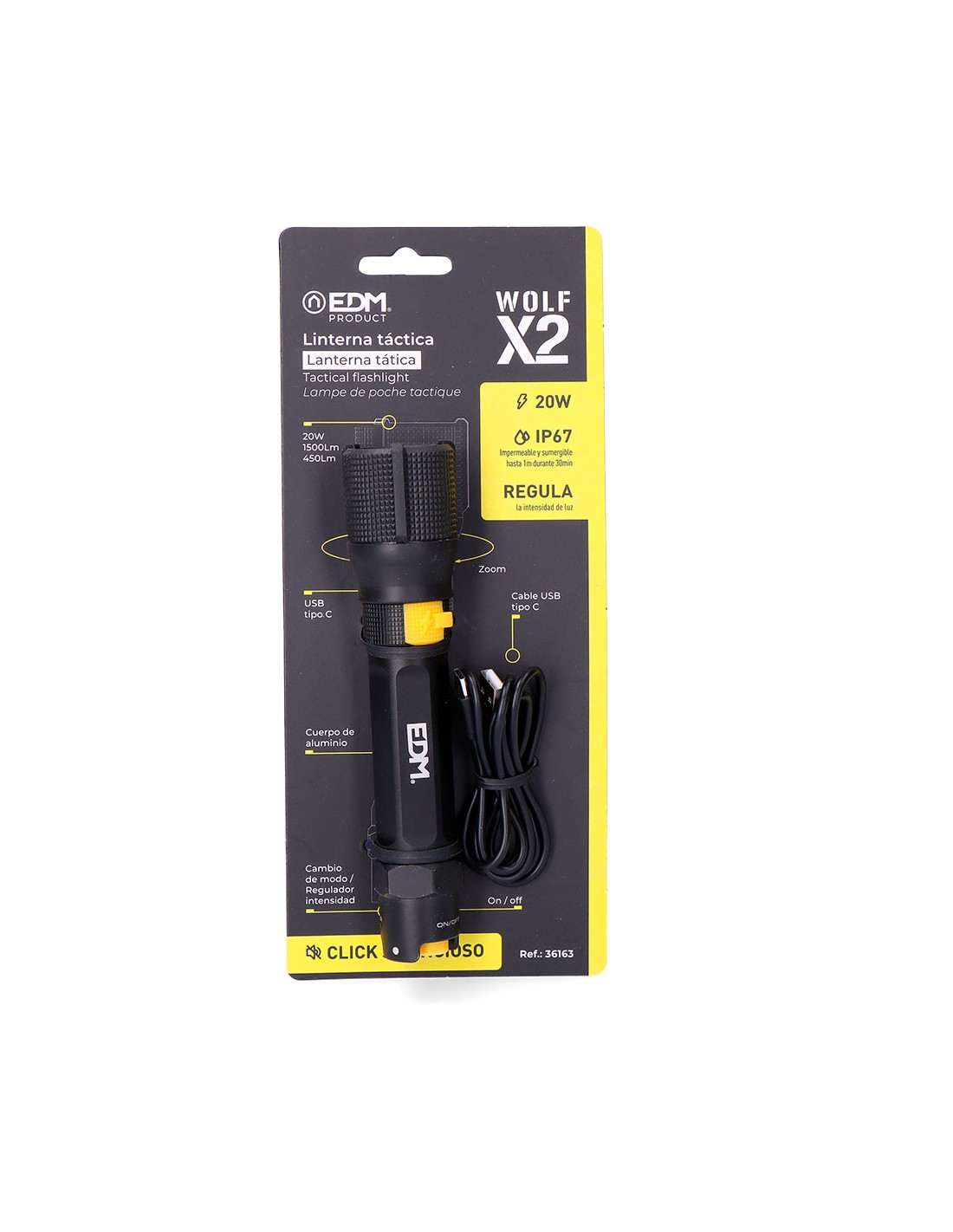Linterna led táctica recargable de 20 w, 7500 k modos brillo: 1500 lm / 450 lm / flash con regulador de intensidad función zoom botón táctico silencioso on / off batería 2600 mah de litio incluida cable usb tipo c incluido hasta 8 h de autonomía carga de 6 h cuerpo de aluminio ip67 sumergible hasta 1 m durante 30 min dimensiones ø40 x 178 mm, presentada en expositor de 6 uds