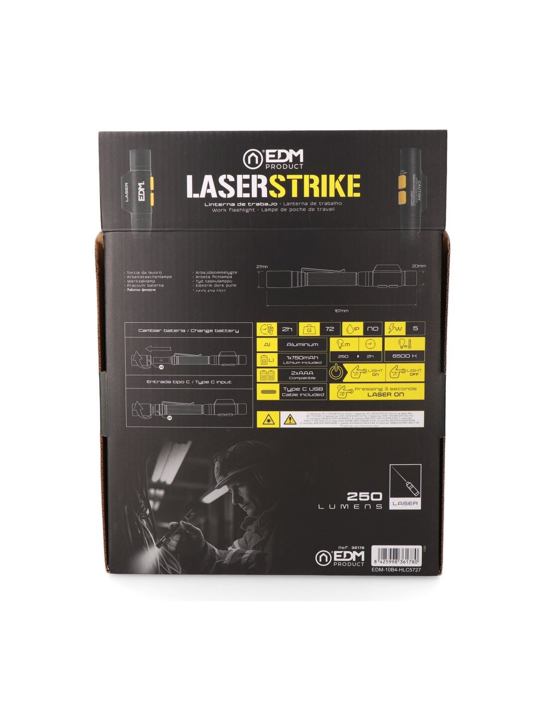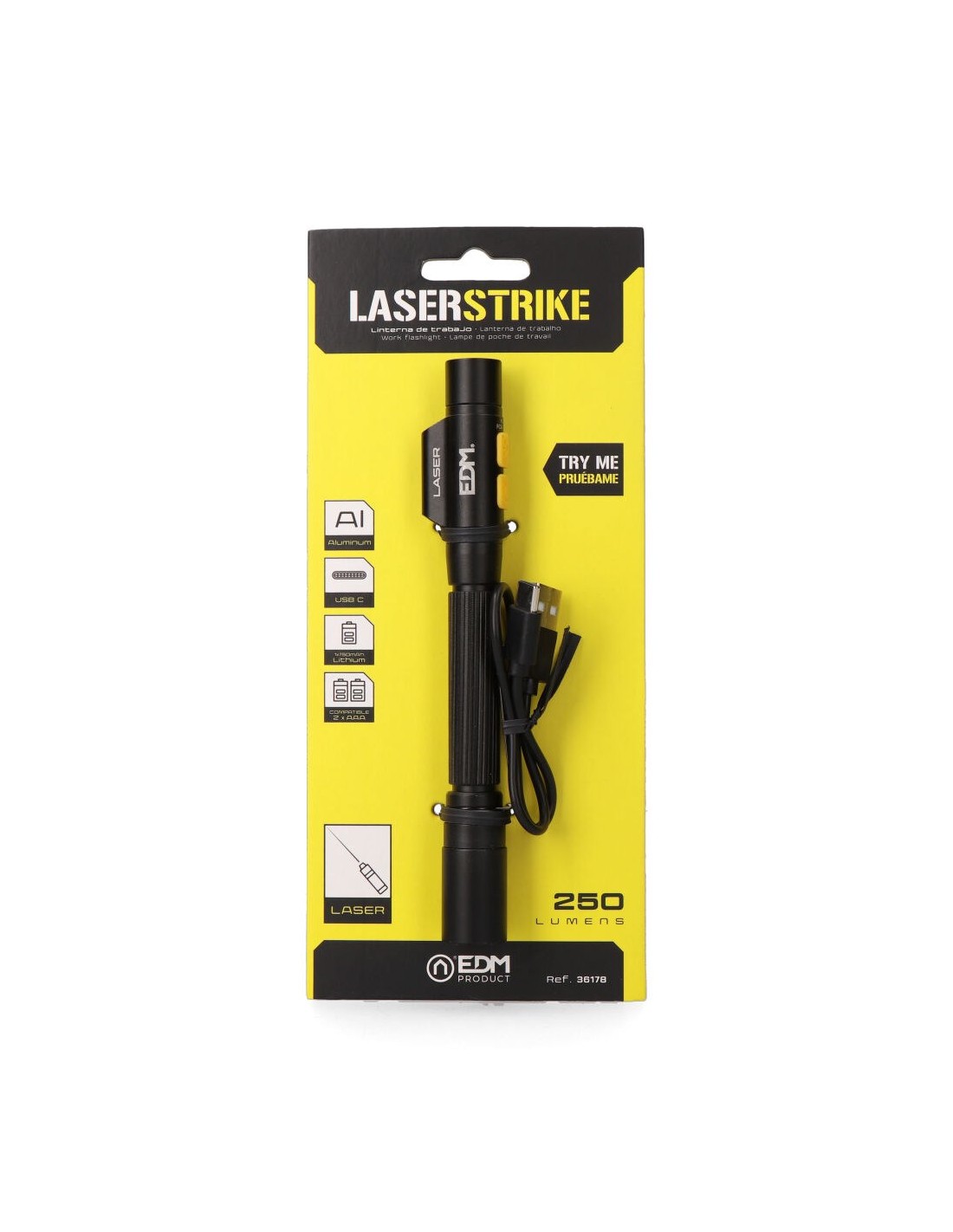 Linterna led y puntero láser, laserstrike, tipo pluma, recargable. led osram p8, láser rojo, 250 lm y 6500 k. potencia y batería: 5 w, batería 750 mah 10840, autonomía de 2 h a 250 lm, tiempo de carga 2 h, compatible con pilas 2 x aaa. fabricada en aluminio y silicona, medidas: ø20 x 27 x 167 mm. incluye cable usb-c