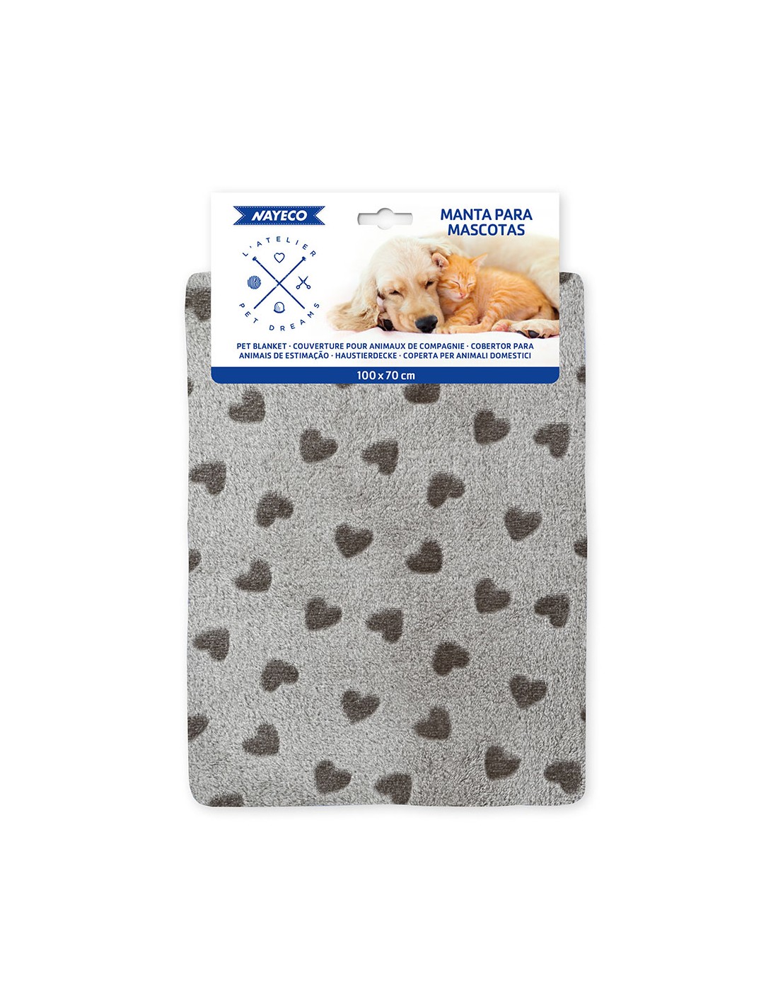 La manta gris con corazones marrones es una creación diseñada para mimar a tus queridas mascotas. dimensiones de 100 x 70 cm. textura suave