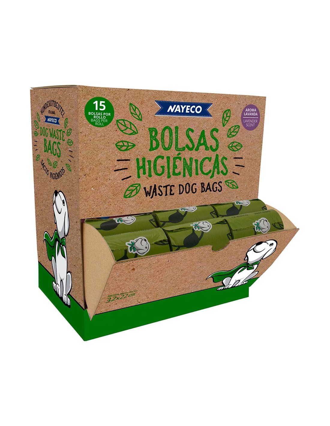 Expositor de 60 rollos de 15 bolsas higiénicas degradables con aroma lavanda, medida bolsa 32 x 22 cm
