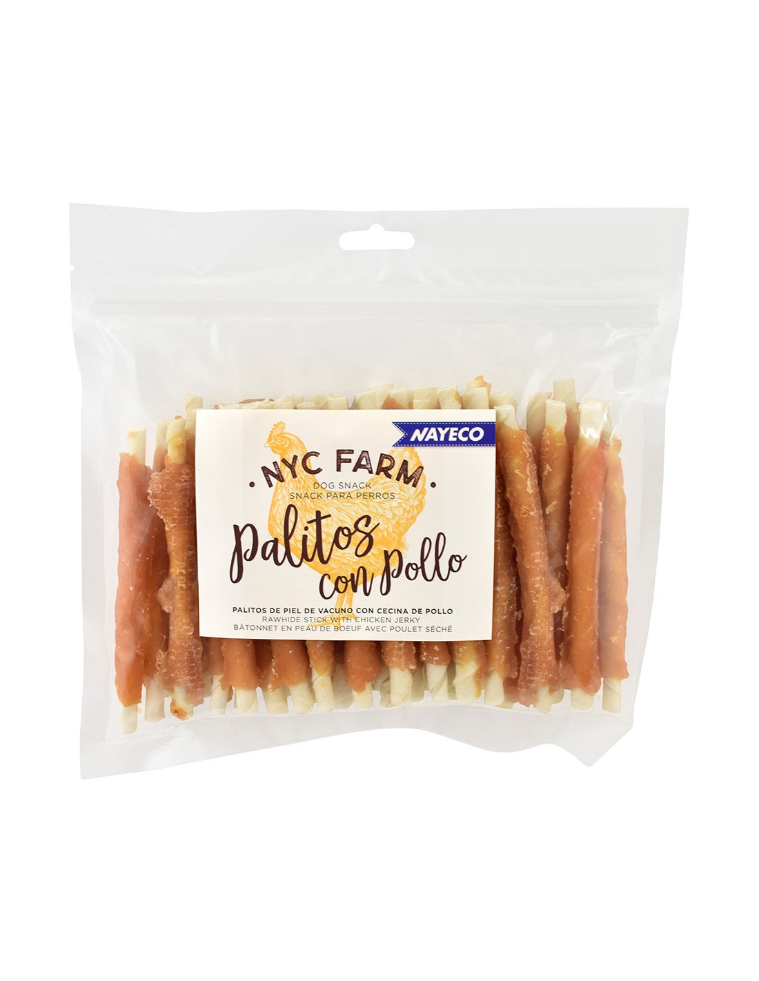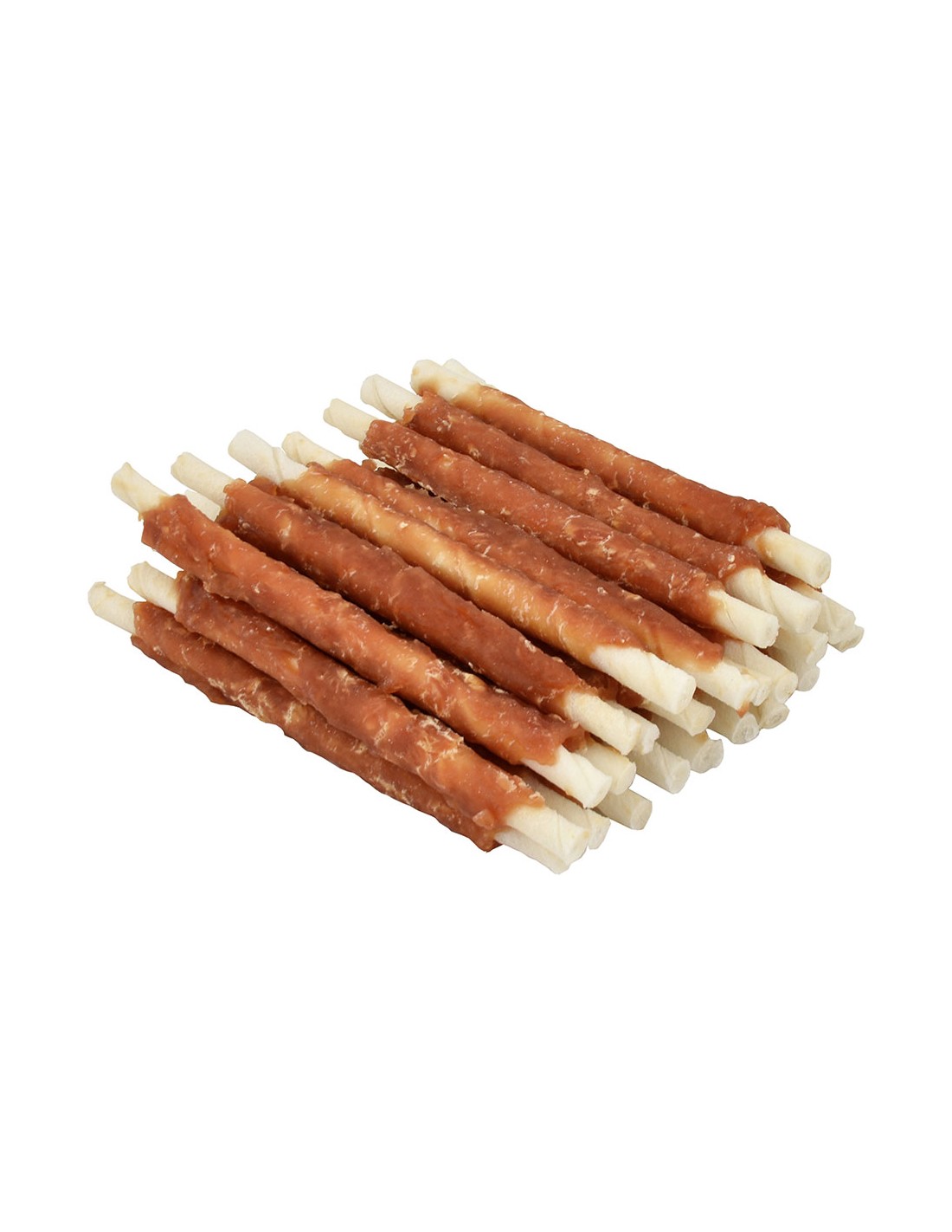 Palitos masticables de piel de vacuno y cecina de pollo para perros. estos deliciosos snacks hechos con ingredientes de alta calidad combinan la textura crujiente de un palito masticable con el sabor jugoso del pollo